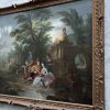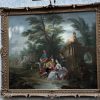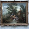 A romantic 18thC oil painting on canvas depicting two young couples in an idyllic landscape, the figures sitting by a stream beside a garden folly, their pets with them. The two men serenade the women with their stringed instruments. The subject matter and style of painting was common throughout the 18thC in France/Europe and this painting bears strong resemblance to works of the French painter Pater. (Jean-Baptiste Joseph Pater, (French, Valenciennes 1695–1736 Paris). French circa 1730.