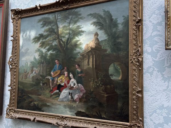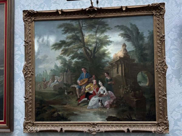A romantic 18thC oil painting on canvas depicting two young couples in an idyllic landscape, the figures sitting by a stream beside a garden folly, their pets with them. The two men serenade the women with their stringed instruments. The subject matter and style of painting was common throughout the 18thC in France/Europe and this painting bears strong resemblance to works of the French painter Pater. (Jean-Baptiste Joseph Pater, (French, Valenciennes 1695–1736 Paris). French circa 1730.