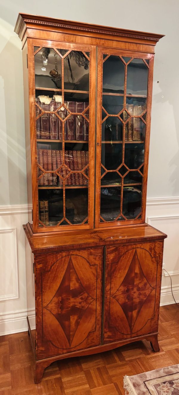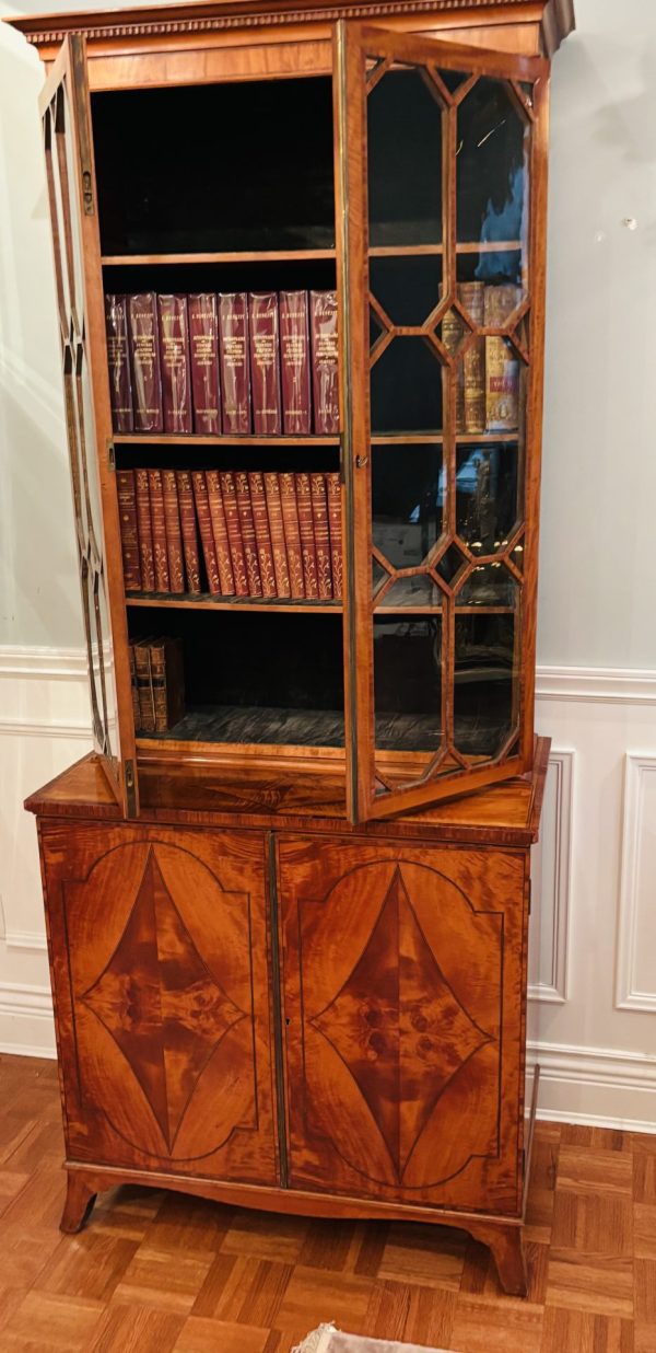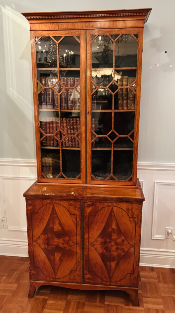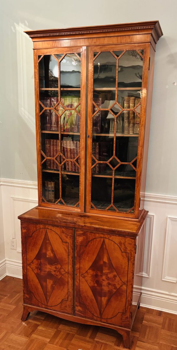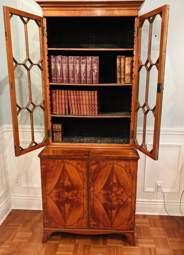 A fine and rare classic period Sheraton satinwood china cupboard or bookcase with finely book-matched veneers to the lower doors; English circa 1785.