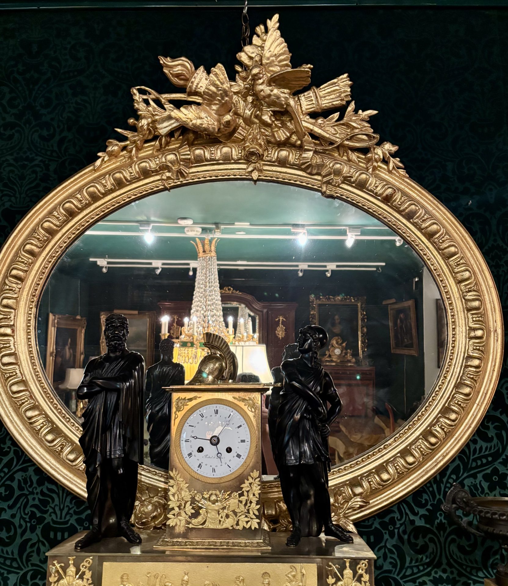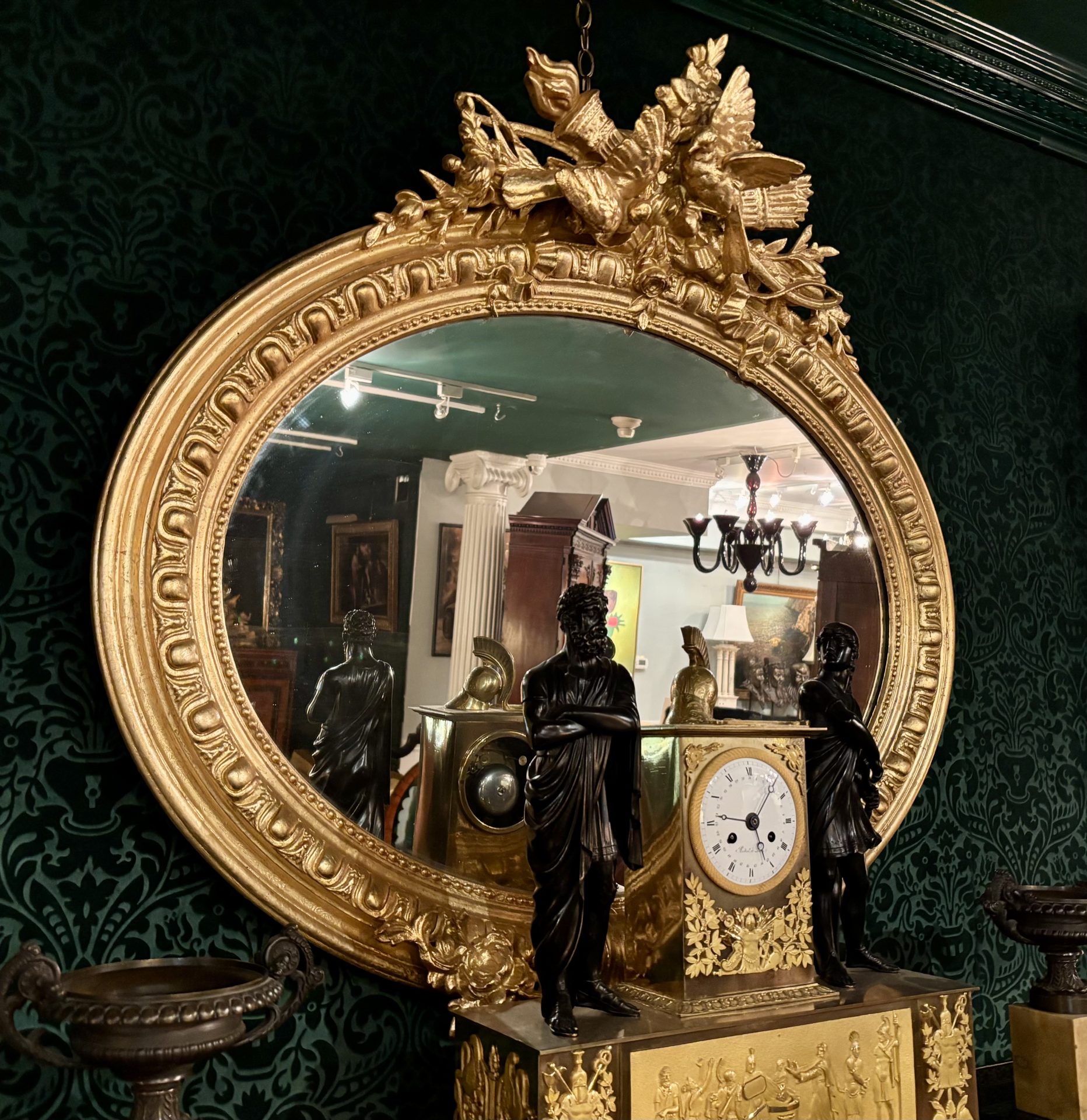 A beautifully carved gilt wood framed oval mirror likely made in France circa 1840. The frame is carved with an egg and dart design alternating with convex fillets and an inner gilded beaded loop. The top the frame is decorated by a large cartouche featuring a pair of turtle doves backed by a bow, a quiver with arrows, a flaming torch, garlands, flowers and acorns. The corresponding bottom of the frame has a simpler cartouche centered around acanthus leaves bordered by roses other flowers and leaves. The frame has been regilded. The replaced mirror is backed by original wood inserts.