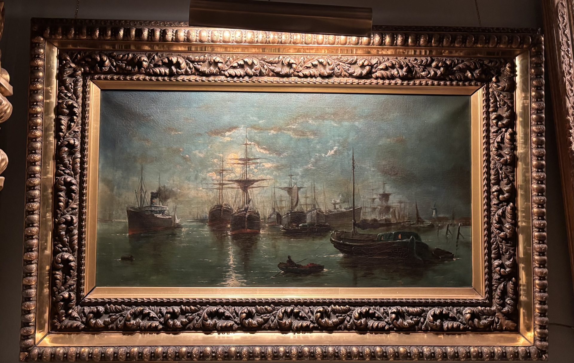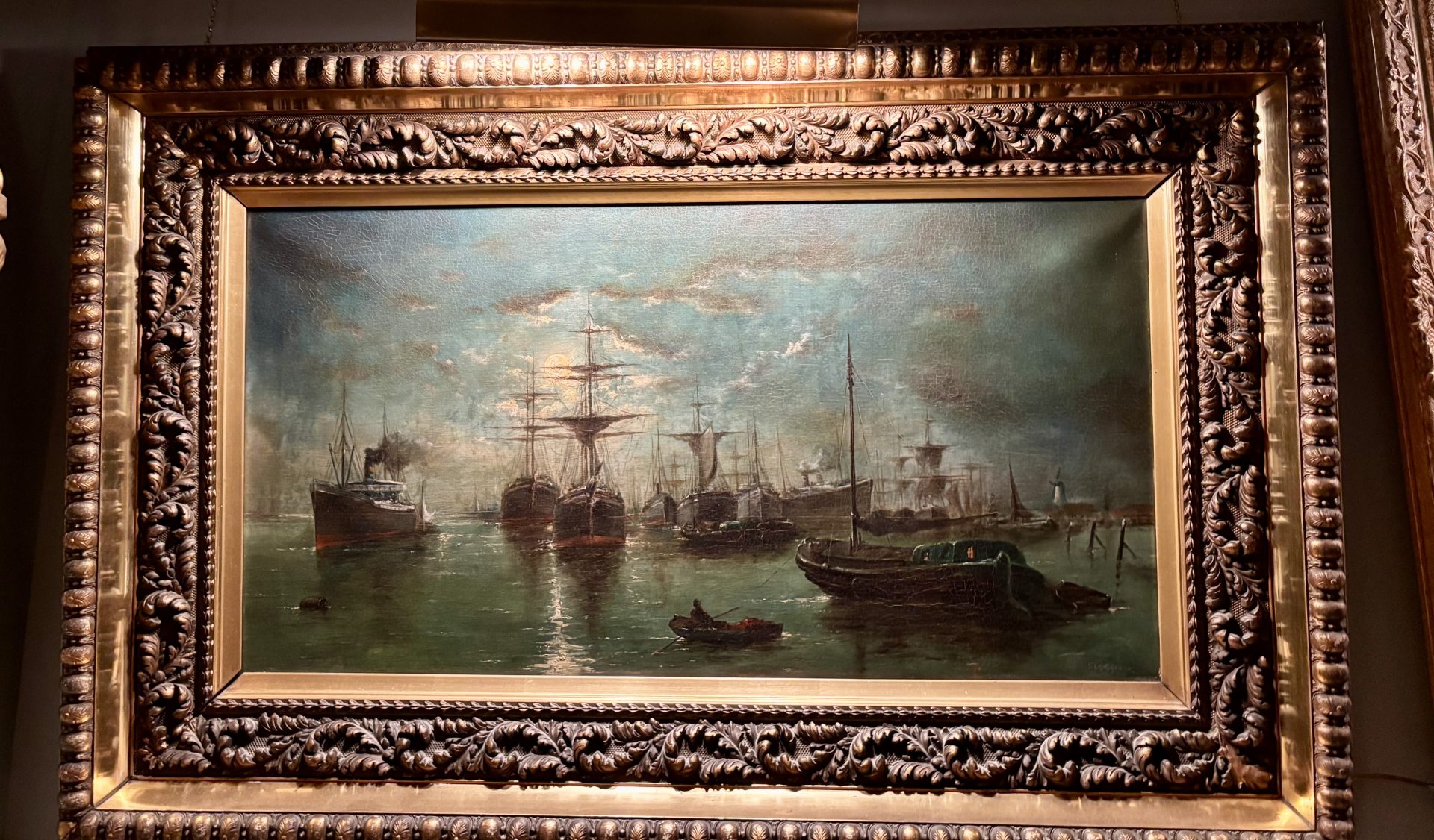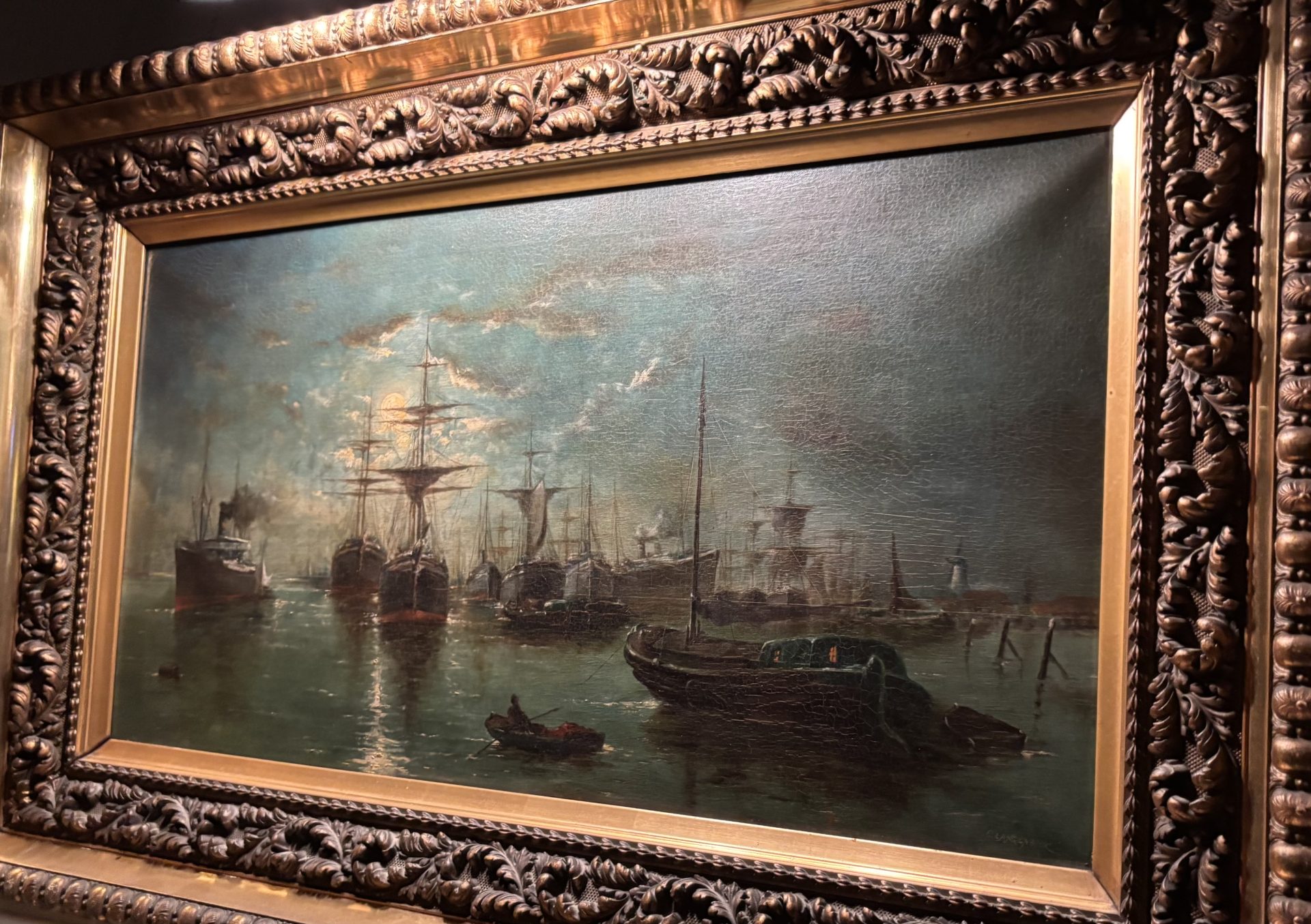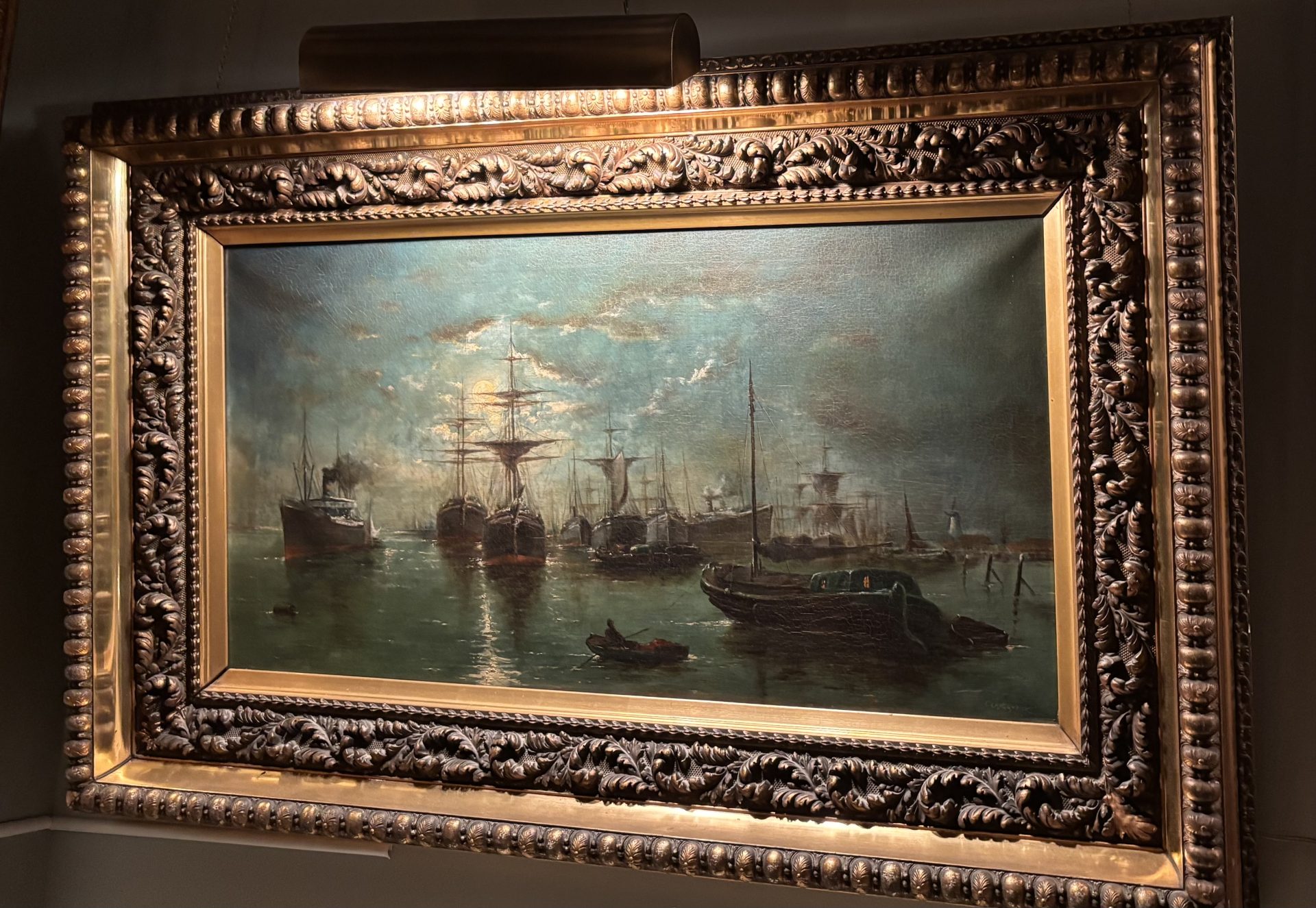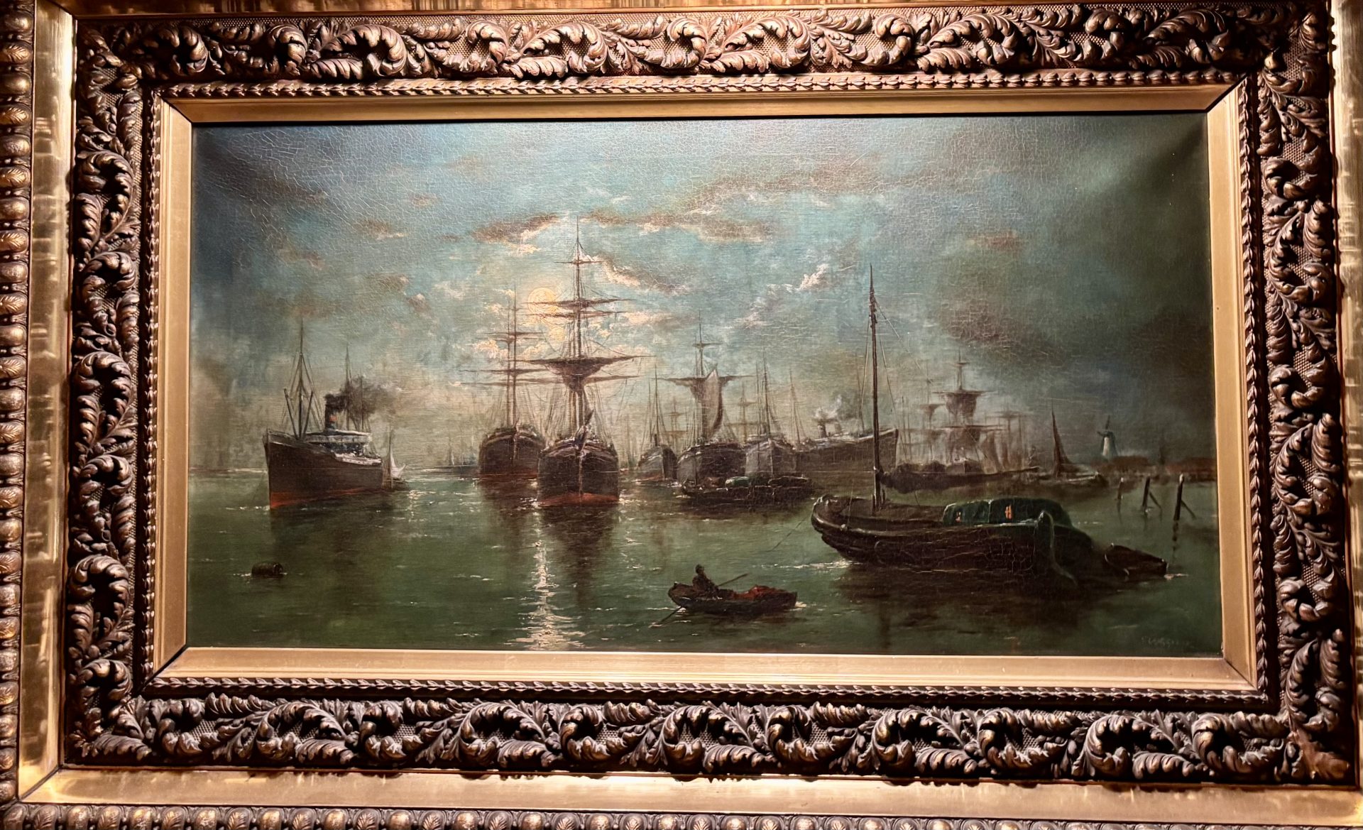 A beautifully executed early 20th Century oil on canvas signed C.Langenbeck (1873-1943) and dated 1906 is presented in a robust carved giltwood frame. The painting shows a flotilla of boats, sailing ships and even a steam ship anchored in a harbor under a moonlit partly cloudy sky. A windmill on the distant shoreline background is indicative that the scene may have been an actual harbor in Holland or Belgium. Unfortunately, and despite the quality of this work little is known about the life and works of the artist.