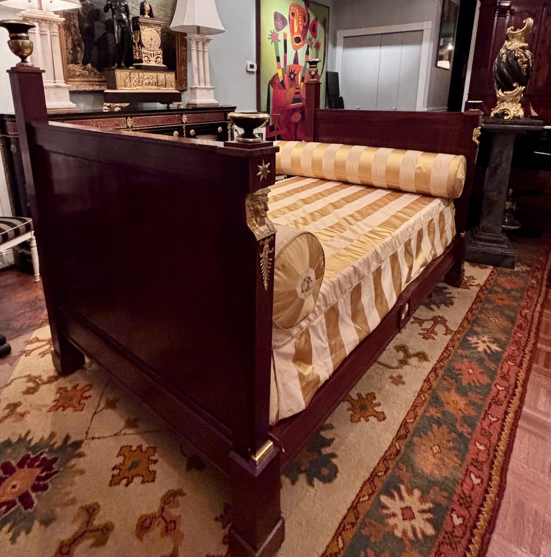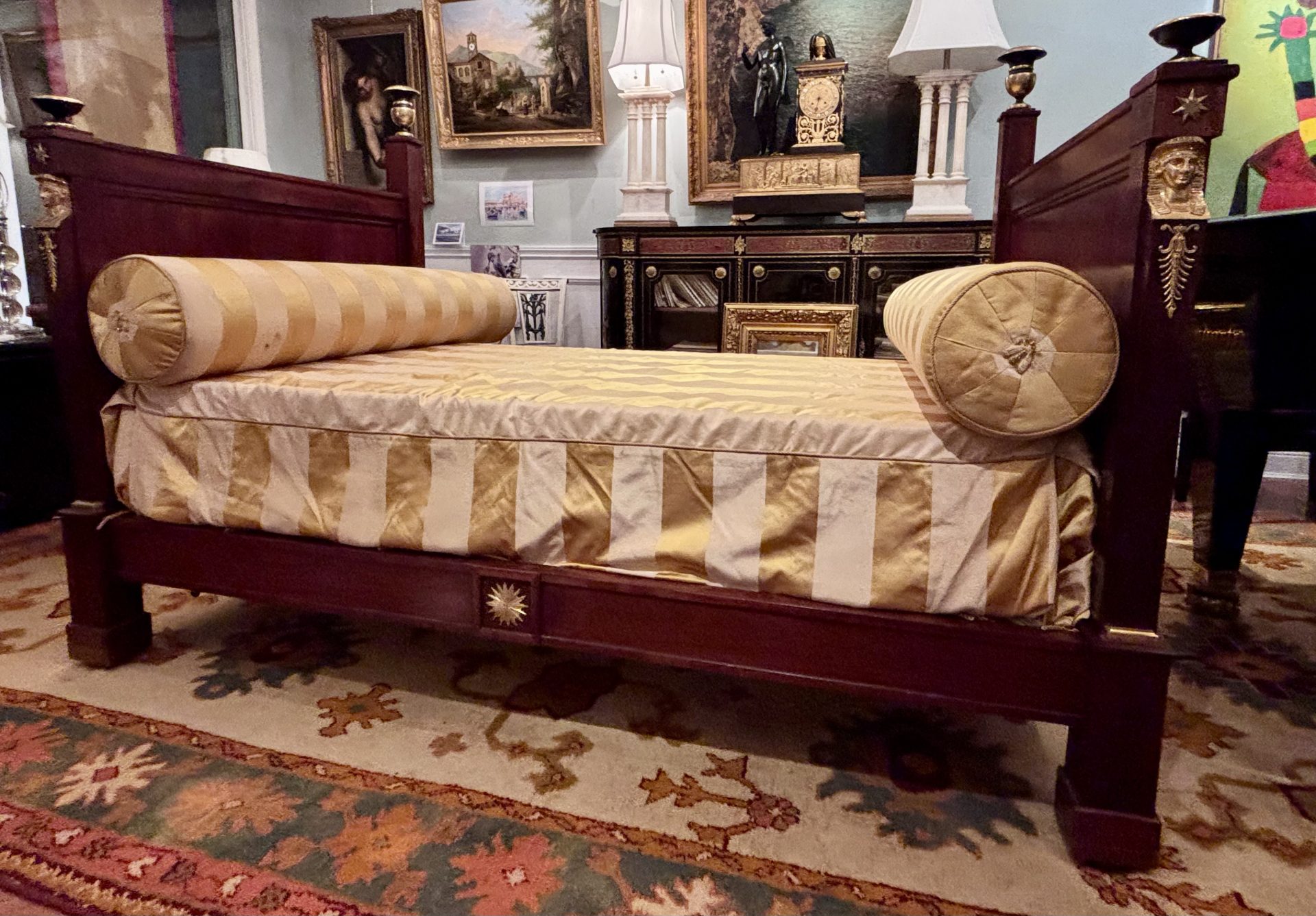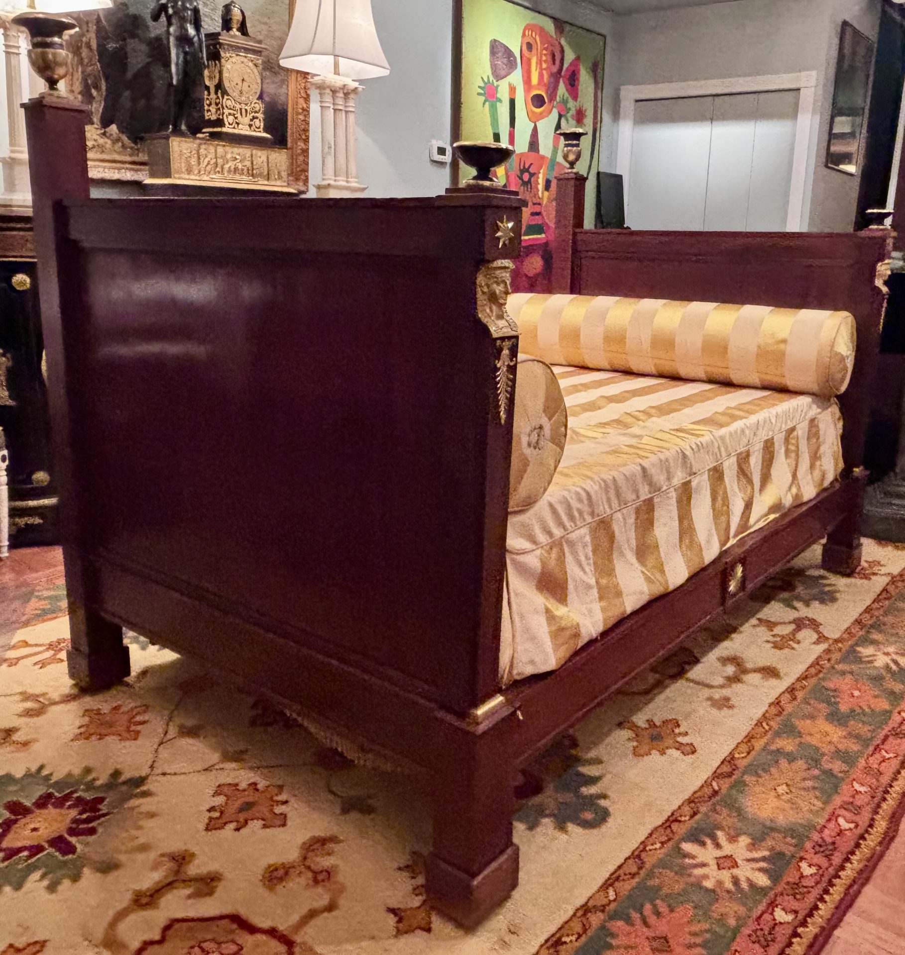 A classic French Empire period day bed made out of solid flamed mahogany raised on block feet and straight edge identical head and foot boards decorated with gilt bronze busts of Female Egyptian Heads emblematic of the Empire Period in general and Pierre Philippe Thomire in particular. Ebonized and gilt wood tazze and urns are featured at the four top corners of the foot and head boards.