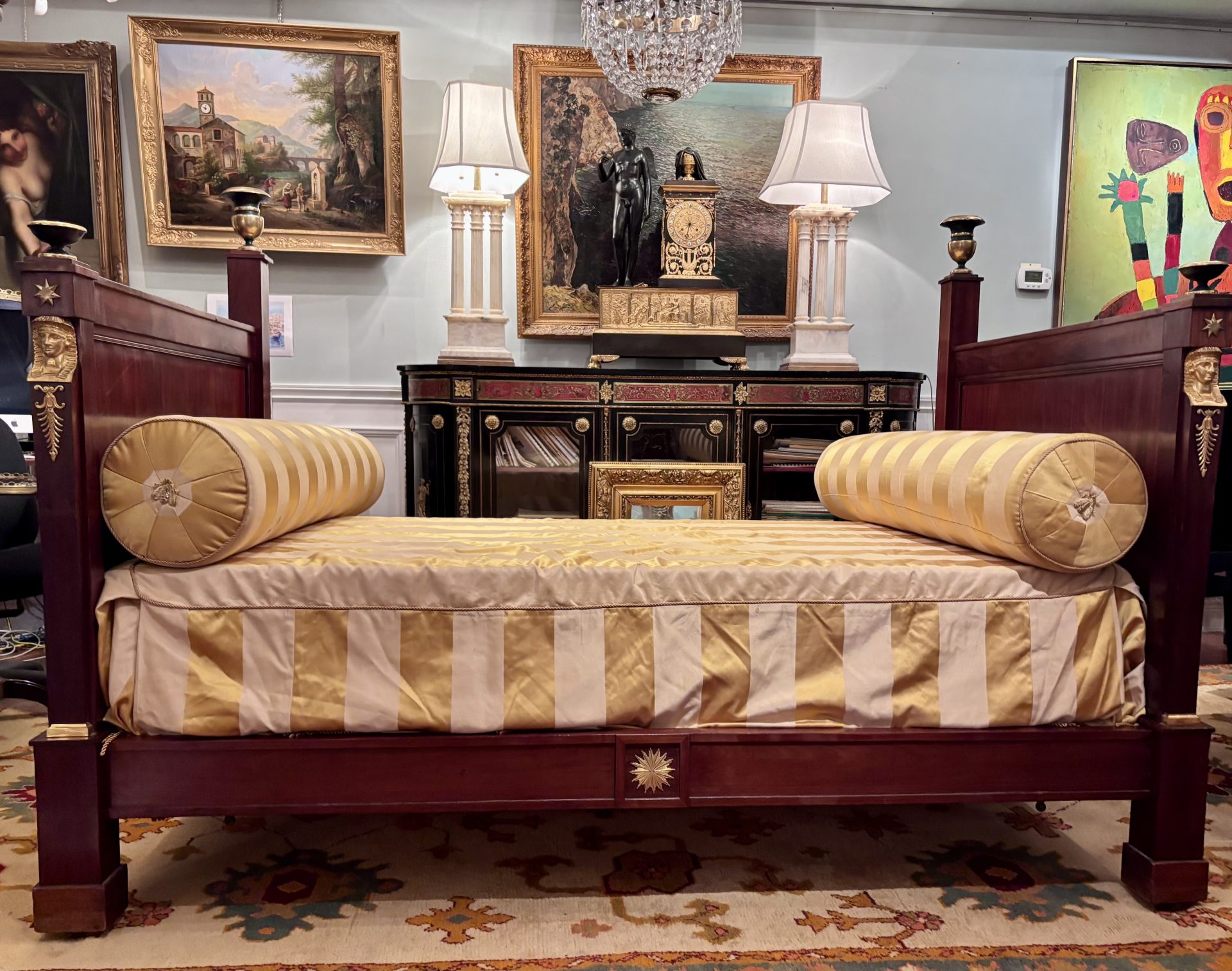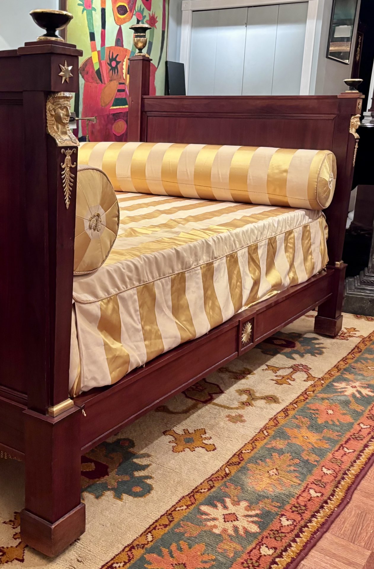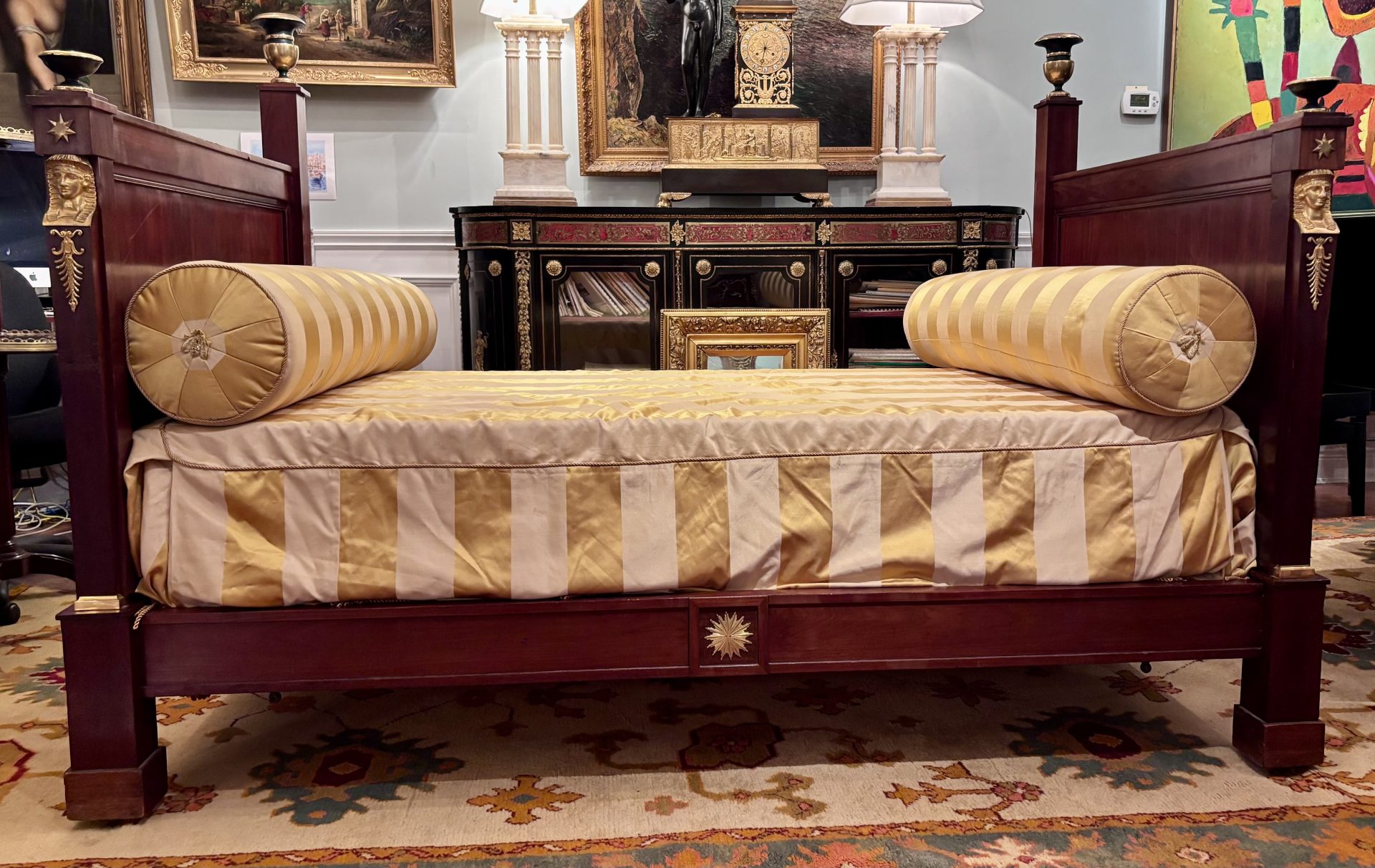 A classic French Empire period day bed made out of solid flamed mahogany raised on block feet and straight edge identical head and foot boards decorated with gilt bronze busts of Female Egyptian Heads emblematic of the Empire Period in general and Pierre Philippe Thomire in particular. Ebonized and gilt wood tazze and urns are featured at the four top corners of the foot and head boards.