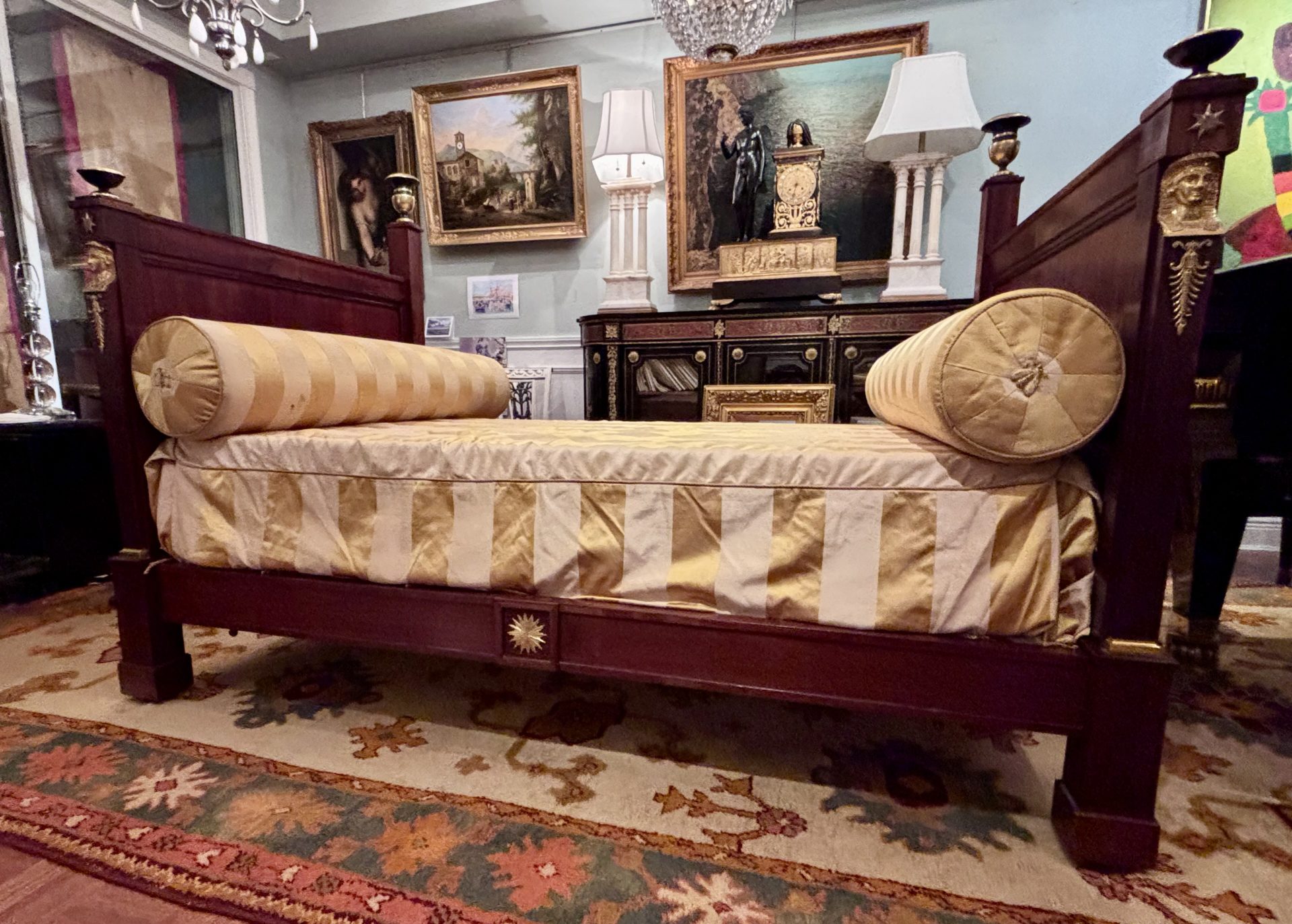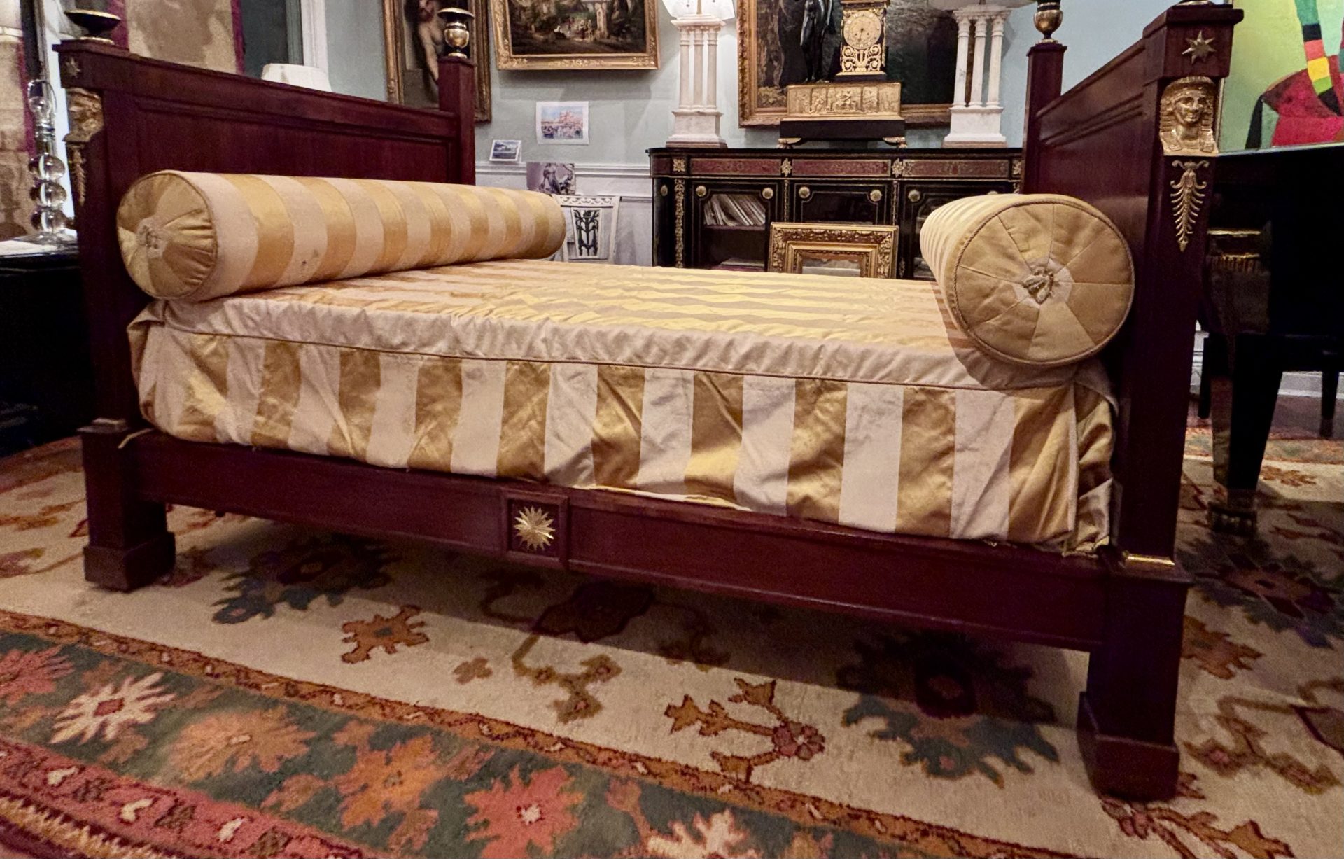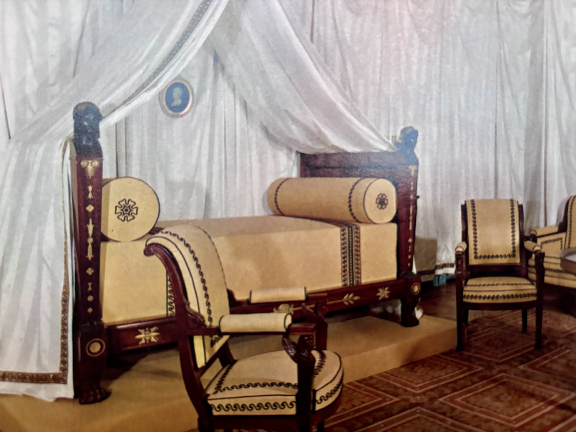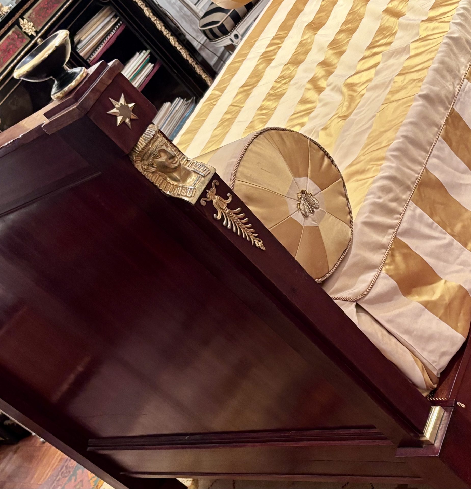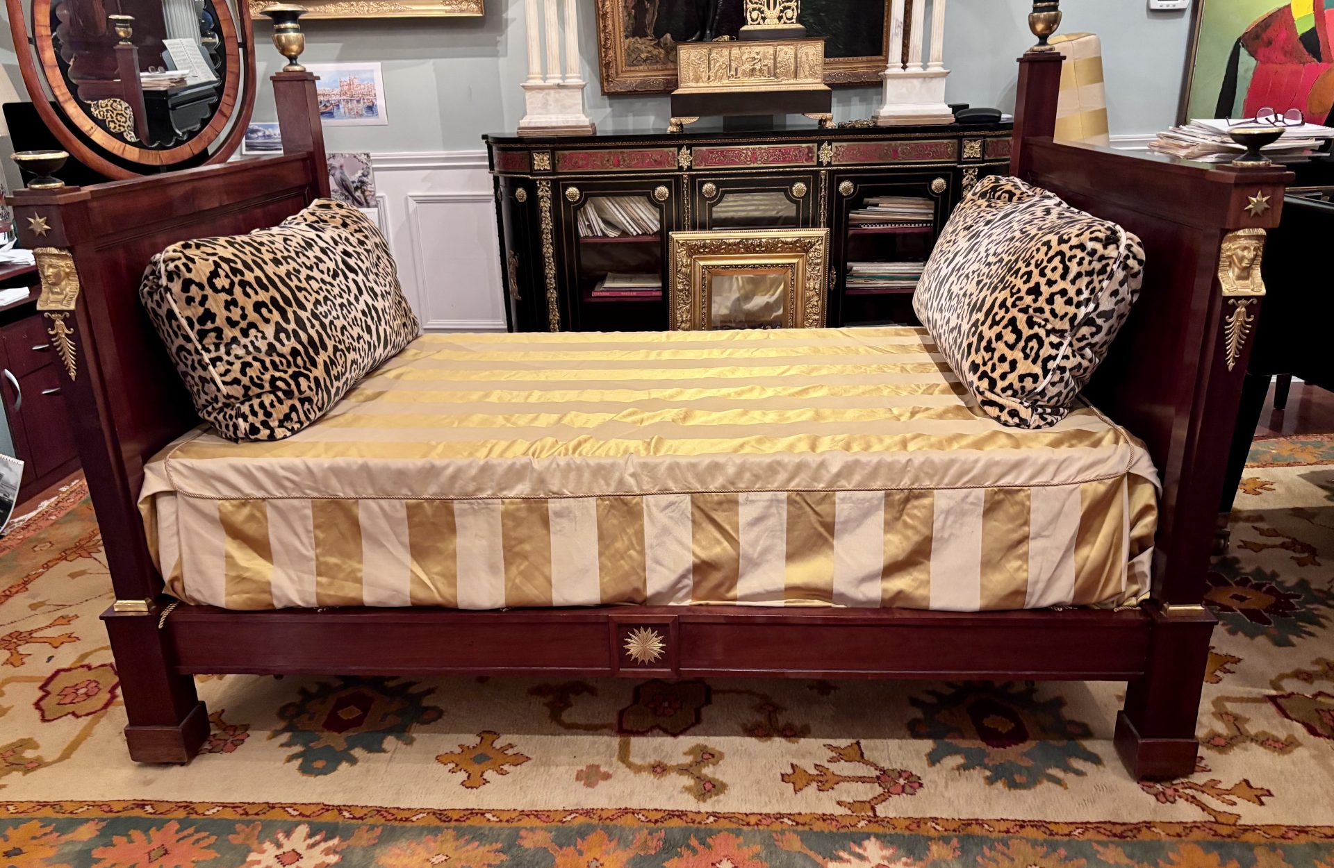 Examples of almost identical beds are displayed in one of Napoleon’s bedrooms at Malmaison and in another bedroom dedicated to the Empire Period at the Palace of Fontainbleu. Refer to last two photos in the photo gallery. France Circa 1810