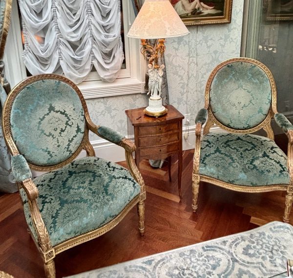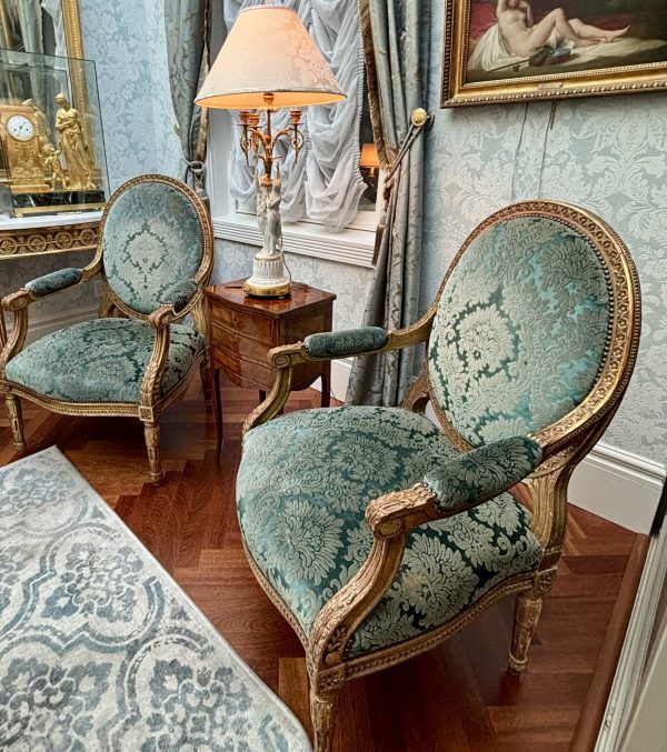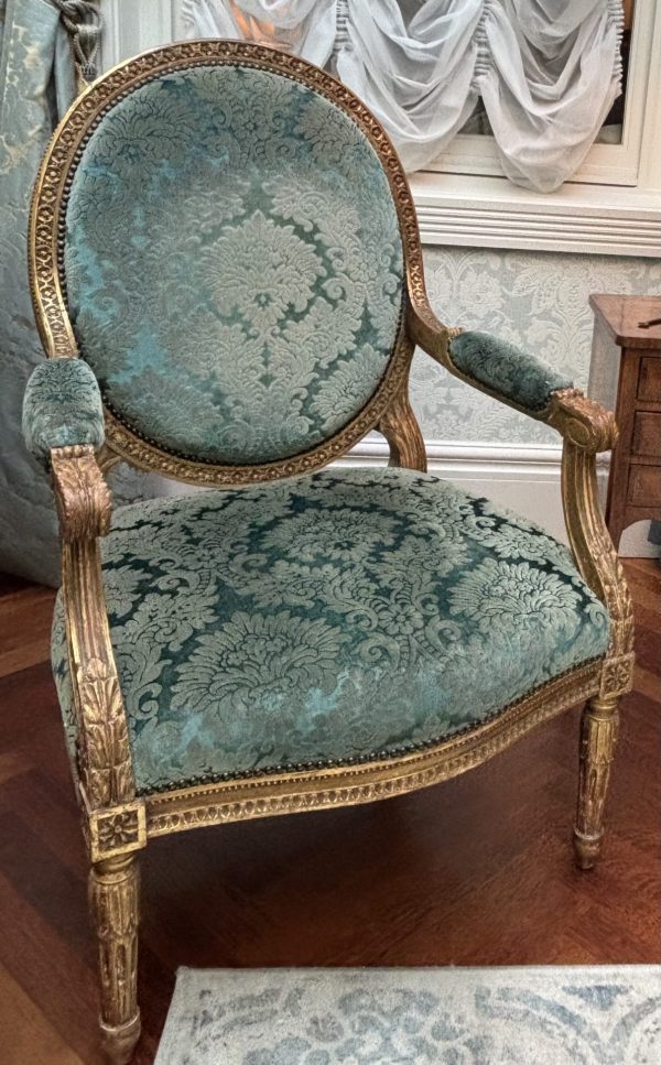 A very generous scale Louis XVI style salon set comprising four oval backed arm chairs and a sofa. The deeply carved frames are finished in gold leaf and are upholstered in antique turquoise Italian silk velvet, which would be unavailable today at almost any cost. Made in France in the last quarter of the 19thC circa 1880.