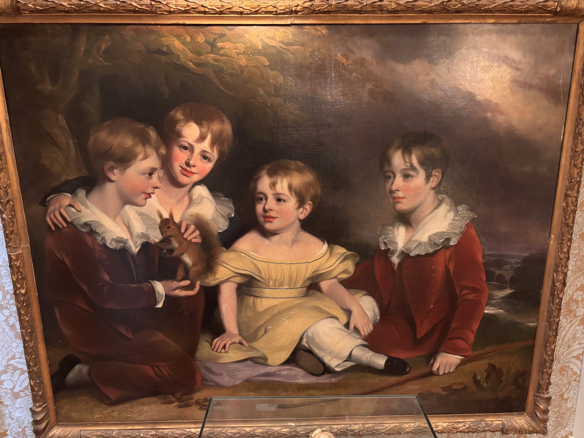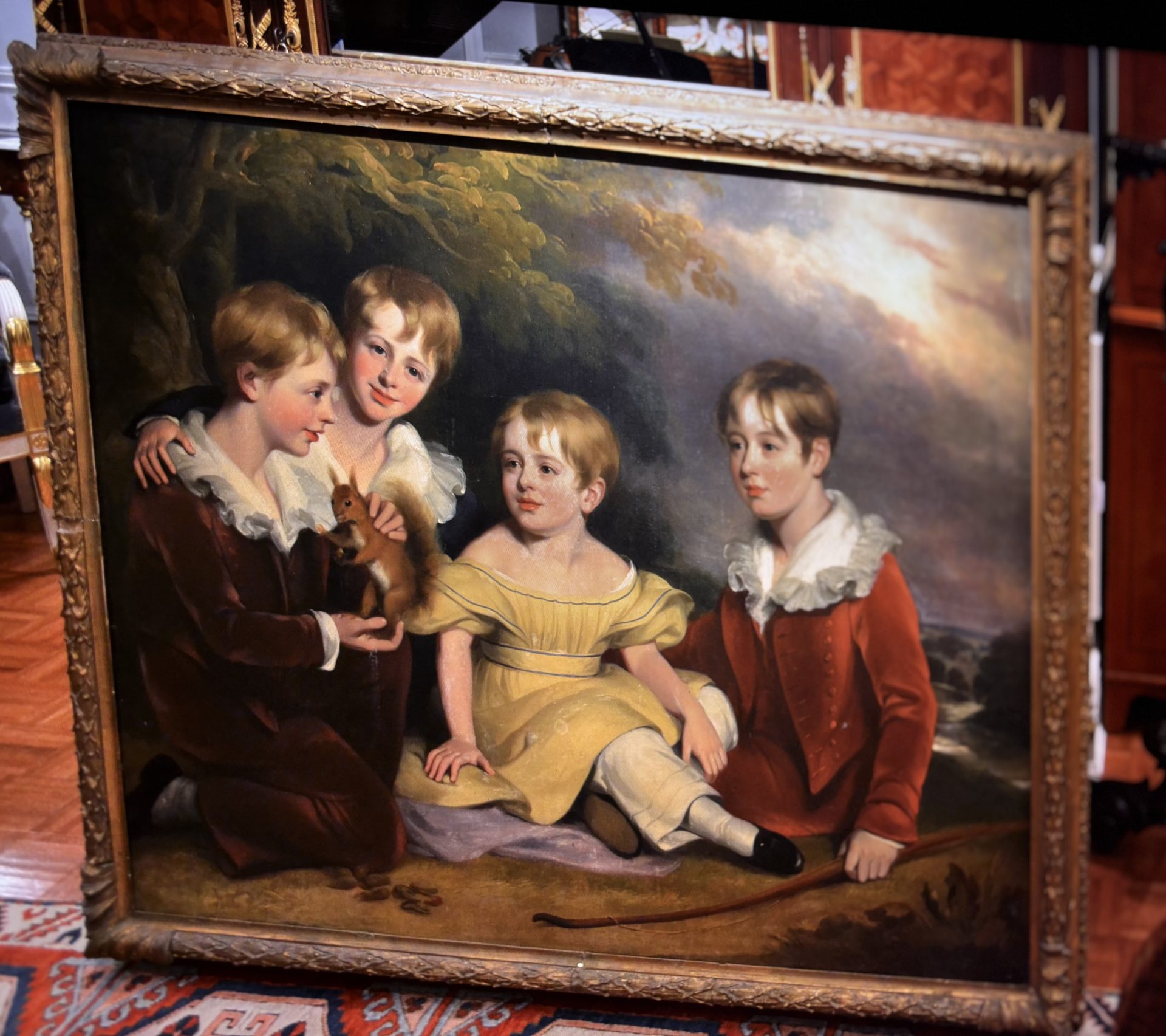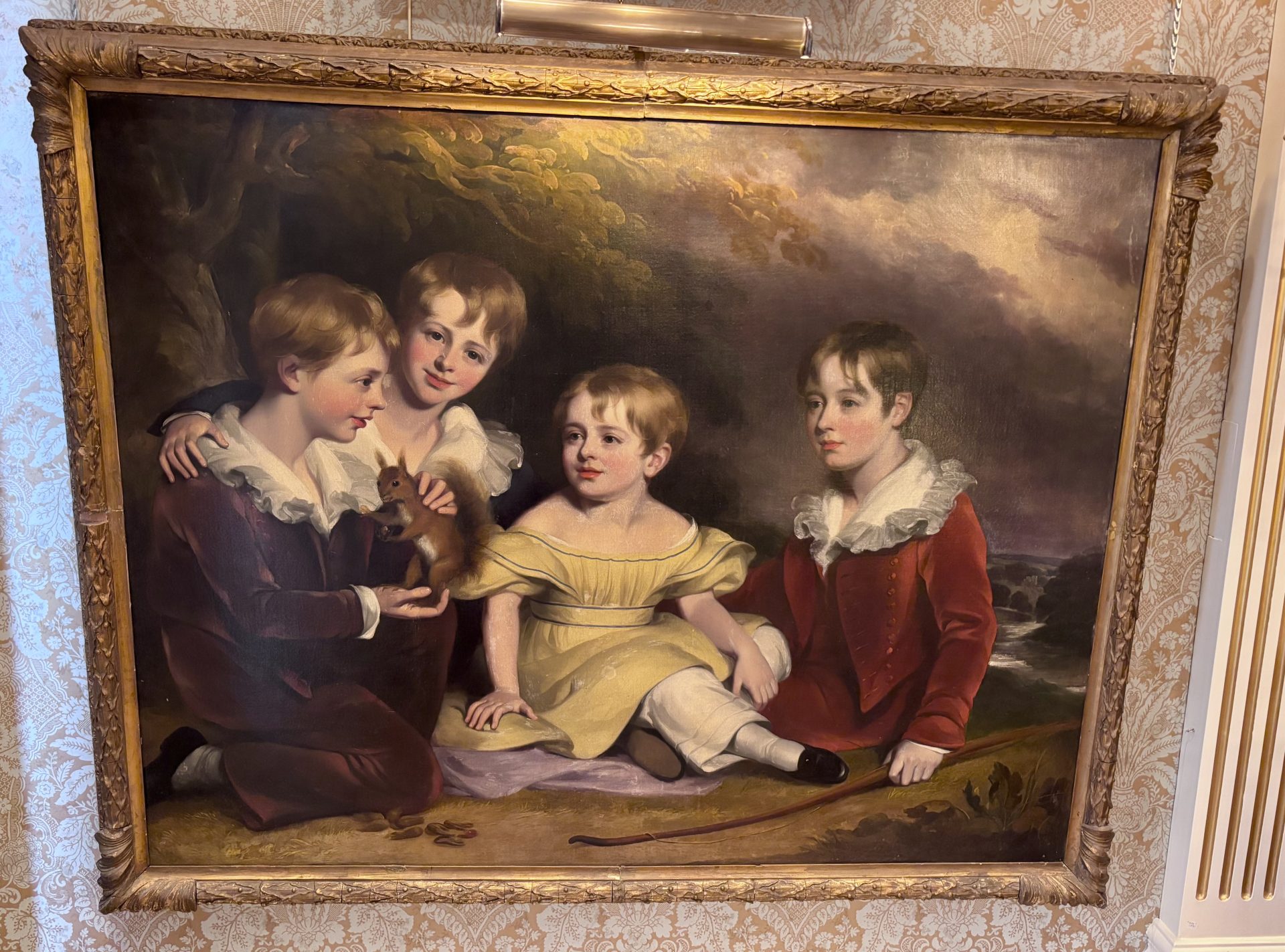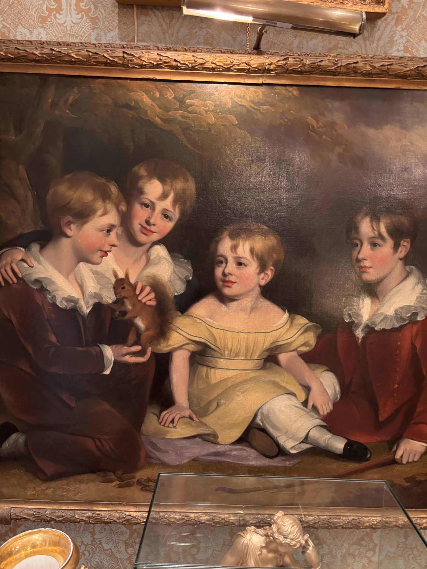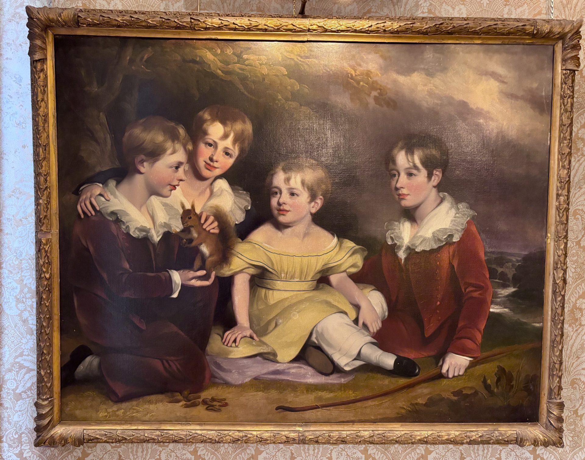 The paining which is presented in a carved giltwood period frame, is not signed but the artist appears to to have been influenced by the late 18 century portraiture of Henry Raeburn. One of the boys in the Red jacket bearsa striking resembvlance to a portrait of the Children of Professor Dugold Stewart held i the collection of the National Trust.