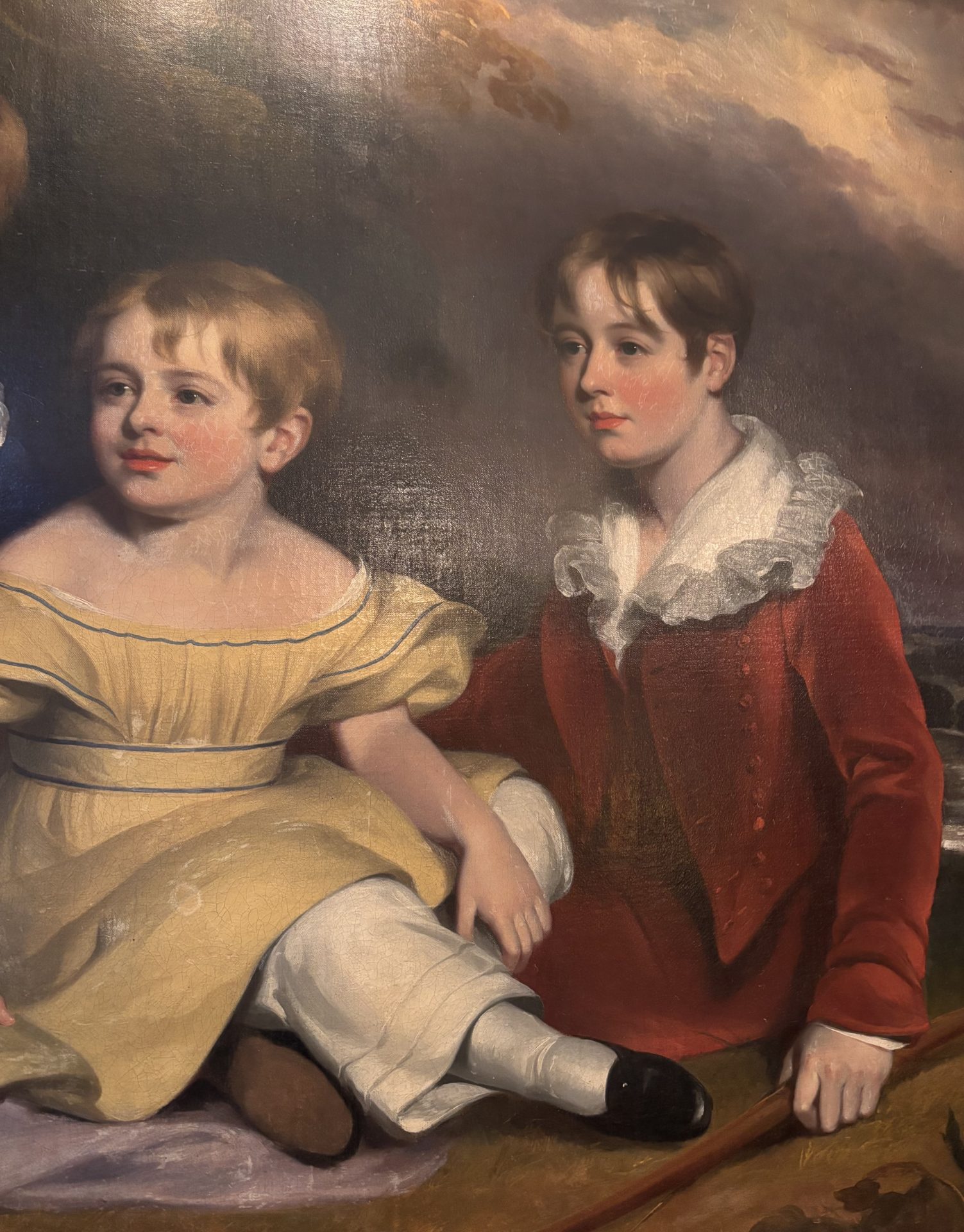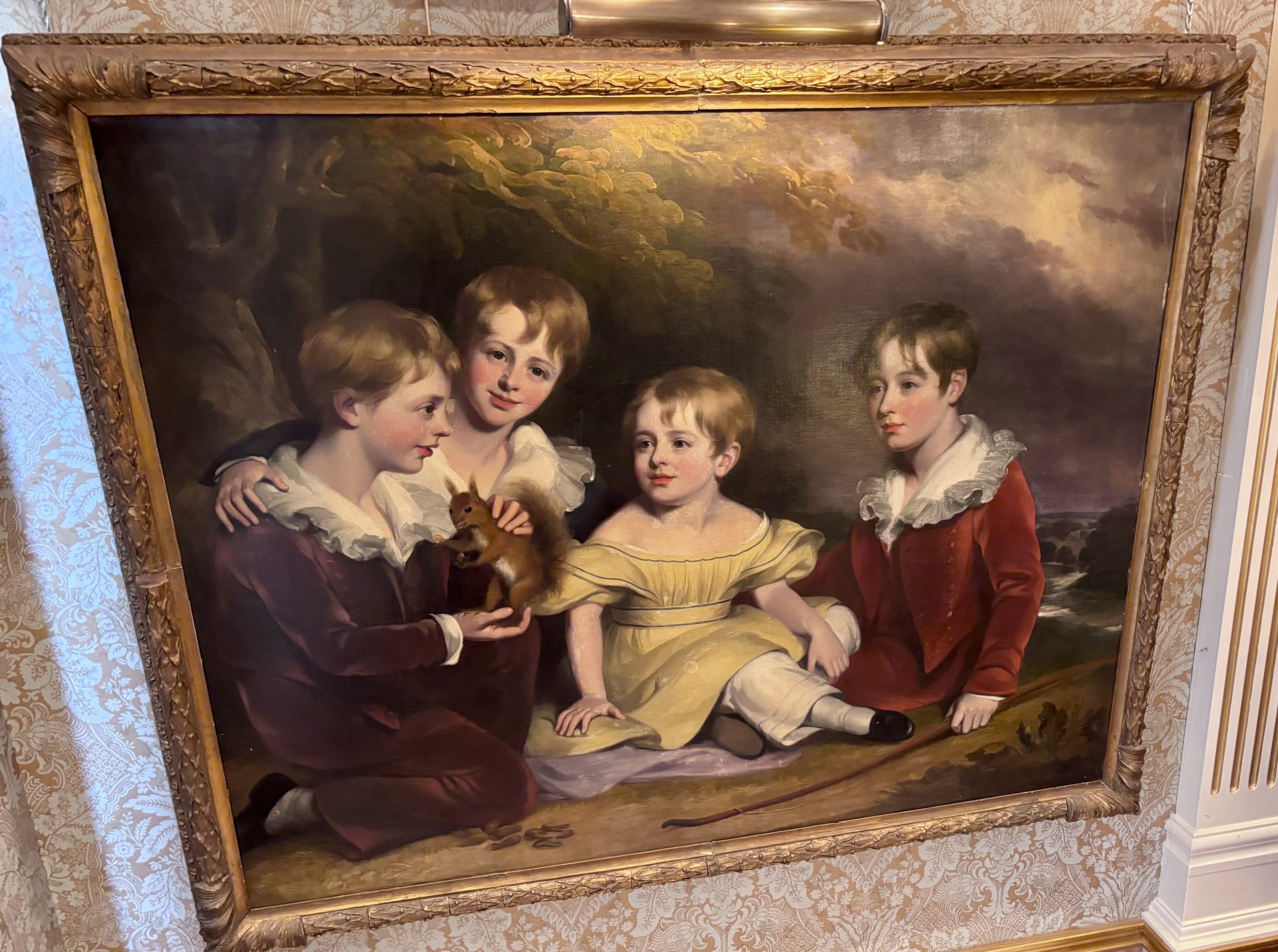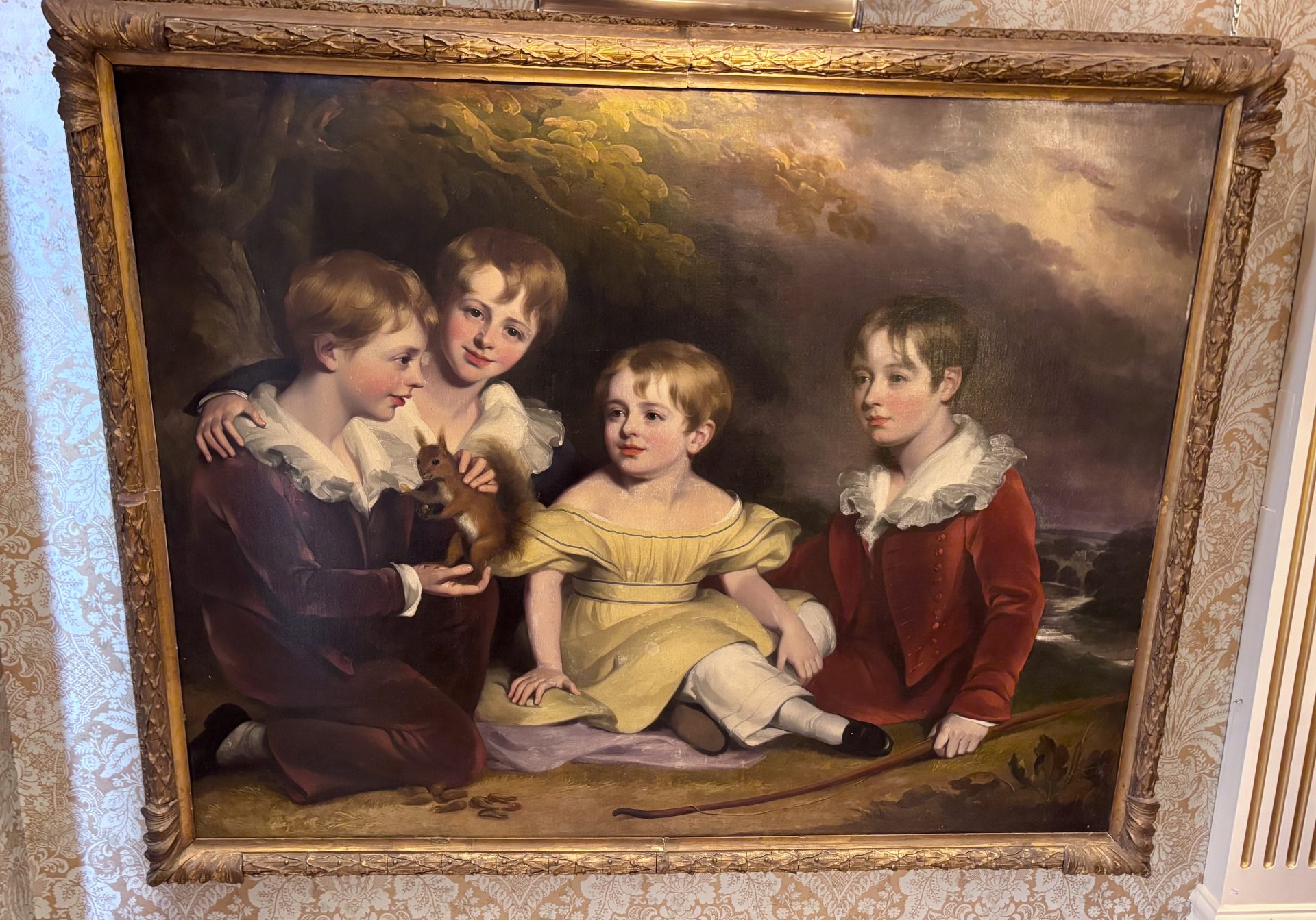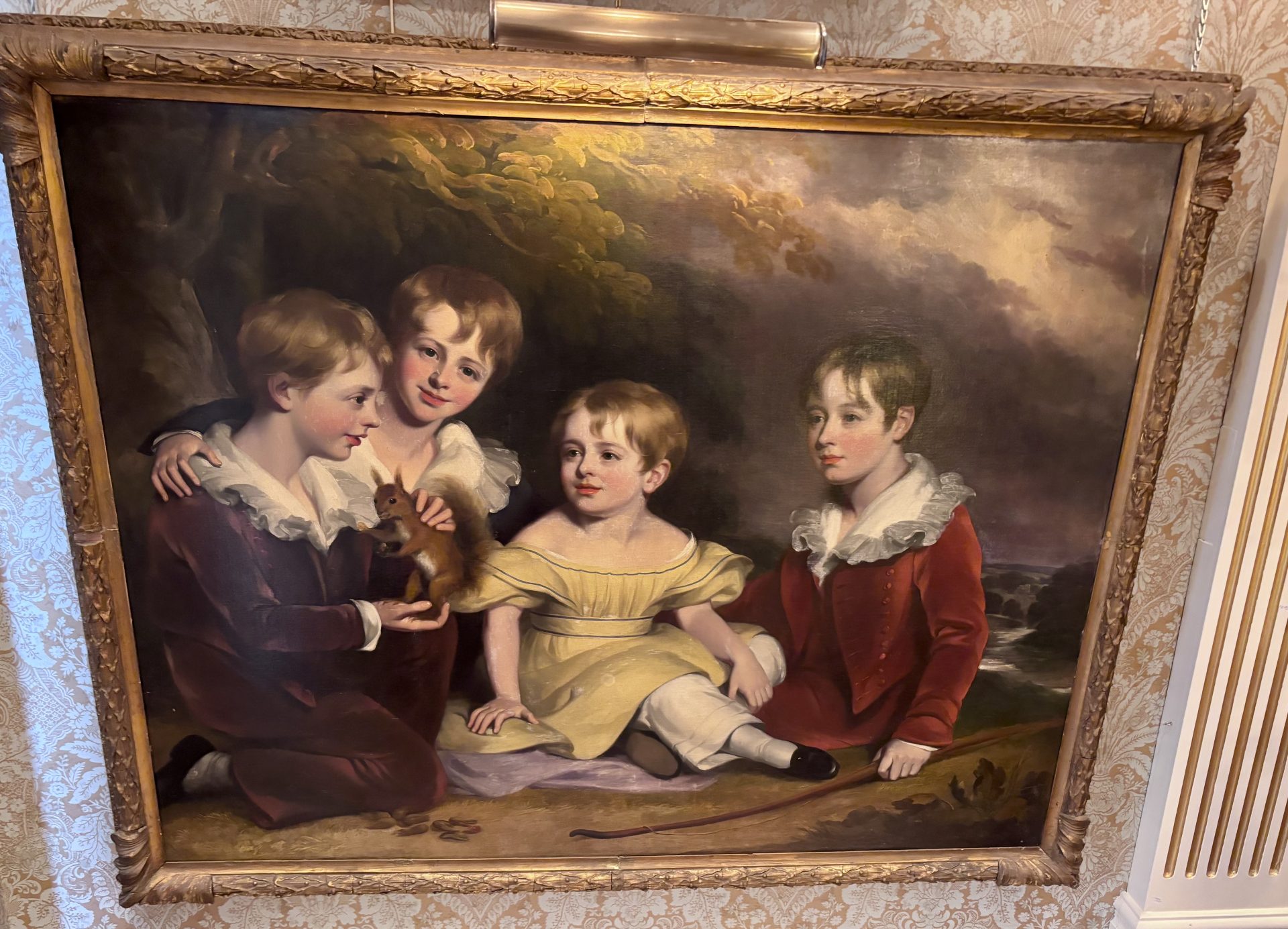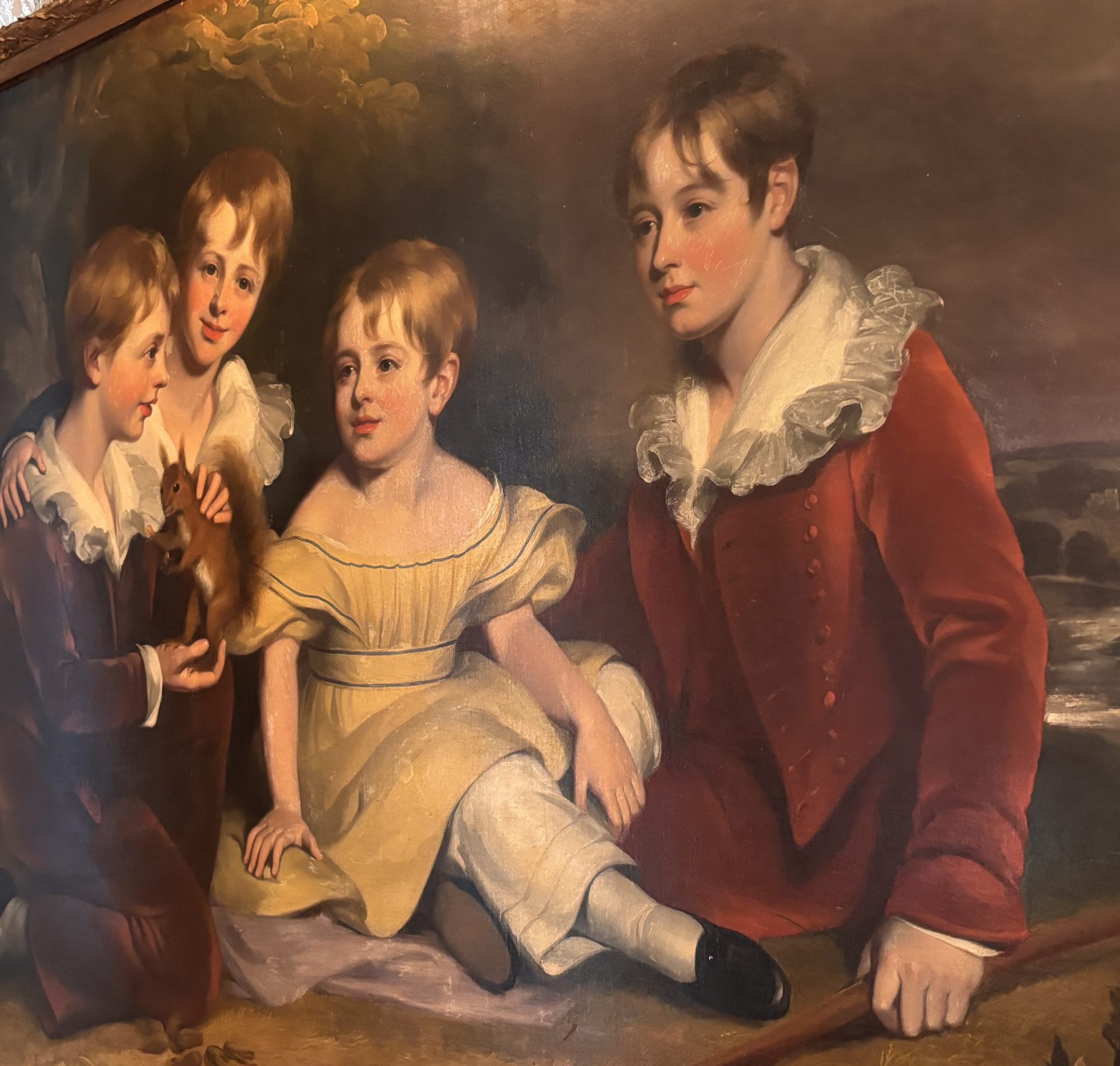 The paining which is presented in a carved giltwood period frame, is not signed but the artist appears to to have been influenced by the late 18 century portraiture of Henry Raeburn. One of the boys in the Red jacket bearsa striking resembvlance to a portrait of the Children of Professor Dugold Stewart held i the collection of the National Trust.