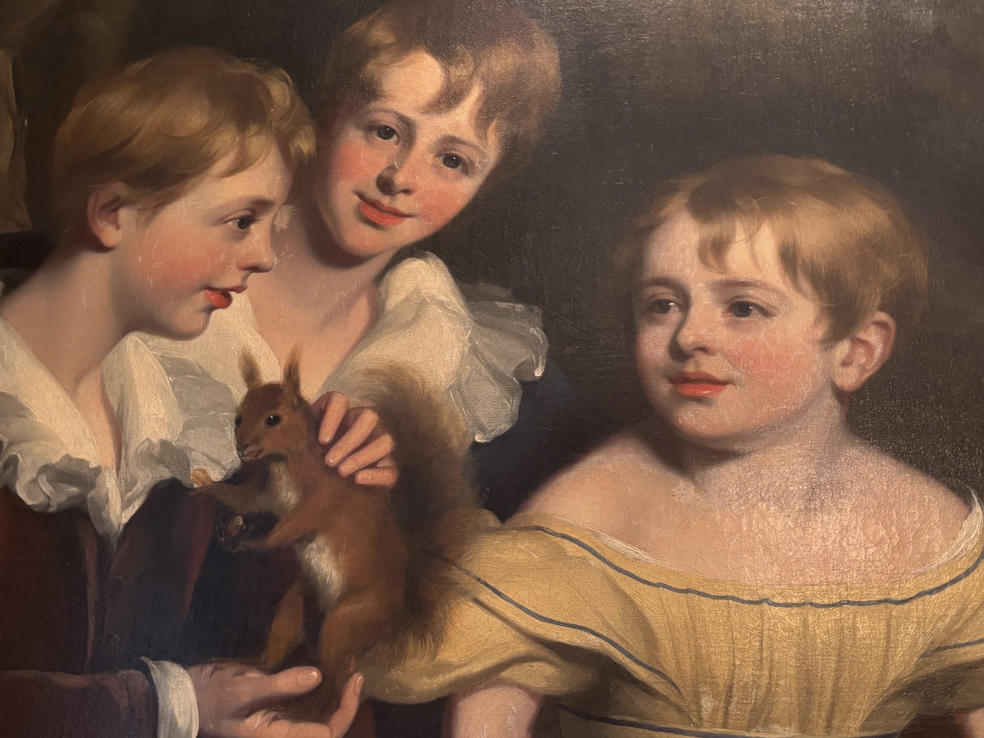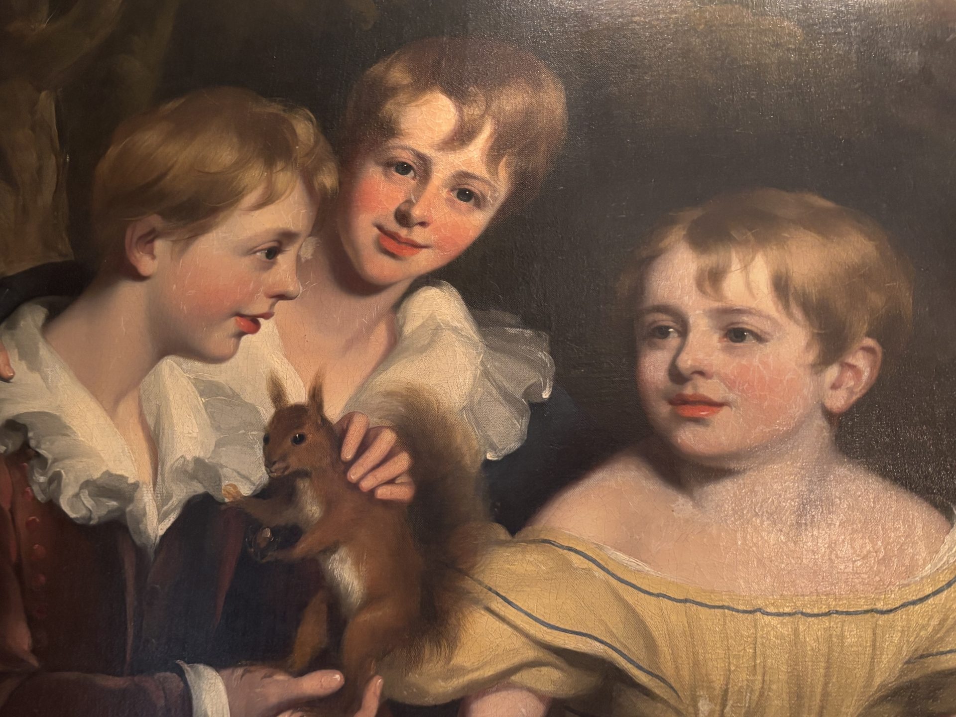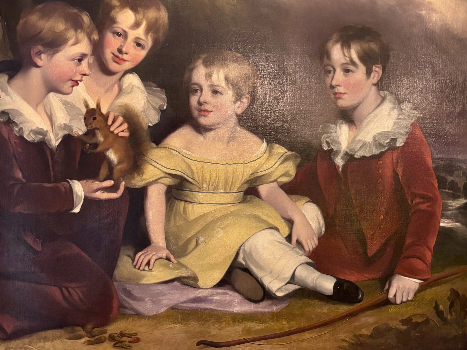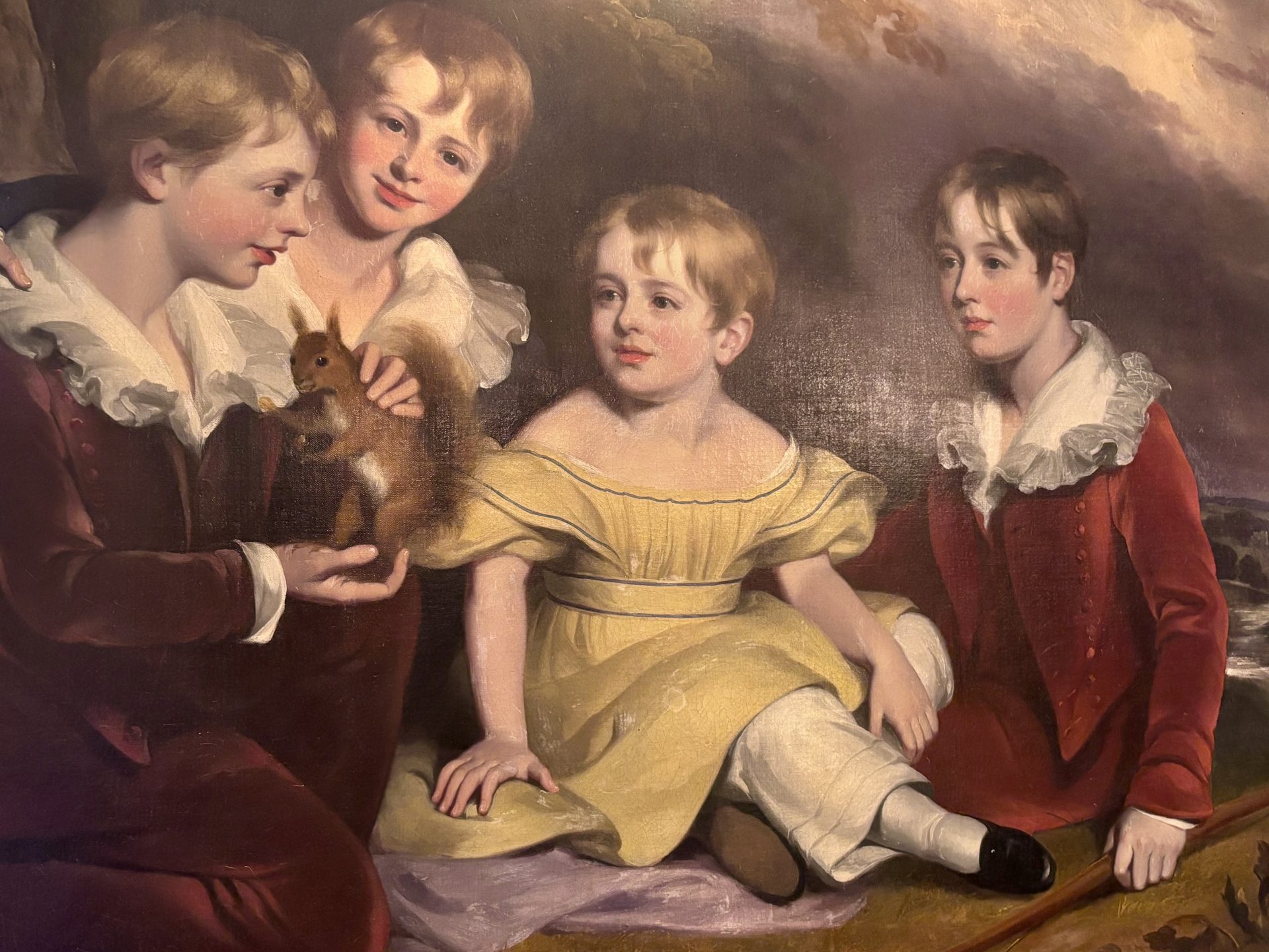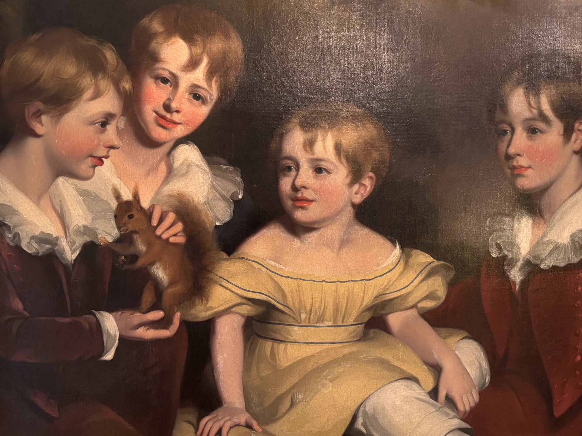 The paining which is presented in a carved giltwood period frame, is not signed but the artist appears to to have been influenced by the late 18 century portraiture of Henry Raeburn. One of the boys in the Red jacket bearsa striking resembvlance to a portrait of the Children of Professor Dugold Stewart held i the collection of the National Trust.