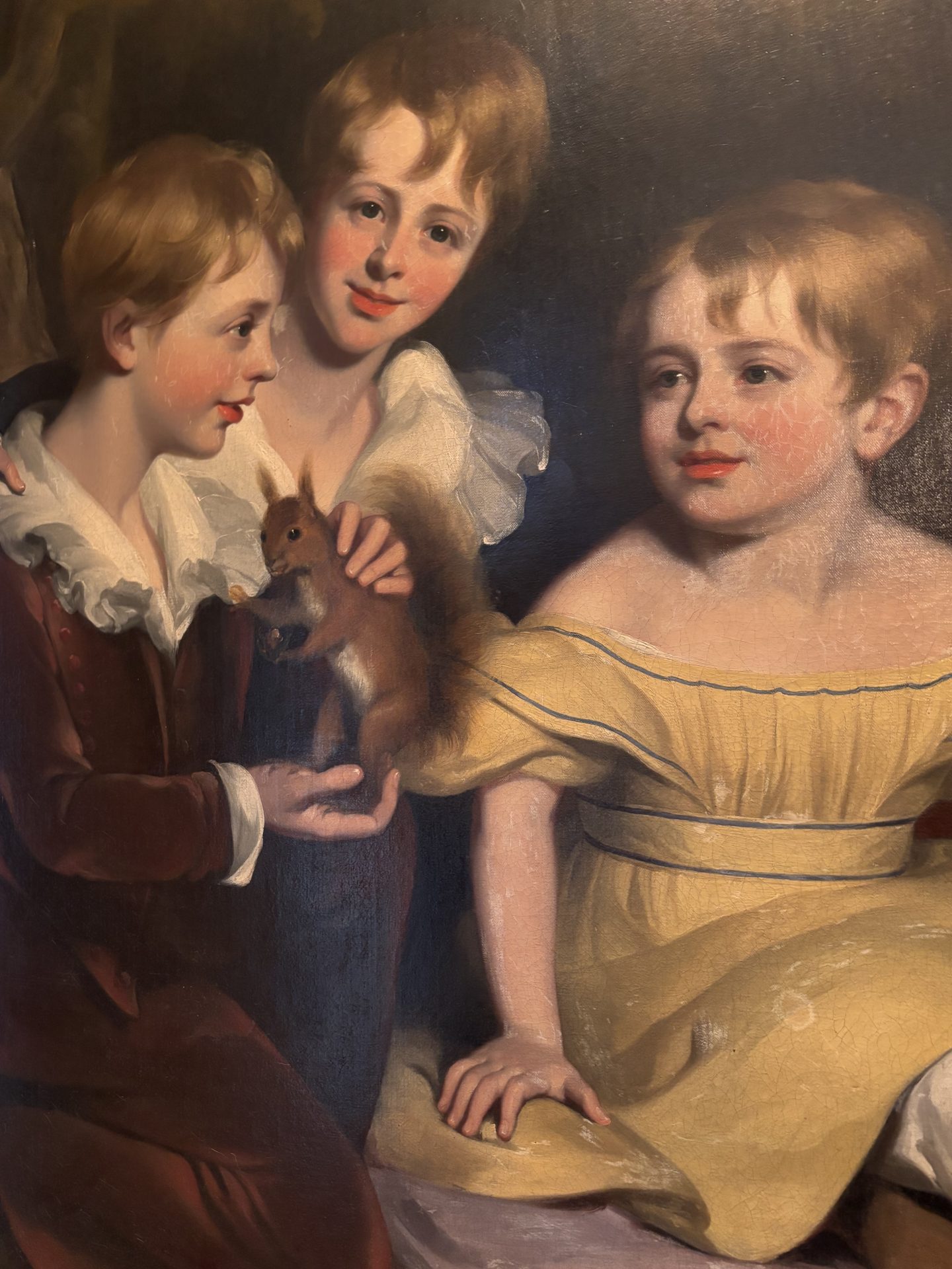 A large Museum quality Victorian family portrait of three kneeling or seated boys fondly gathered around a little baby girl toddler seated on a blanket in front of a bucolic landscape backdrop.. One of the boys is holding a standing squirrel in his hands to the obvious amusement of the other two boys and especially the toddler. .