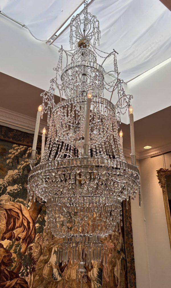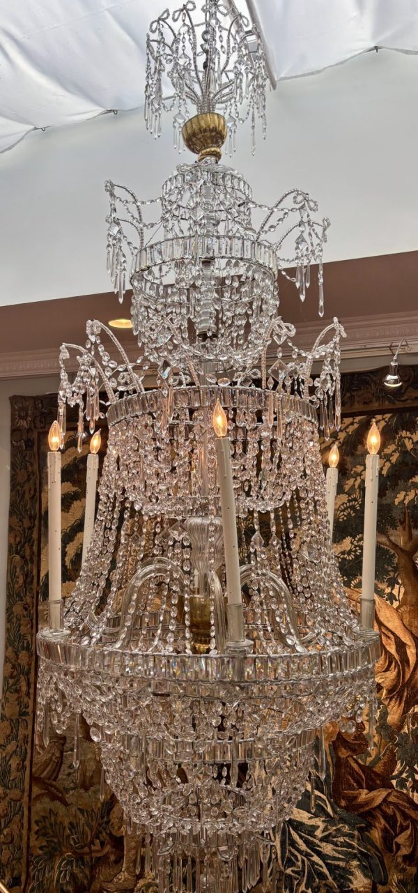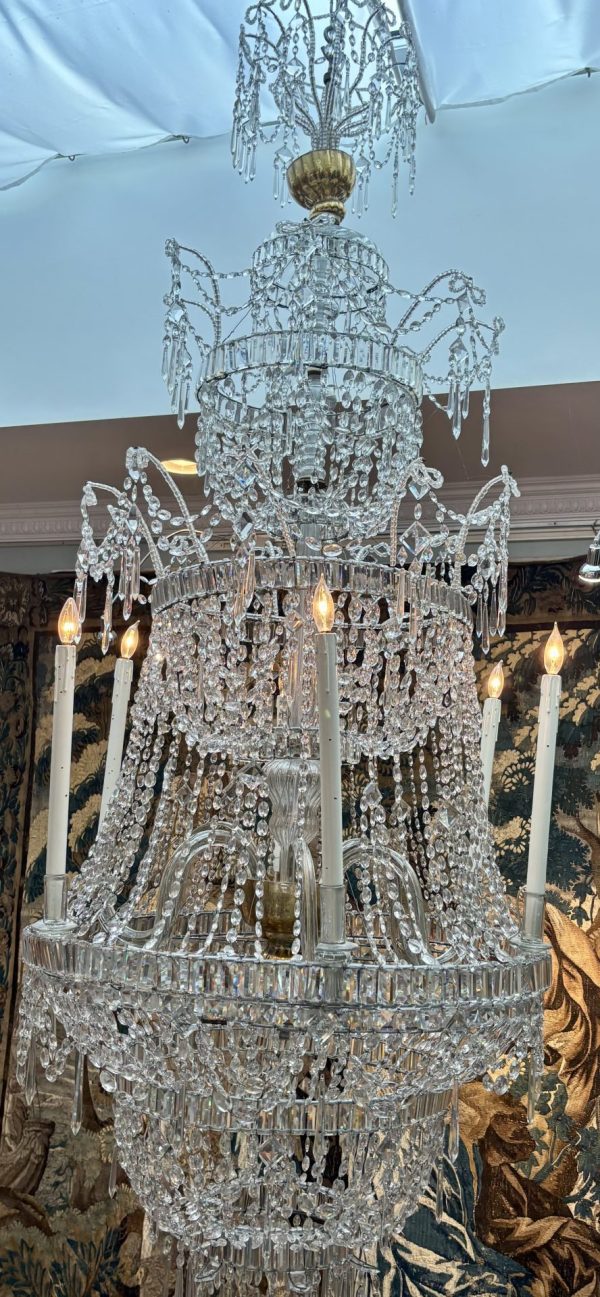A palace scale classical four tiered crystal chandelier; Provenance: saved from a bombed baroque church in Valletta, Malta during the second World War.