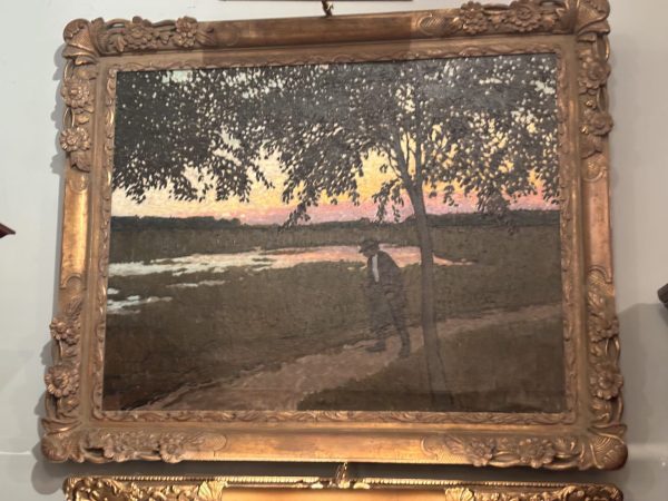 A signed oil painting on canvas of a man walking on a path beside a stream at dawn/dusk by Hungarian artist Barkasz Lajos (1880-1960 )