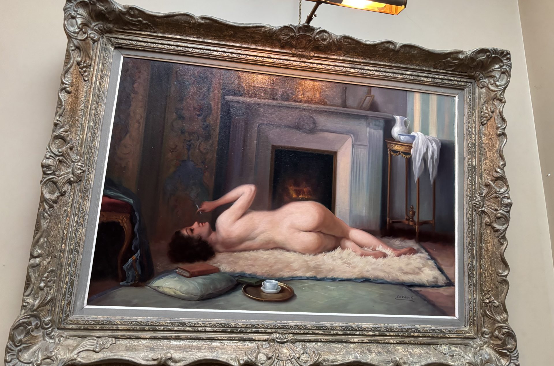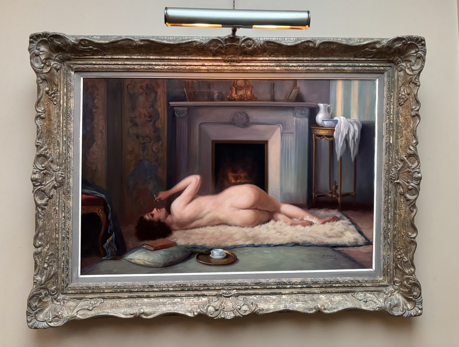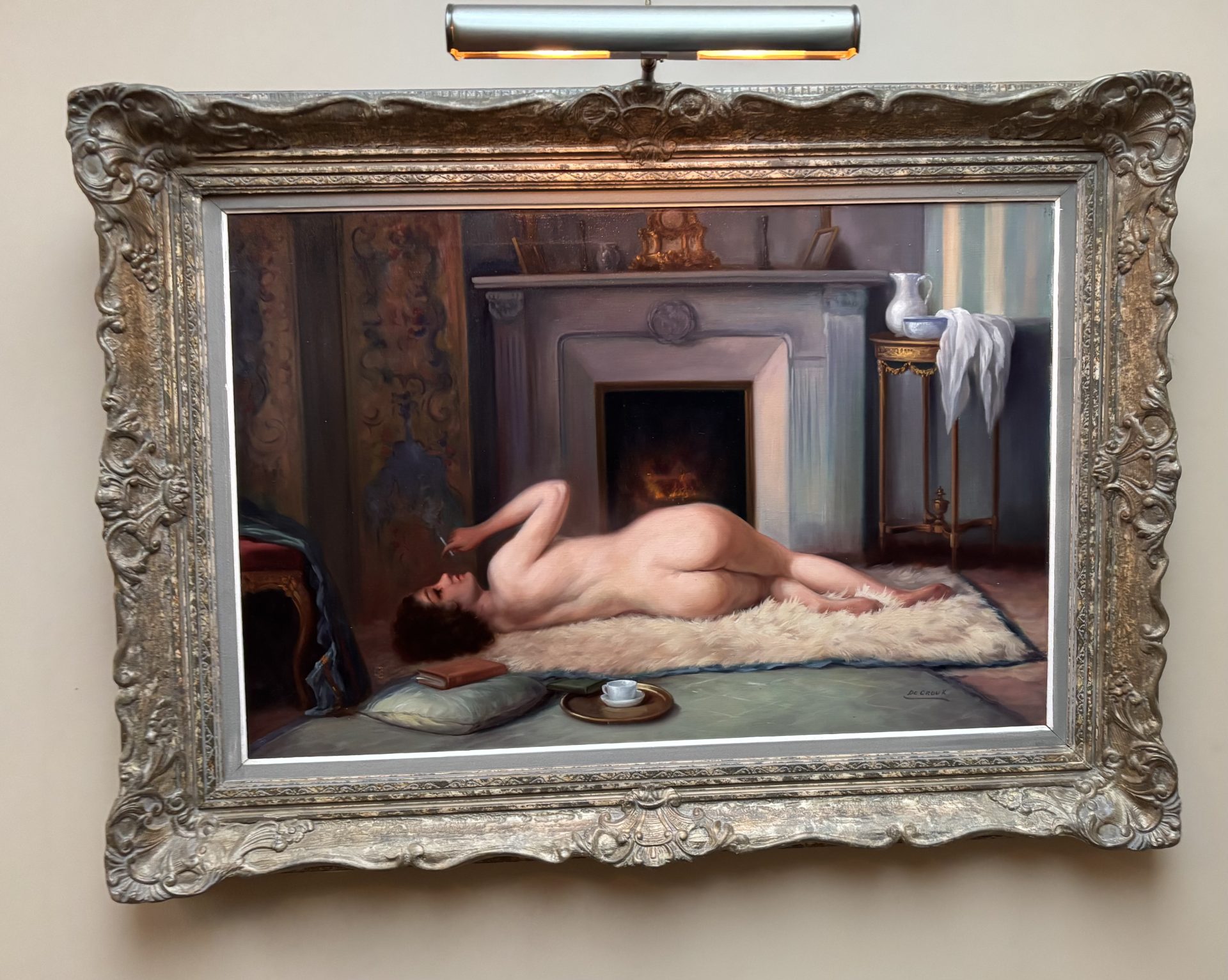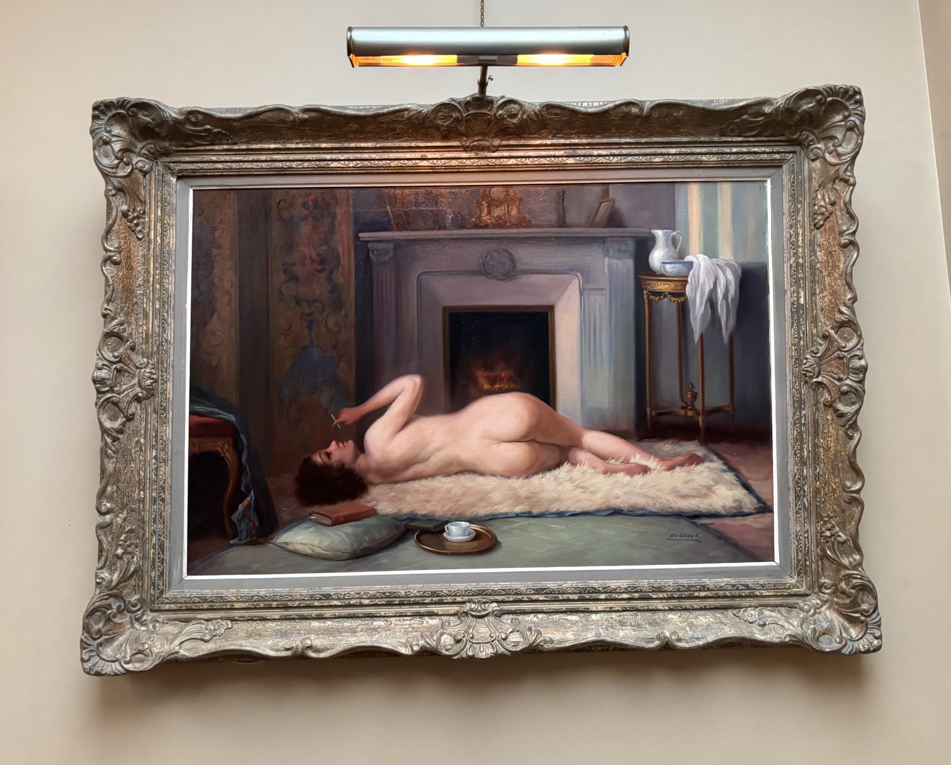 A very well executed and suggestive view from and accenting the “derriere” of female nude lying in a semi fetal position on a sheepskin rug in front of a roaring fireplace. The nude has her head pointing and looking upwards puffing contentedly on a cigarette. A cup and saucer for coffee are shown in the foreground. A jug and washbasin plus a towel set on a Napoleon III table off to one side of the fireplace plus other furnishings in the background place the scene as a late 19th century Parisian Belle Epoque salon. The painting is signed De Groux on the bottom right hand side of the canvas but without initials it is difficult to be definitive as to who the artist actually was. The period frame of he paining has now been fully restored, (not as shown).