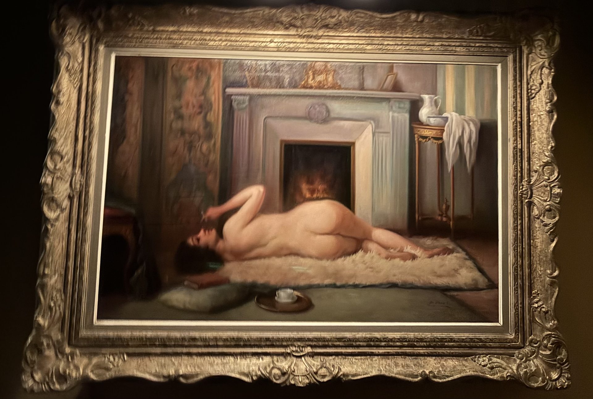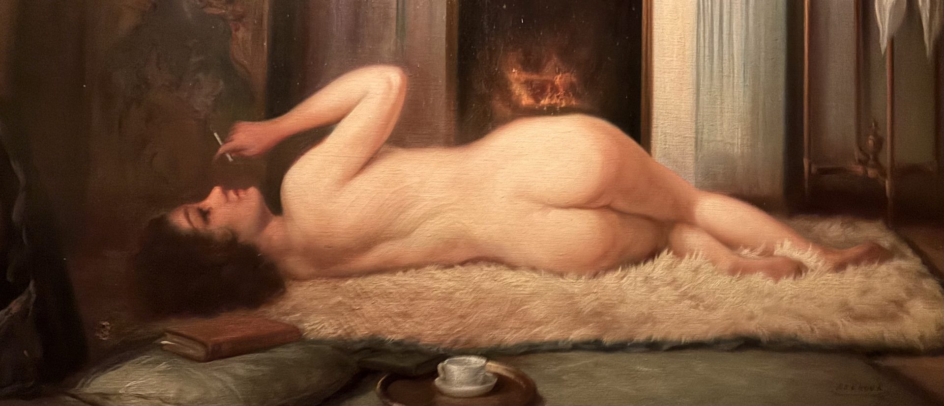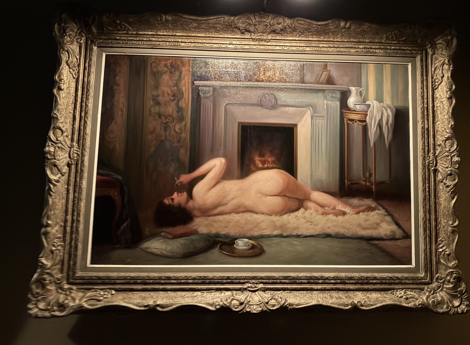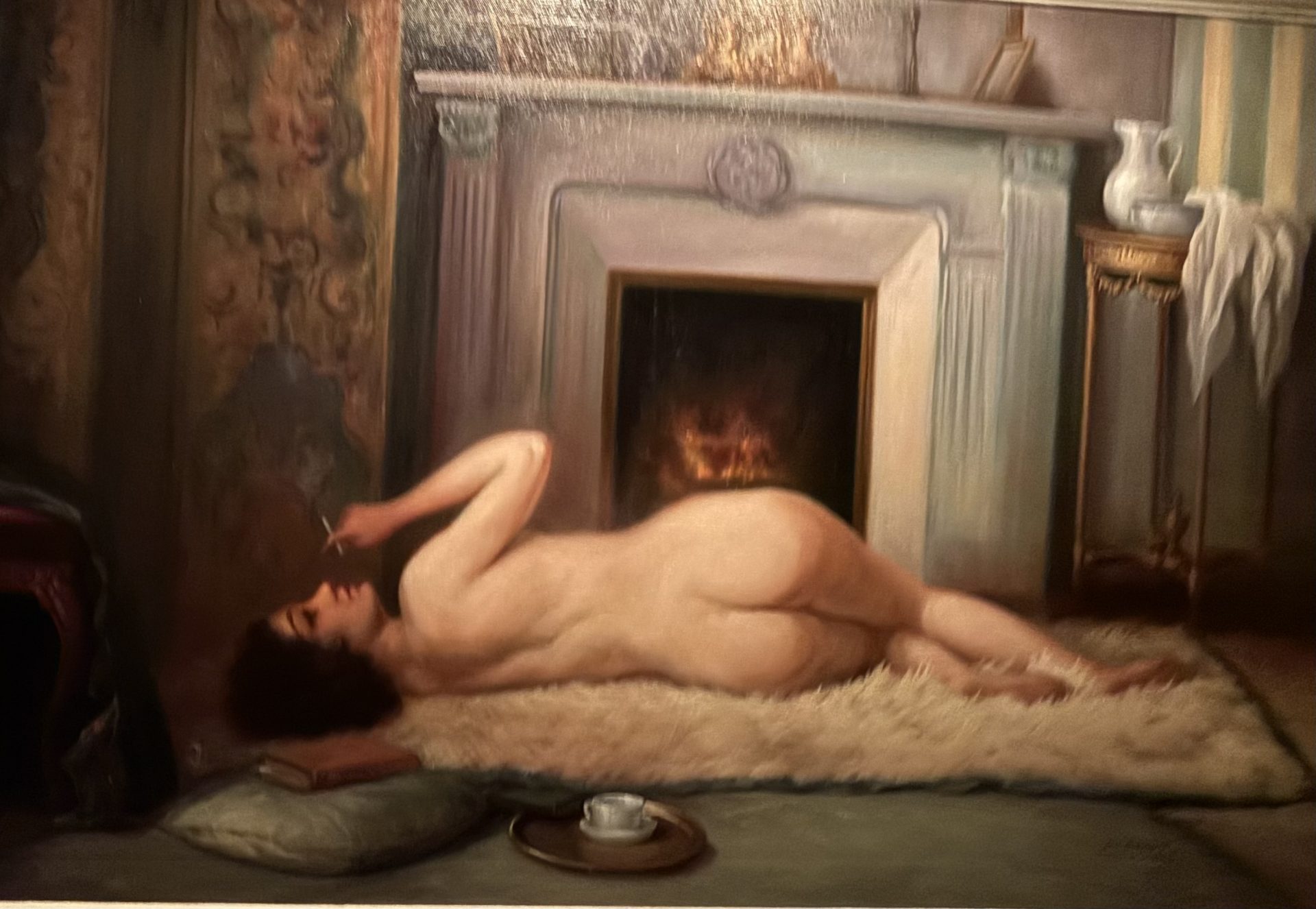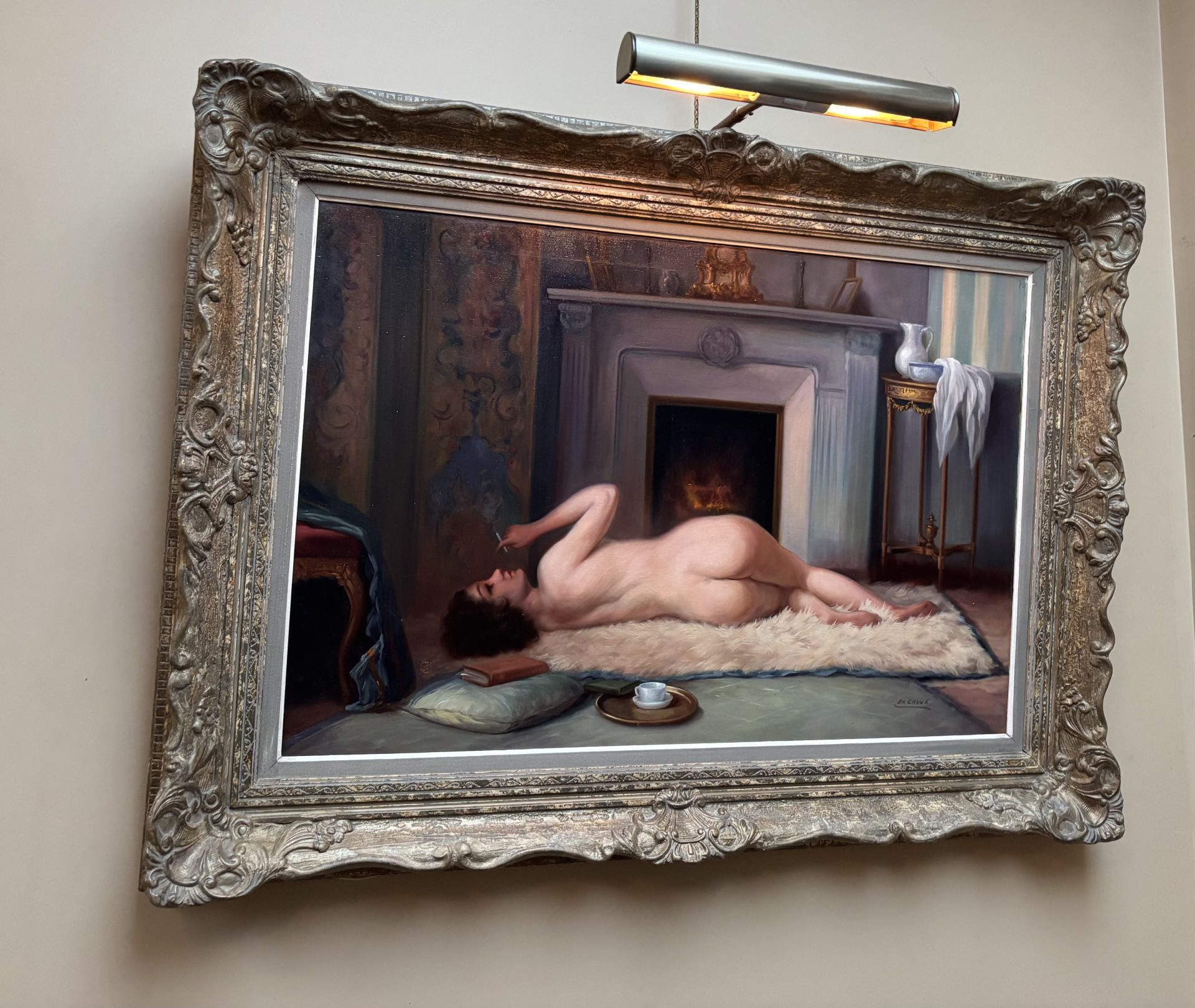 A very well executed and suggestive view from and accenting the “derriere” of female nude lying in a semi fetal position on a sheepskin rug in front of a roaring fireplace. The nude has her head pointing and looking upwards puffing contentedly on a cigarette. A cup and saucer for coffee are shown in the foreground. A jug and washbasin plus a towel set on a Napoleon III table off to one side of the fireplace plus other furnishings in the background place the scene as a late 19th century Parisian Belle Epoque salon. The painting is signed De Groux on the bottom right hand side of the canvas but without initials it is difficult to be definitive as to who the artist actually was. The period frame of he paining has now been fully restored, (not as shown).