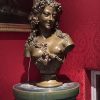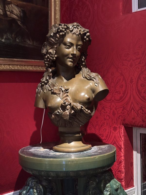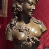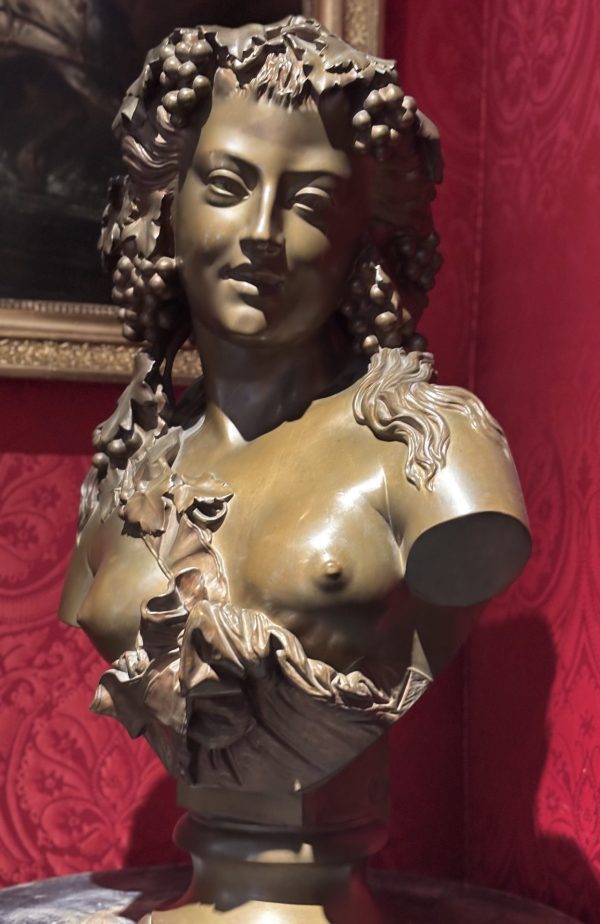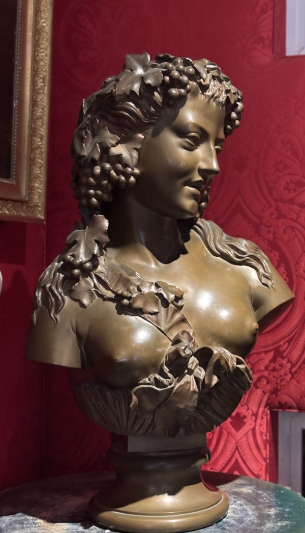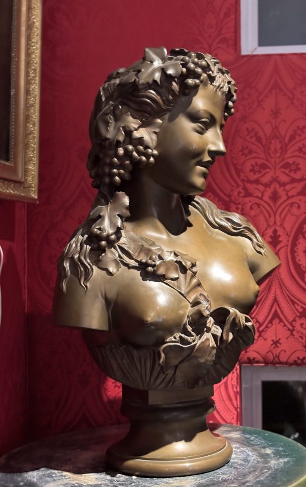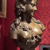 A large bronze bust showing a beautiful young woman depicted as a Bacchante, the Greek Goddess of Wine, her head festooned with grape branches. The bust is supported by an integral bronze plinth that at the back is inscribed with the name of the sculptor, J. Clesinger Rome 1857 dating the bronze to the time when the sculptor was 33 years old.