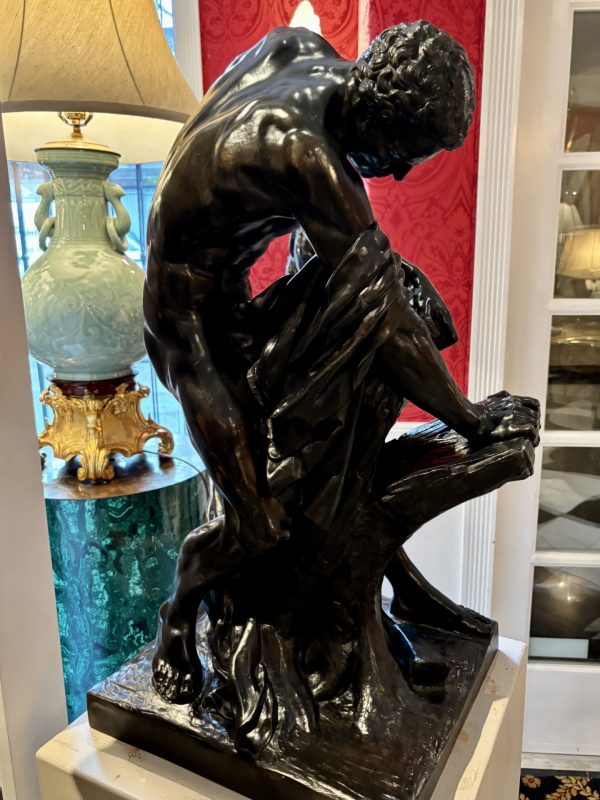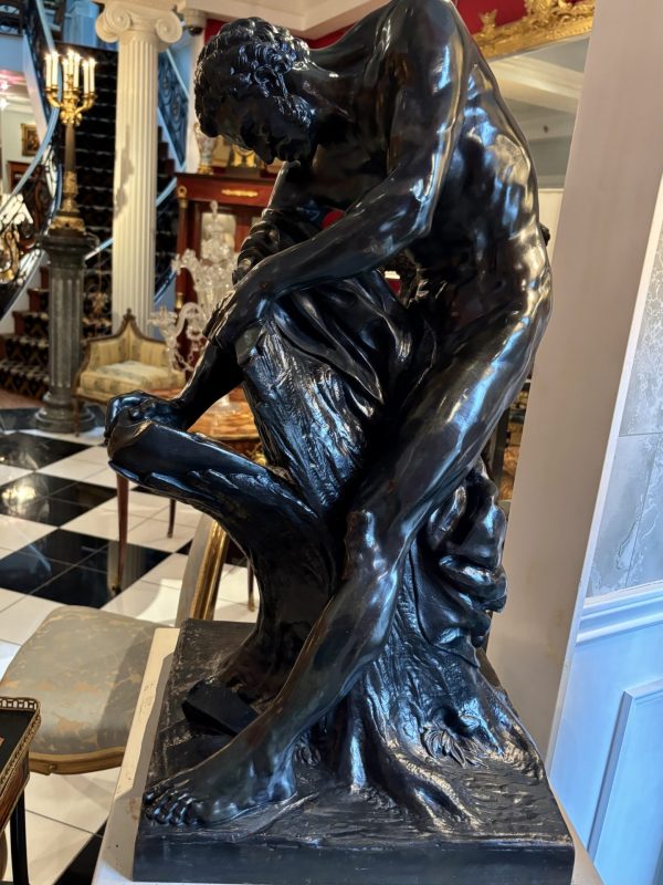 A French bronze model of the Milo of Croton on a stepped marble base after the original marble statue by sculptor Edme Dumont (1720-1775) displayed in the Louvre. Through the presentation of this particular sculpture, Dumont was in 1768 inducted in the Acadame Royale de Peinture et de Sculpture in Paris. This bronze is unsigned and is probably a late 19th century casting. There is a similar version of it in the Hermitage Museum in St. Petersburg.
