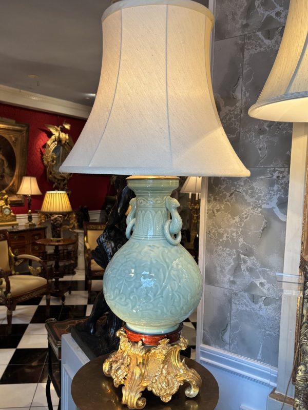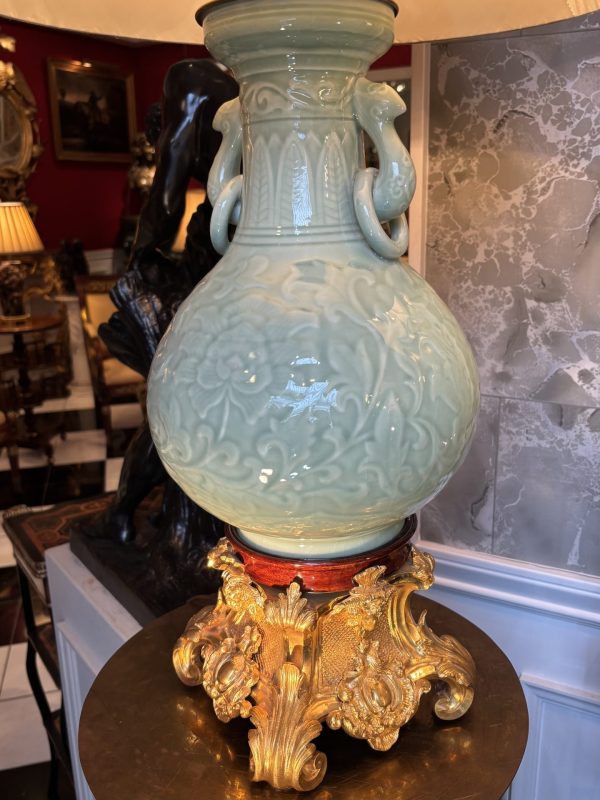 A contemporary celadon baluster vase lamp with loose ring handles on its neck set on a robust 19th Century gilt bronze base.