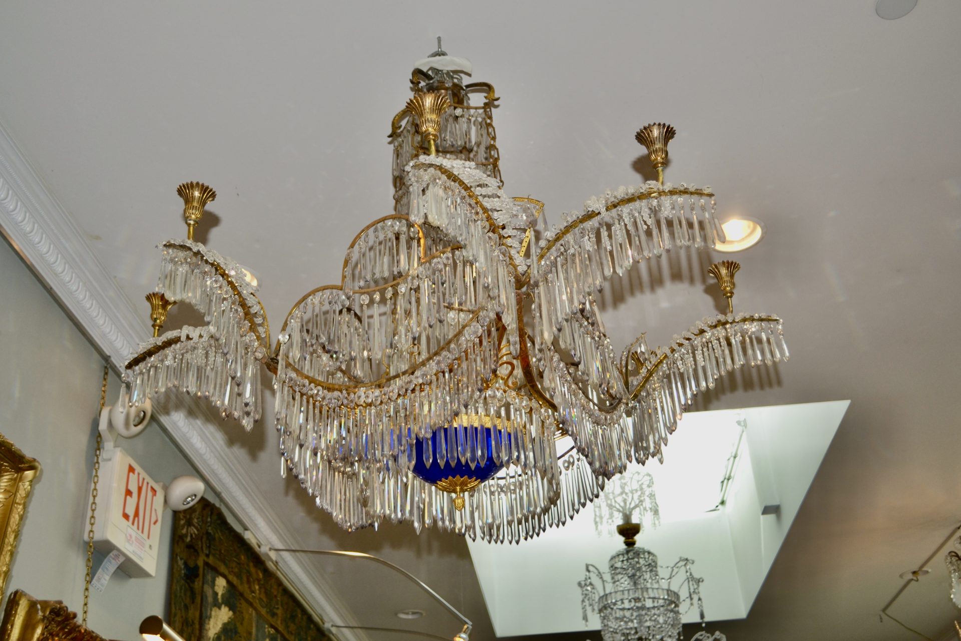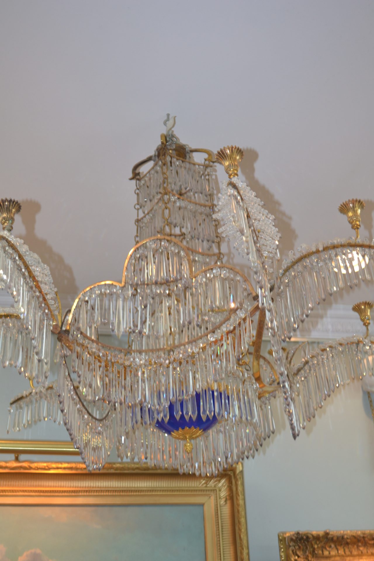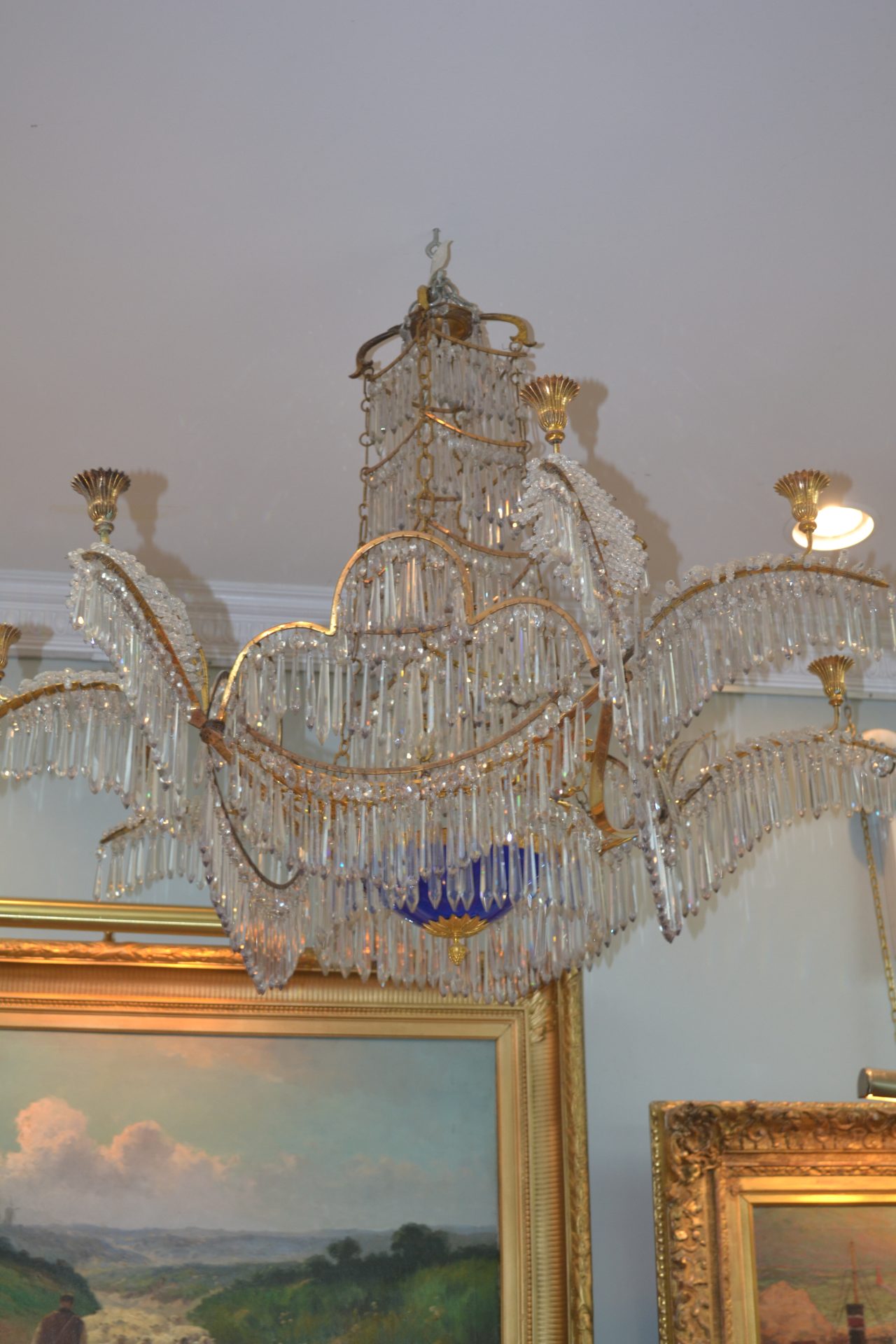 An early 19thC Russian chandelier having eight candle arms. The design is intended to represent waterfalls. The central stem of the chandelier is in four tiers each hung with original long cut crystals and almond shaped drops. The central stem connects to four downward sloping gilt frames all hung with ‘drapes’ of similar long crystals. At the four corners of the suspended gilt frames are attached two uprising candle arms each having crystals along the top of the arm as well as hanging from the arms. The arms terminate in gilded bronze candle nozzles. Suspended from the frames hangs another circular gilt bronze framed cobalt blue bowl, again all suspended with crystals. One of the most complex designed chandeliers ever made.