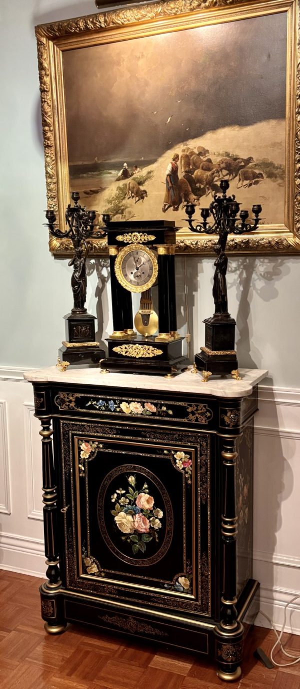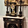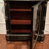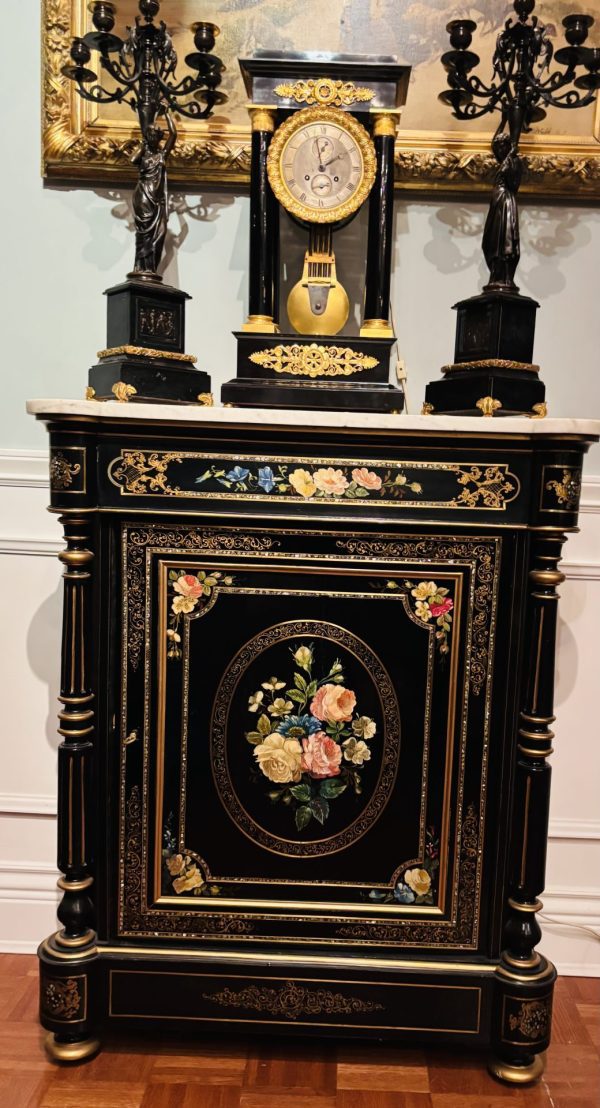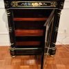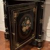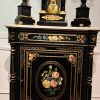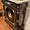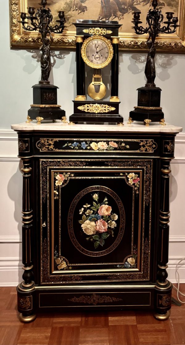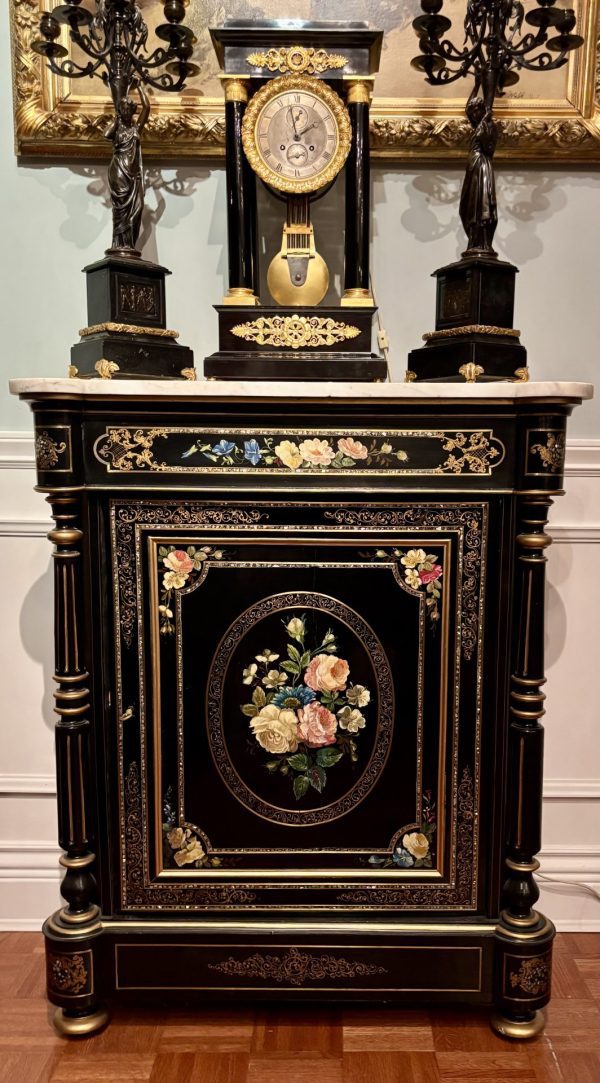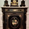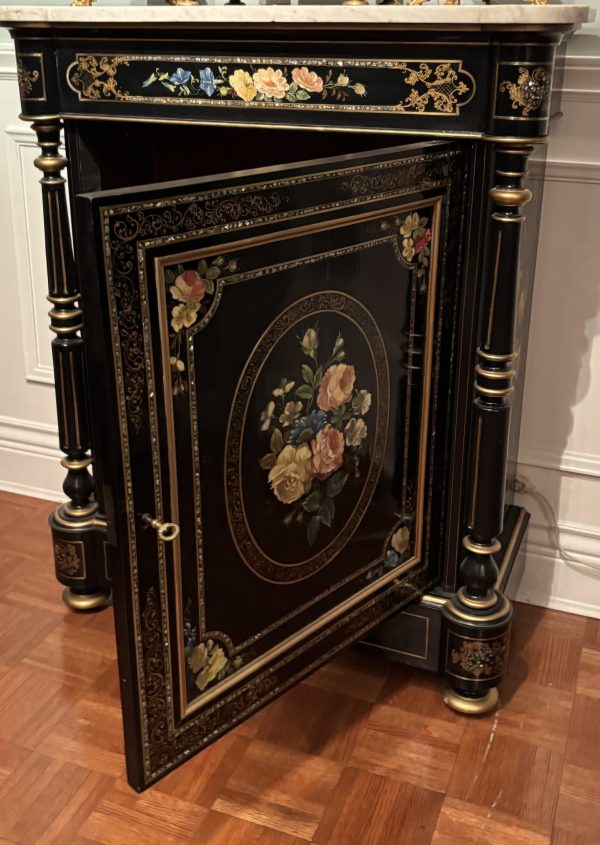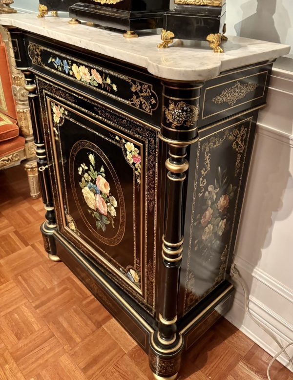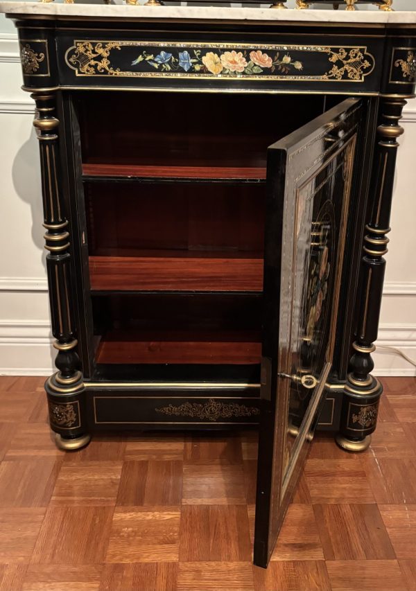 A Napoleon III ebonized cabinet with front and sides decorated with hand painted floral medallions. The cabinet has turned columns to each side with gilded decoration, and is further decorated with intricately painted gilding and bands of inlaid mother of pearl. The shelved cabinet has a shaped white marble top. France circa 1880.