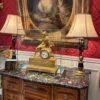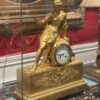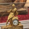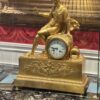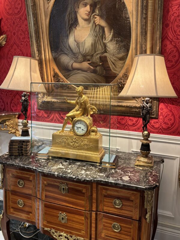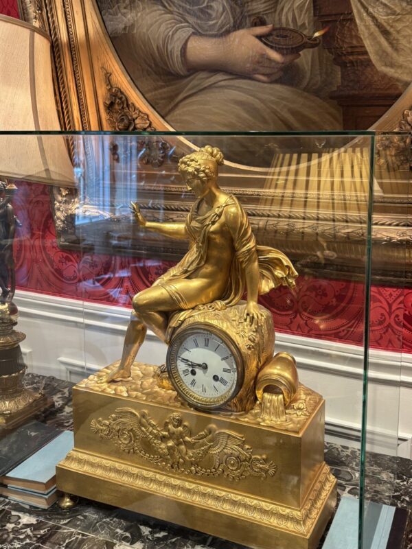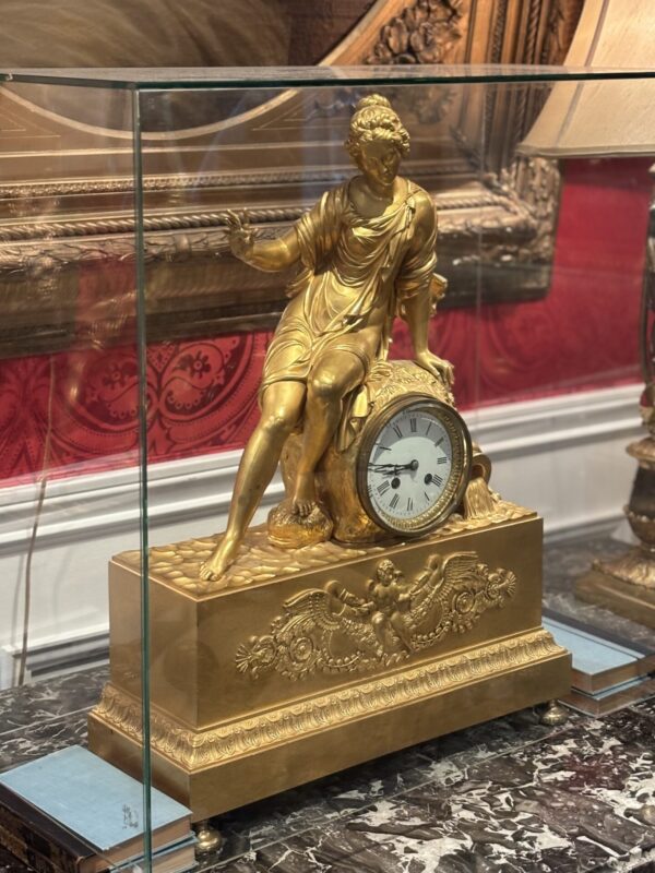 A gilt bronze French Empire clock depicting an allegory to the earth’s water source. In this clock a classically draped nymph sits atop a rocky outcrop her right foot resting on the water. To the right of the rocky clock plinth is a large jar with water flowing from it. The large ornament on the front of the case shows a winged putto, his arms outstretched feeding two swans. The original silk string suspension movement has likely been changed to a steel spring suspension movement later in the 19th century. An identical model of this clock forms part of the Spanish Royal Clock Collection as referenced on page 371 of the “Catalogo de Relojes del Patrimonio National” issued by J Ramon Colon De Carvajal and Published by the Editorial Patrimonio Nacional Madrid in 1987.