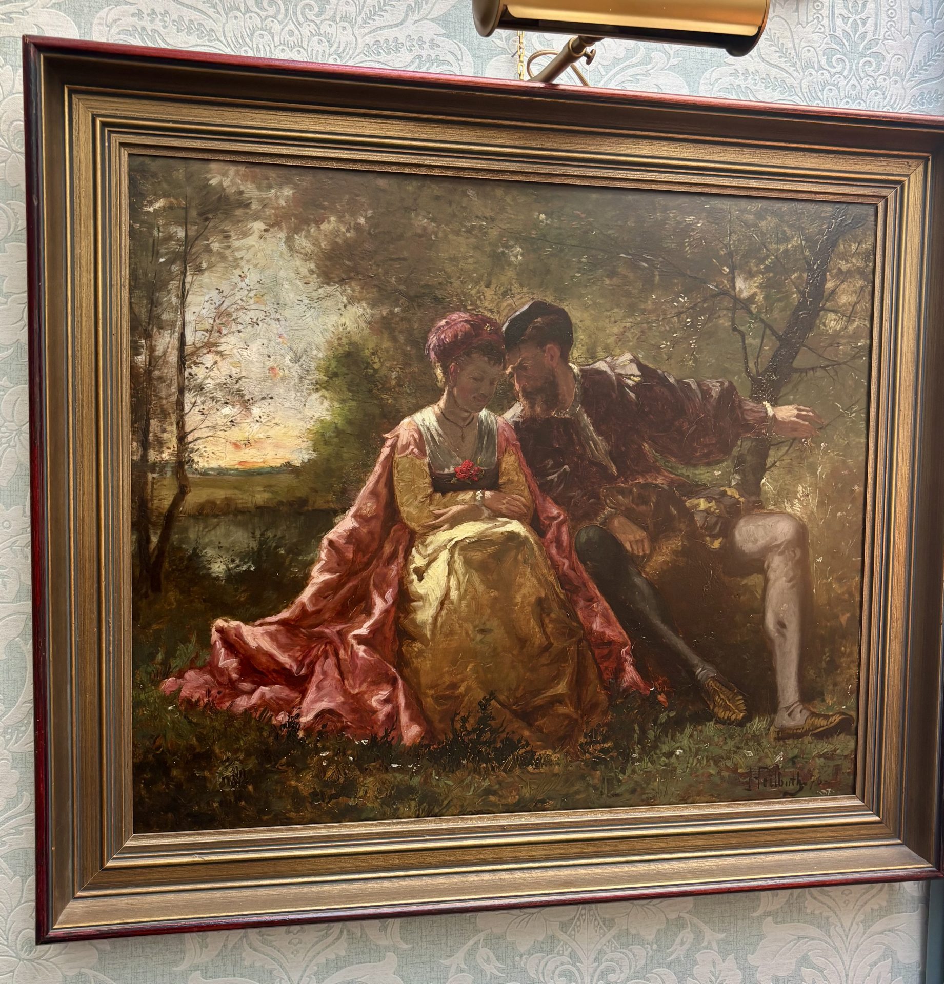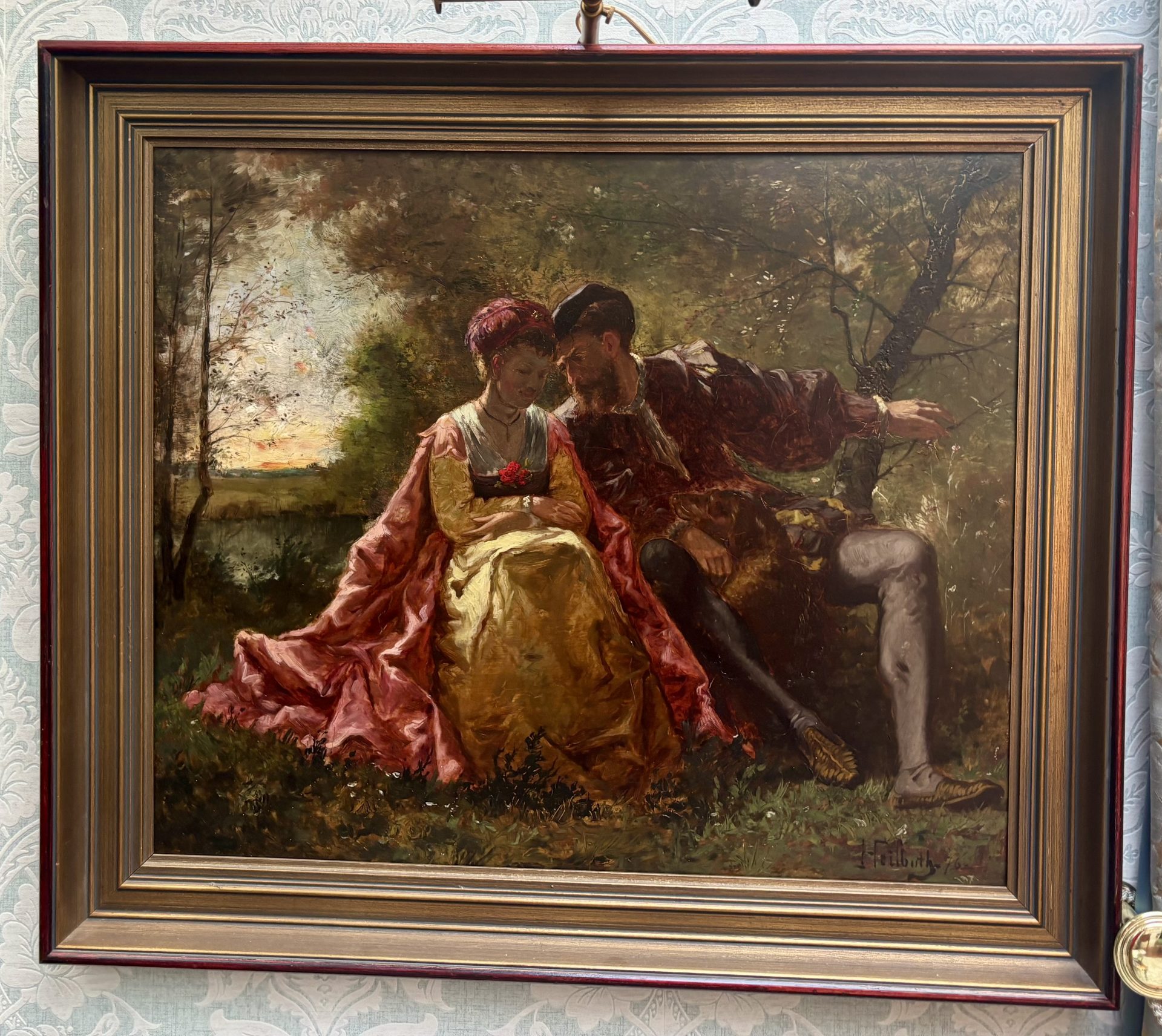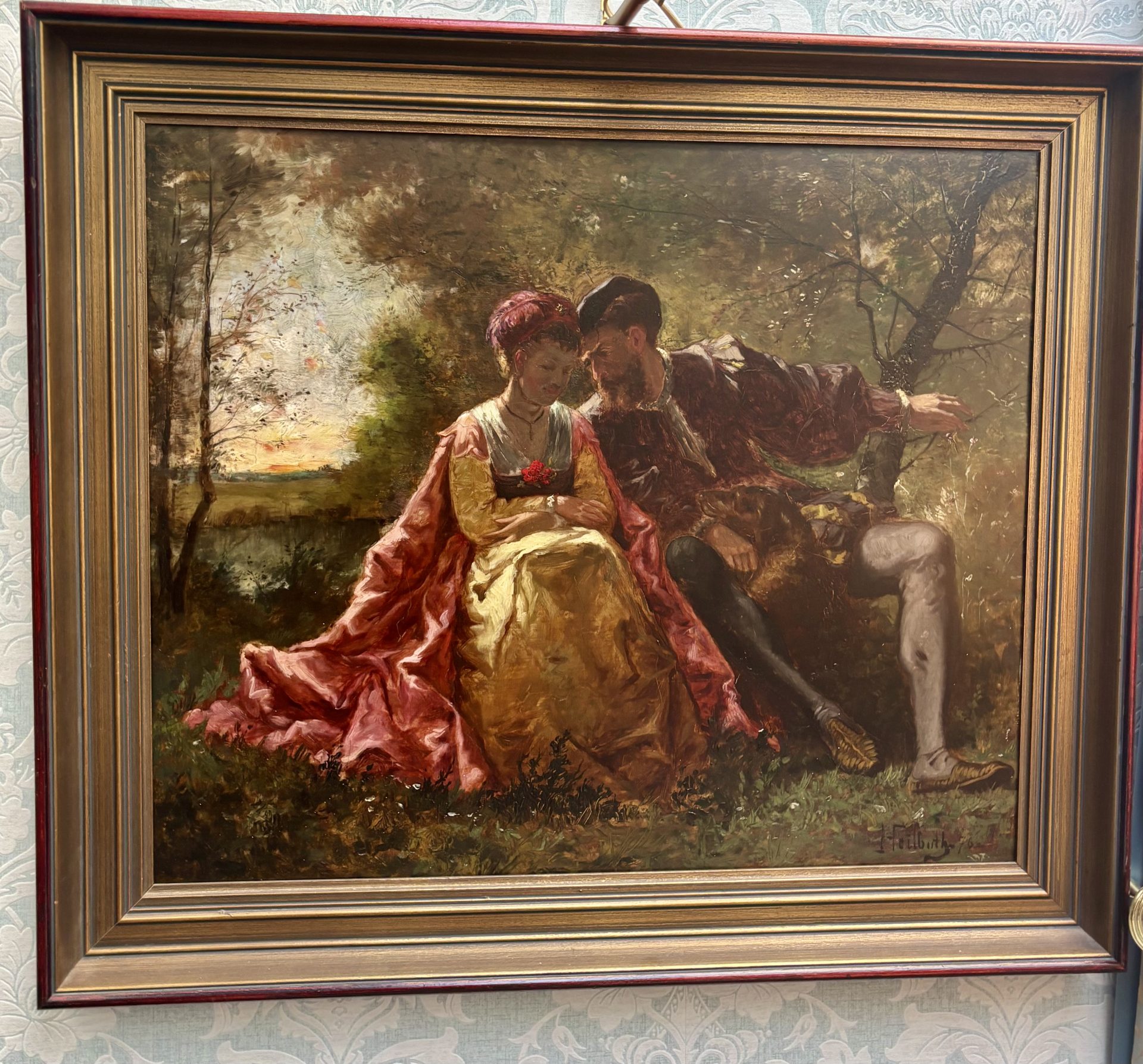 A classic Romantic Movement oil painting on wood panel depicting two lovers. They are dressed in Renaissance almost theatrical garments and they sit intimately close to one another on a bench. The atmospheric background is set in the middle of a wooded park in the early evening hours before dusk. Their faces are almost in shadow as the brilliant orange/red sun sets behind them. The painting is signed F. Heilbuth on the right hand bottom corner of the canvas and is dated ’76 in reference to 1876.