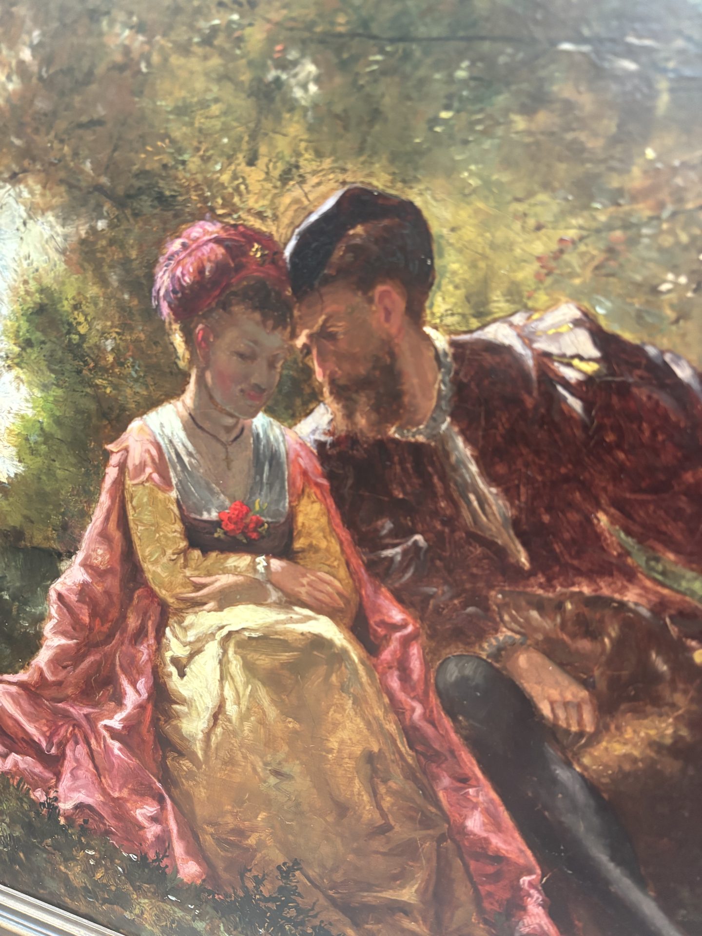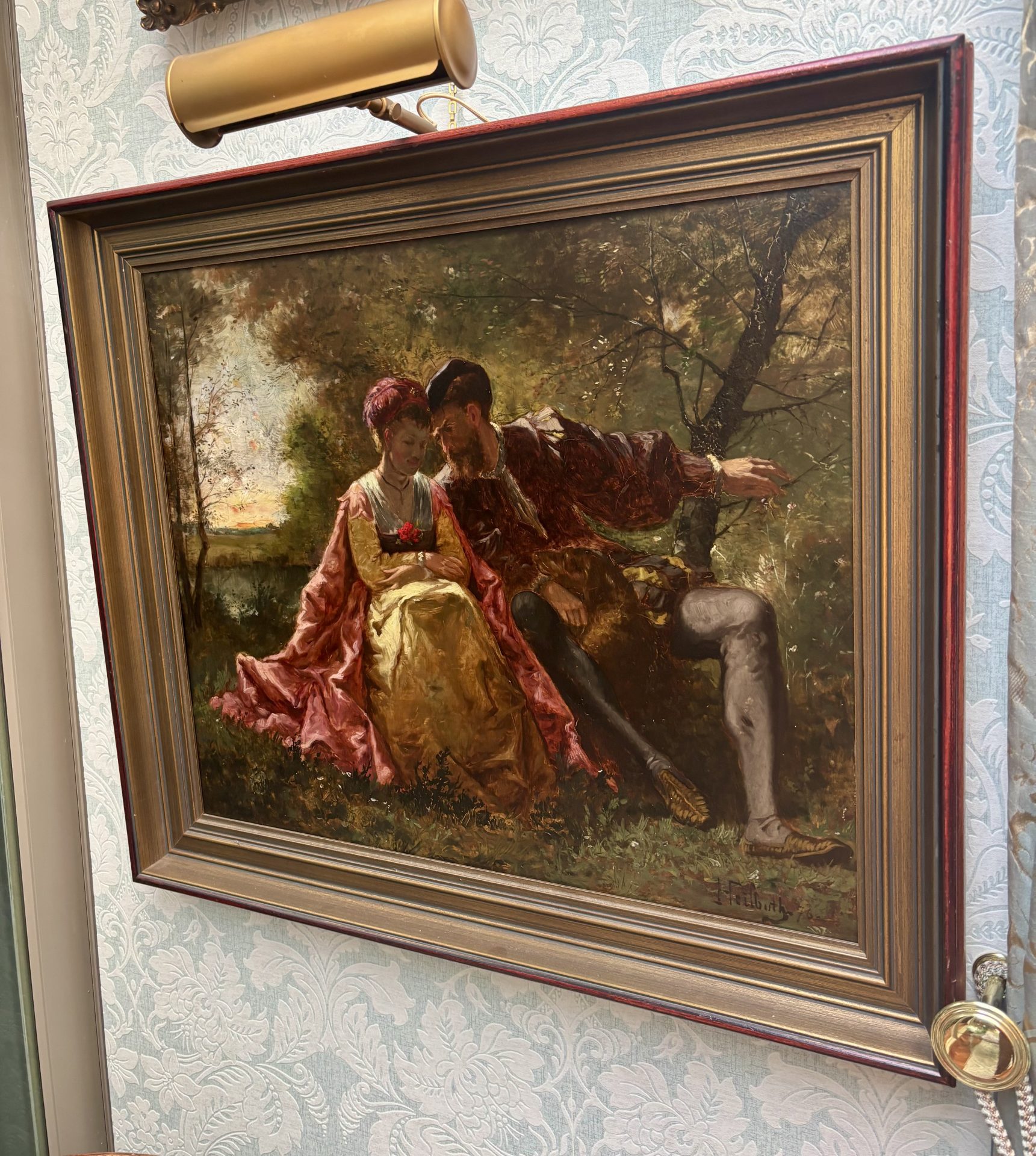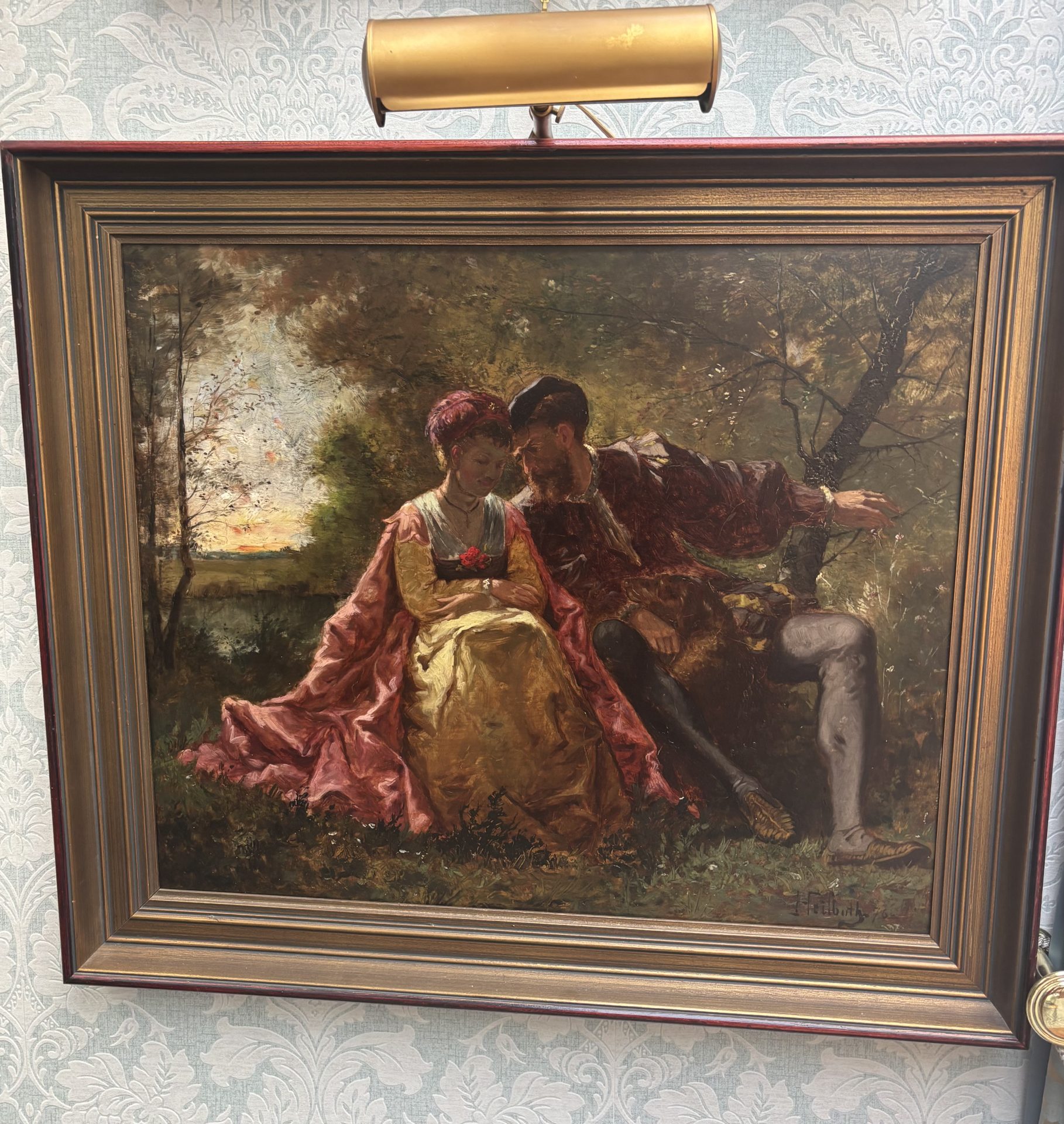 A classic Romantic Movement oil painting on wood panel depicting two lovers. They are dressed in Renaissance almost theatrical garments and they sit intimately close to one another on a bench. The atmospheric background is set in the middle of a wooded park in the early evening hours before dusk. Their faces are almost in shadow as the brilliant orange/red sun sets behind them. The painting is signed F. Heilbuth on the right hand bottom corner of the canvas and is dated ’76 in reference to 1876.