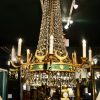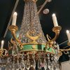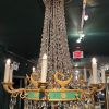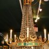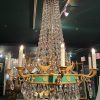 A French empire style crystal and gilt bronze chandelier; the top gilt band of palmettes supporting strings of cut crystals terminating at the central decorative ring from which decorative alladin lamps sit including the eight gilt bronze arms; a final tier of larger crystal drops are suspended from the frame;