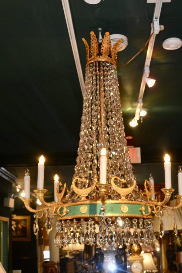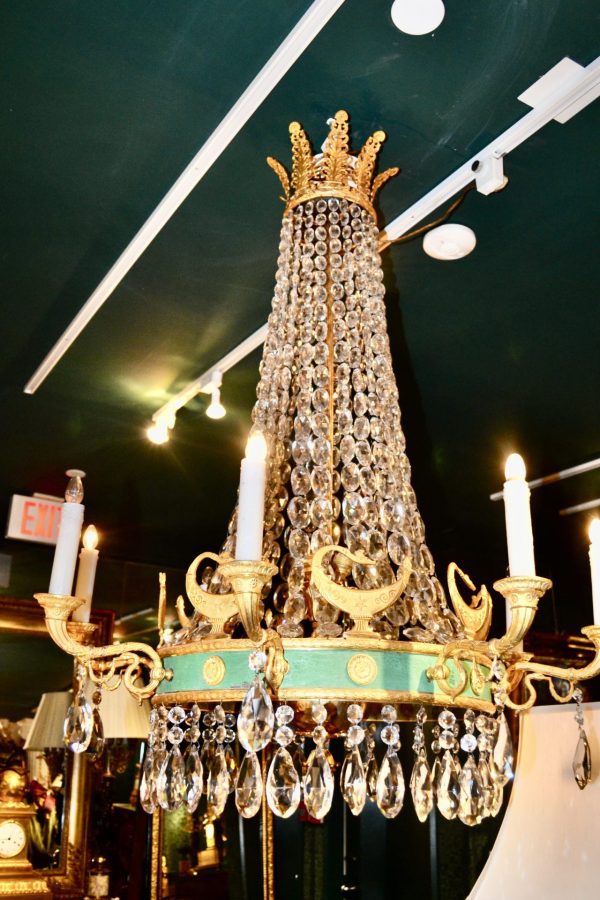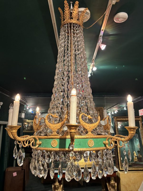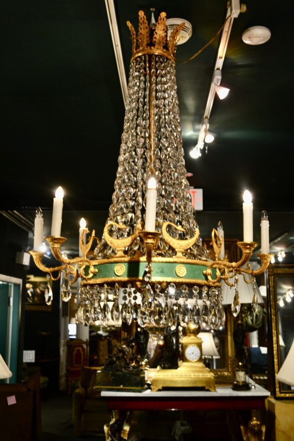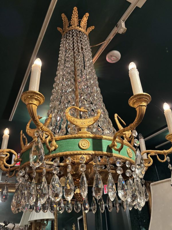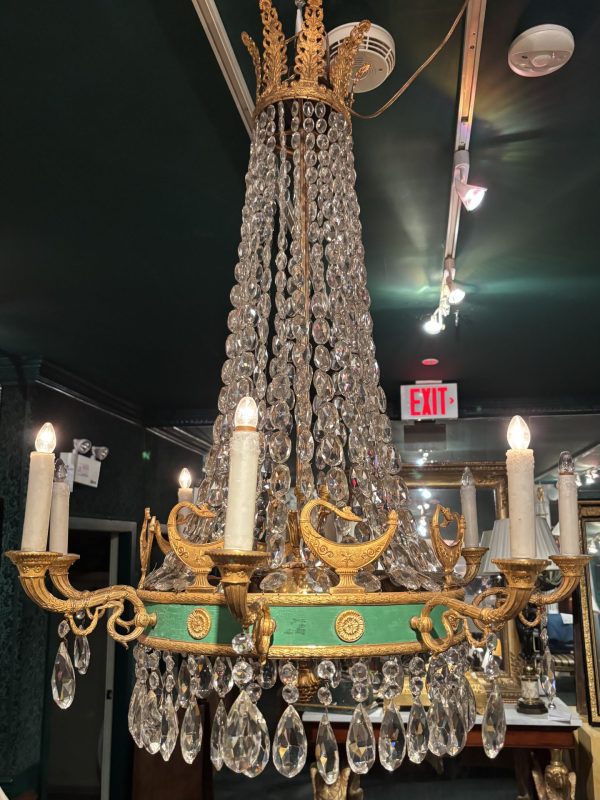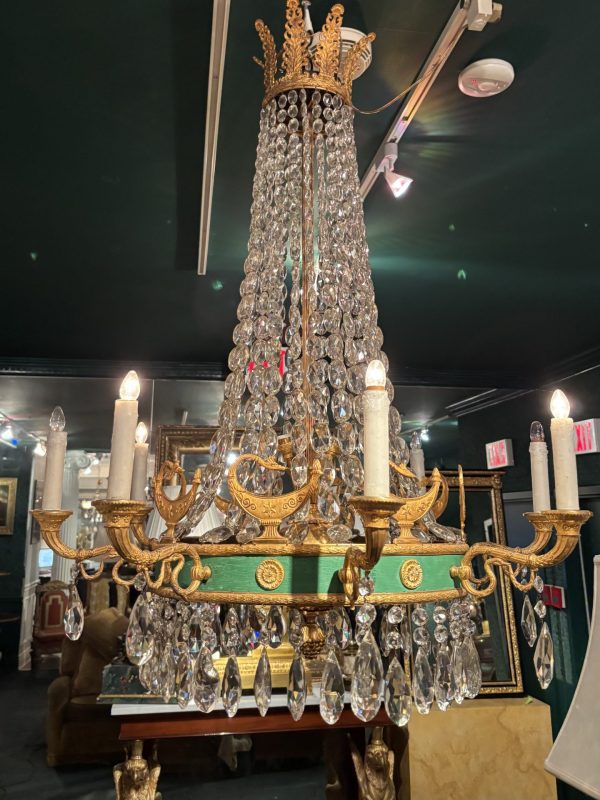 A French empire style crystal and gilt bronze chandelier; the top gilt band of palmettes supporting strings of cut crystals terminating at the central decorative ring from which decorative alladin lamps sit including the eight gilt bronze arms; a final tier of larger crystal drops are suspended from the frame;