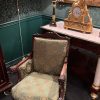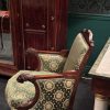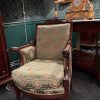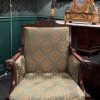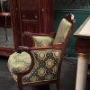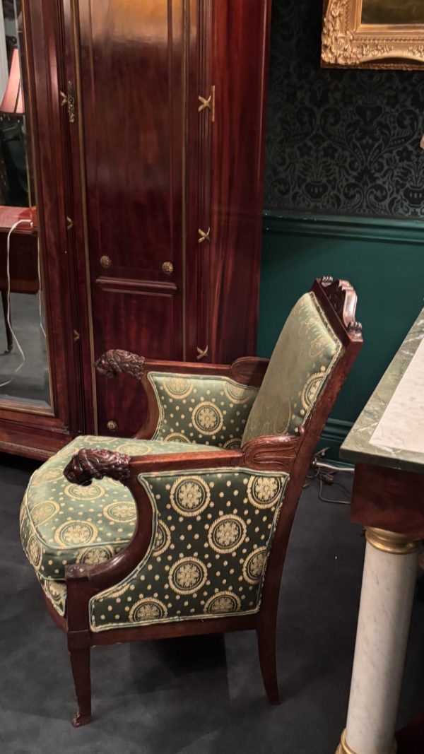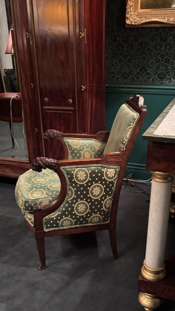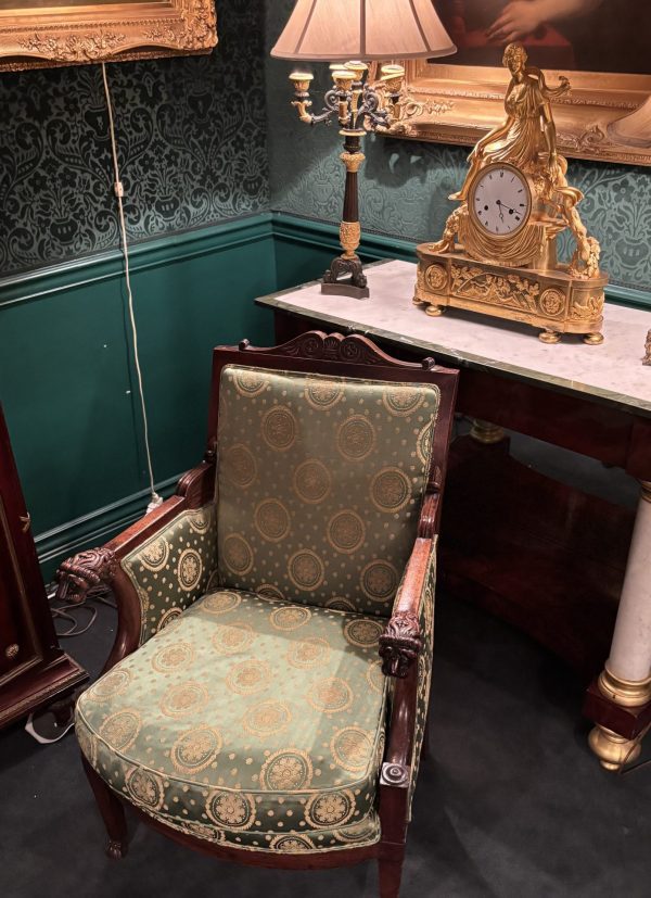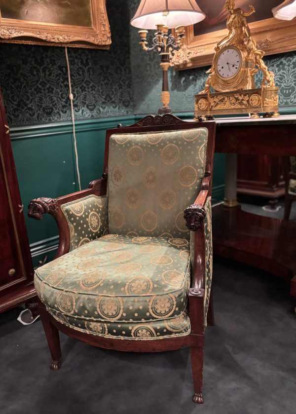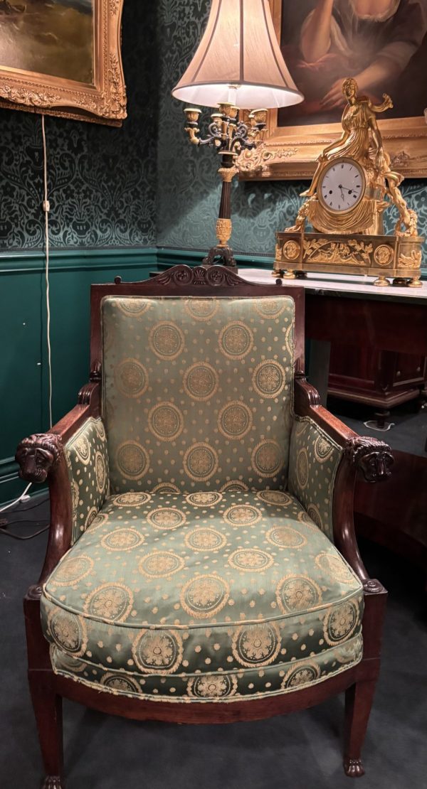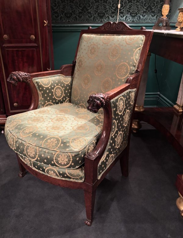 A very comfortable period French Empire mahogany armchair with carved lion heads to the arms and hairy paw feet to the legs; newly upholstered in French Empire design green silk fabric; Paris circa 1800.
