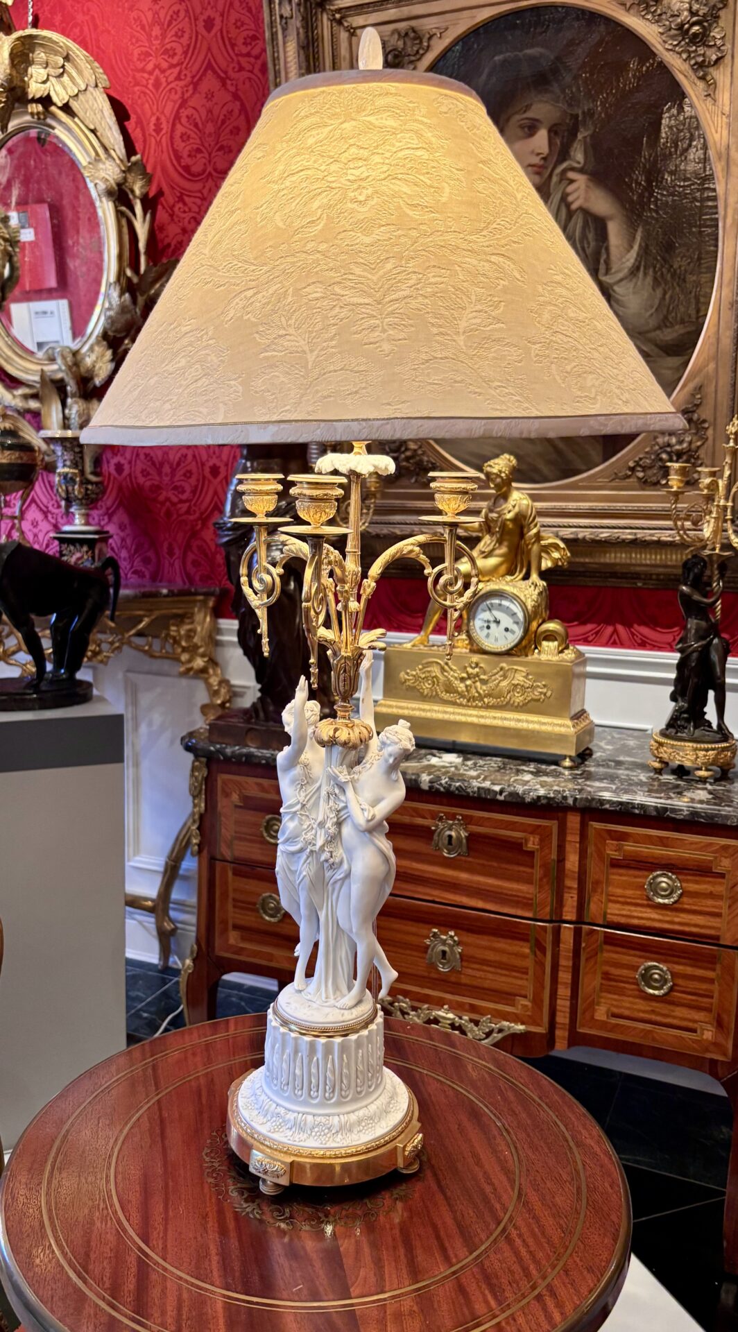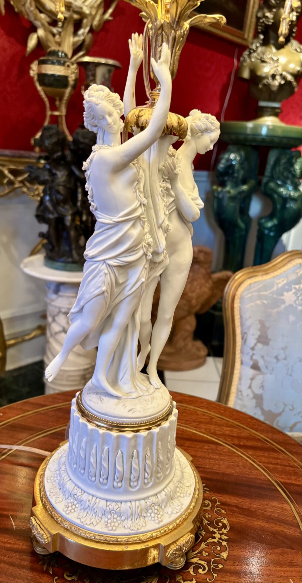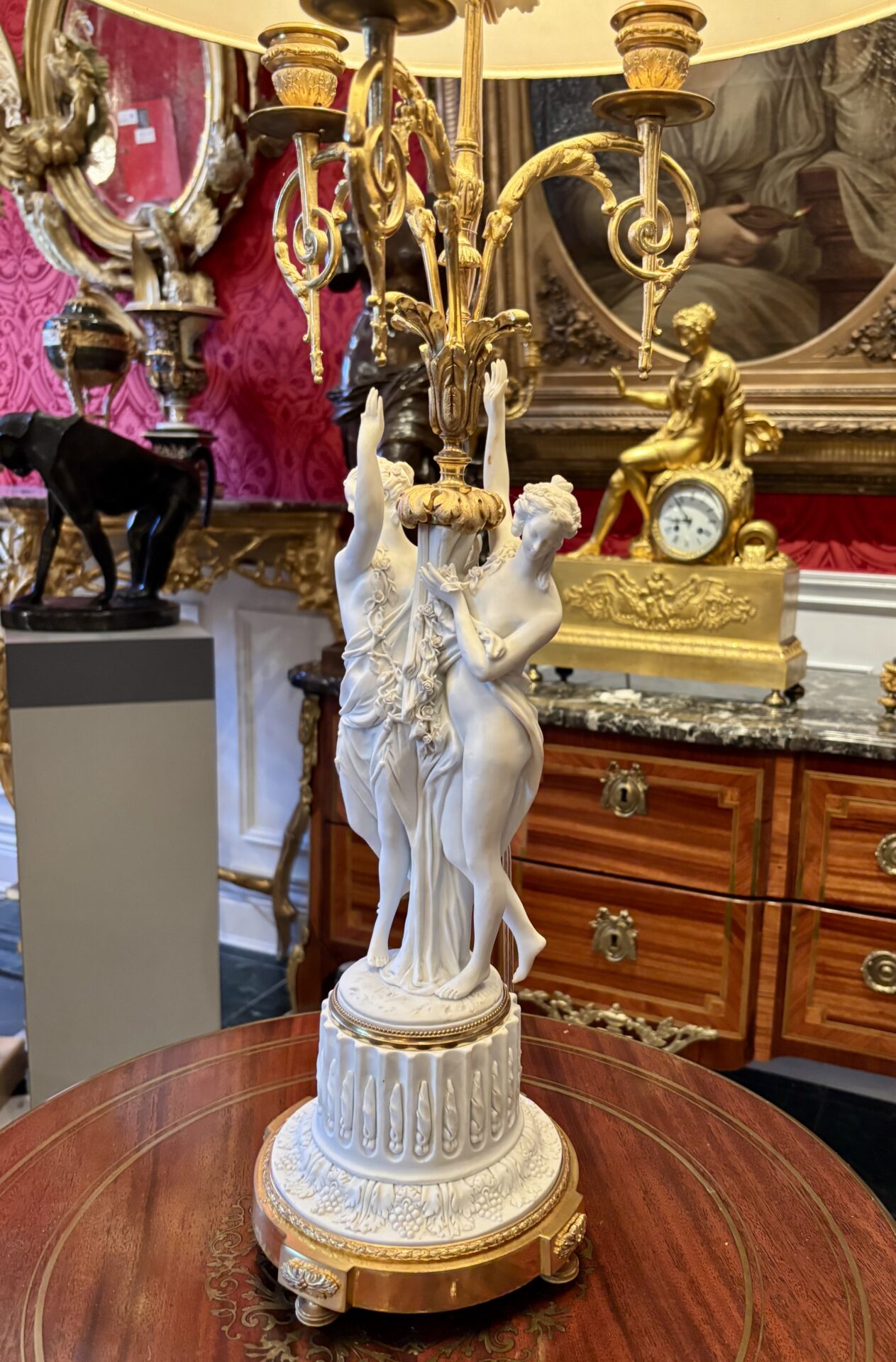 A beautifully cast French Serves bisque porcelain grouping showing two classically draped maidens or Graces standing on a circular bisque base with flutes and inset with decorative flames, on a further bisque base decorated with grapes and palmettes, the whole on a circular gilded bronze base resting on three tupie feet. Between the heads of the maidens there is a decorative gilded shaft which supports the ‘new’ top electrics as well as three curved gilded candle arms and nozzles. Incised on the top and back of the bisque base is the Sevres stamp with a number 2 between the interlaced L’s. There is also the original sculptor’s name J. J Feuchere for Jean Jacques Feuchere ( 1805 – 1852) etched on the base under the Graces Figures. JJ Feuchere has singukarbworks in the Louvre and the Paris Arts Decoratifs Museum.