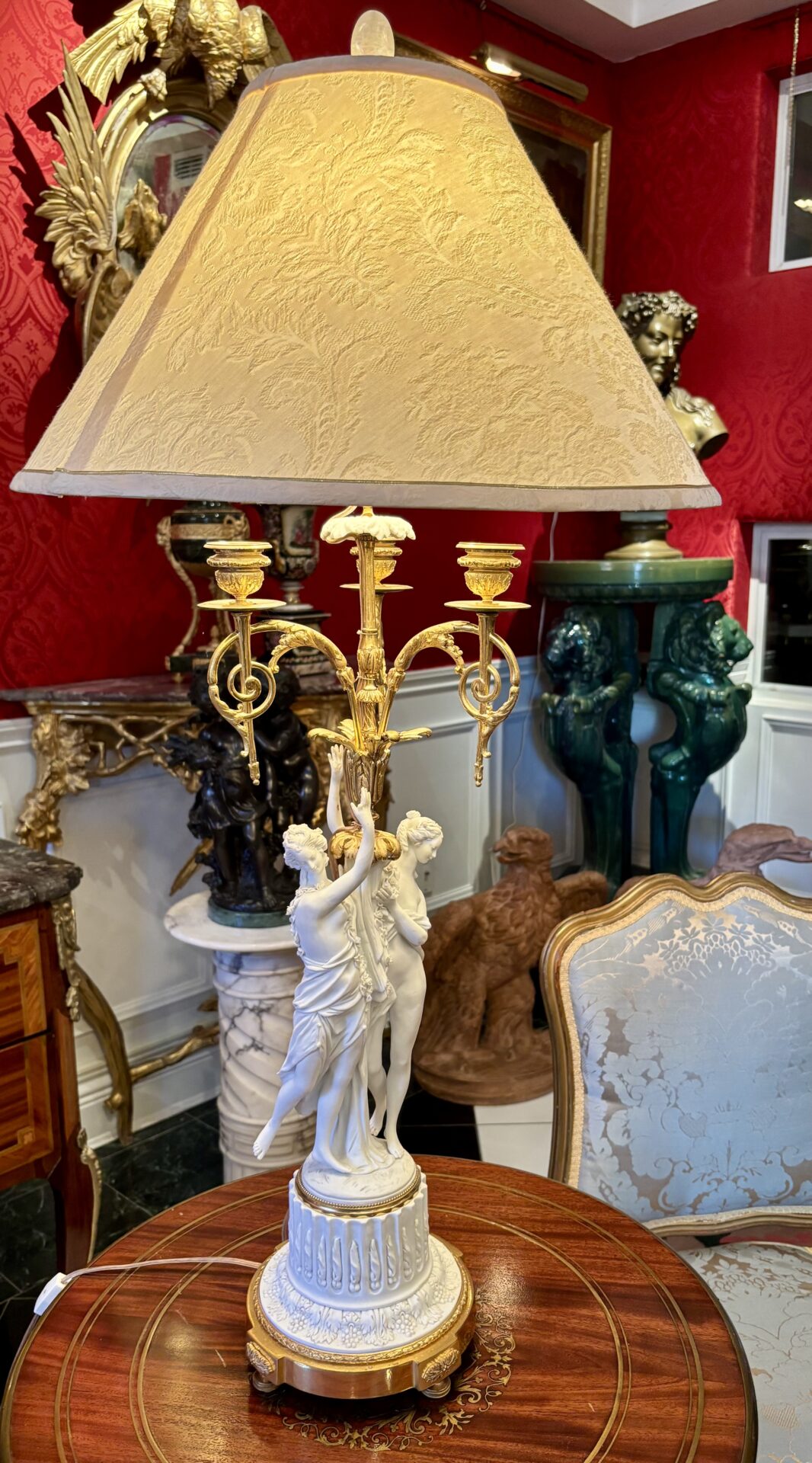 French Sevres Bisque Porcelain and Gilt Bronze Two Graces Candelabra Lamp signed Feuchere