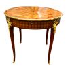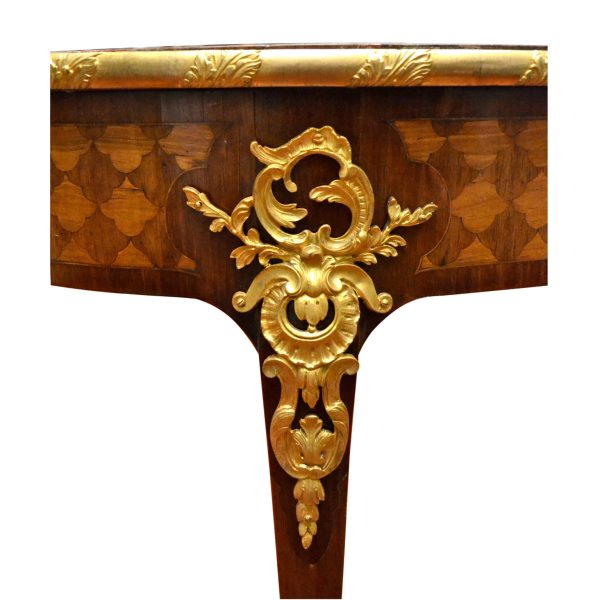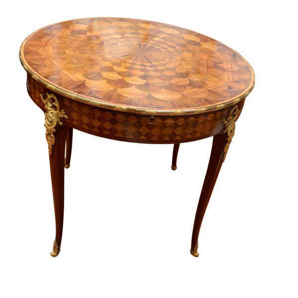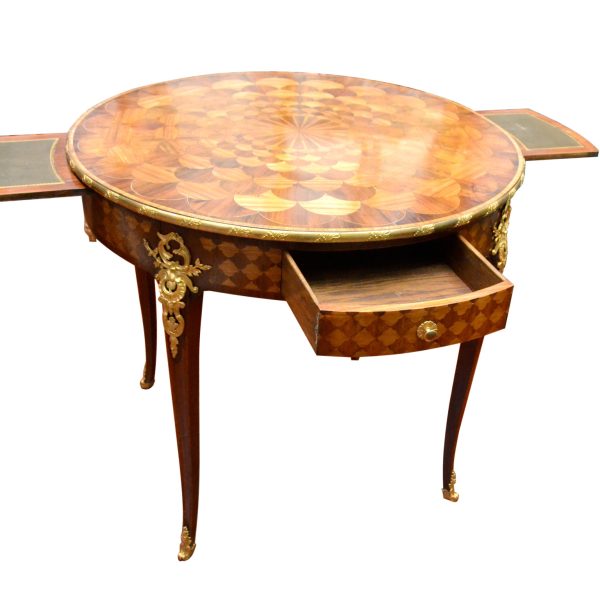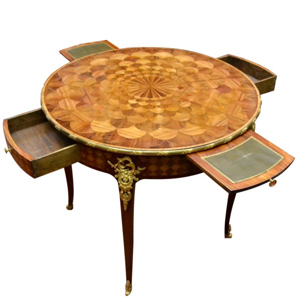 A wonderful Louis XV-style 19th century French centre or games table, the quality of which could be attributed to the Linke workshop in Paris. The table is completely veneered with the top inlaid in a radiating geometric pattern. The top has a decorated gilt bronze border; the four legs also have finely chased decoration gilt bronze decoration above and below the skirt. There are two drawers and two pull out writing/playing surfaces. Paris circa 1880.
