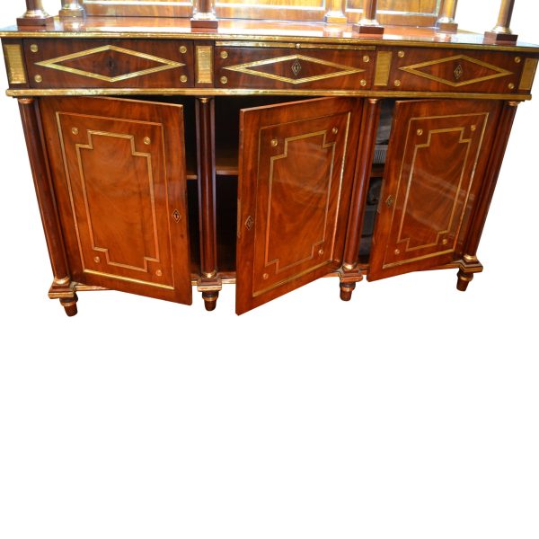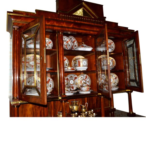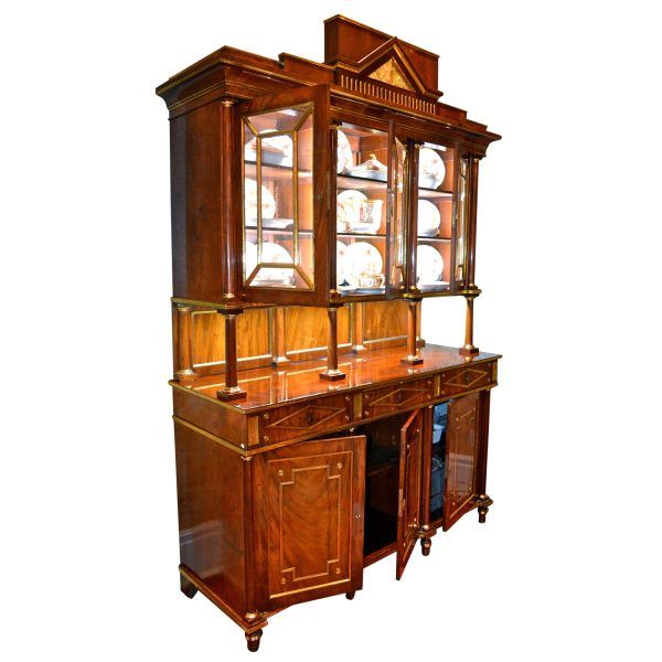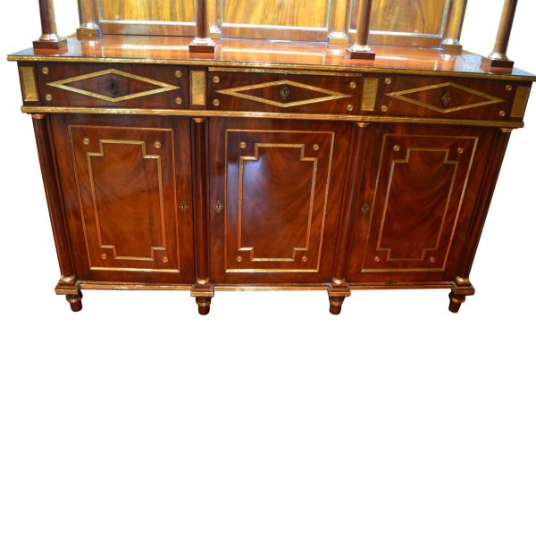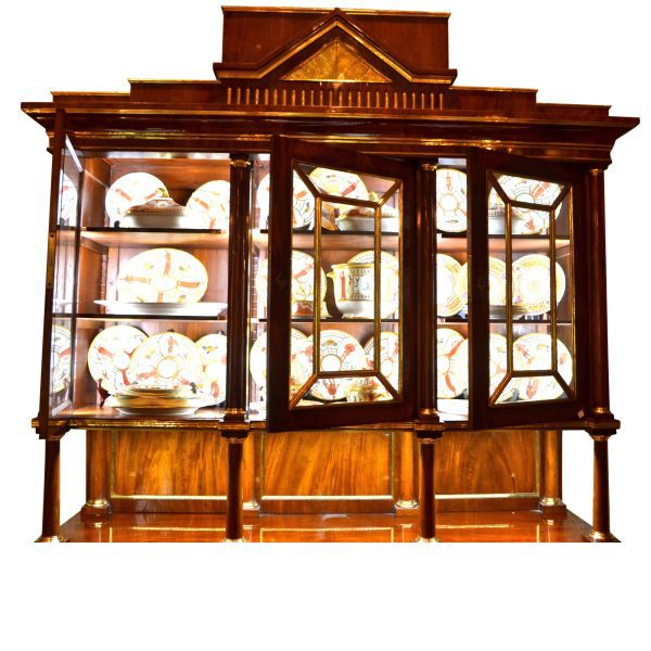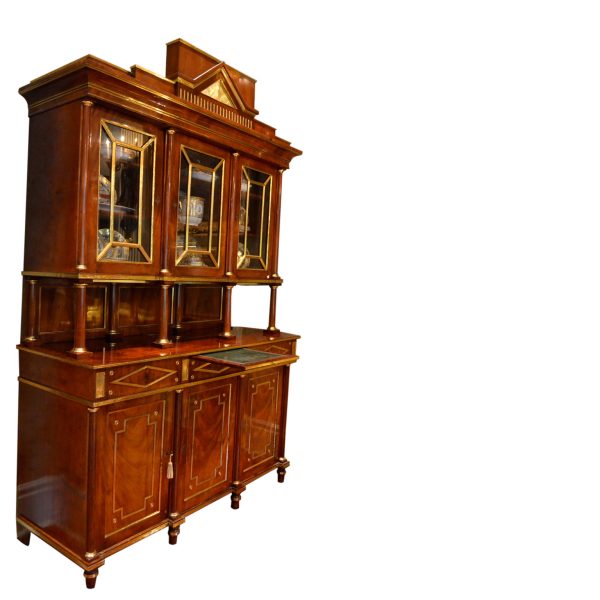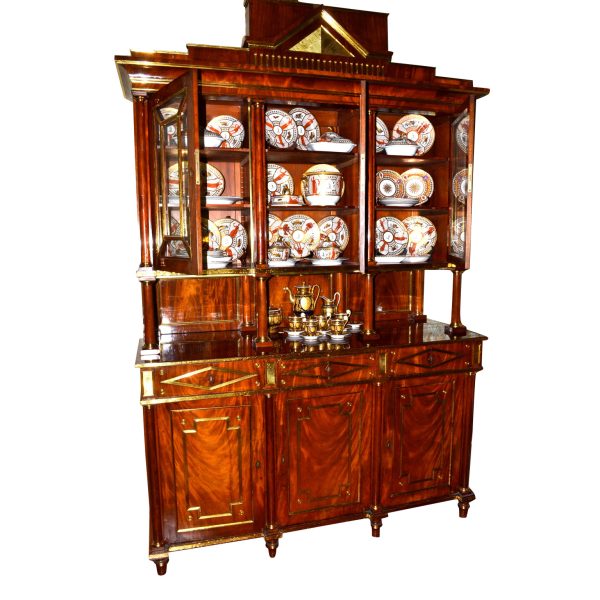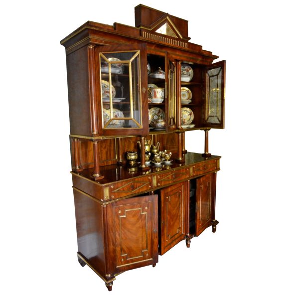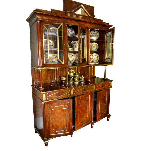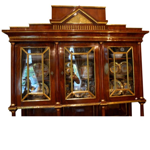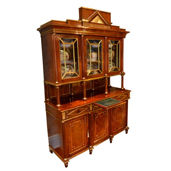 Late 18thC early 19thC Russian empire buffet/display cabinet in the finest mahogany richly inlaid and mounted with gilded brass. The cabinet is constructed in a number of sections; a central top pediment; a top section with three glazed doors opening to reveal shelves; a middle open section having a flat surface and four small frontal turned columns, (in part supporting the top section); and a lower section having a pull out leather lined writing (serving) slide above three drawers, and three lower doors opening to reveal three shelved interiors. The addition of overall gilded metal ‘borders’ and ‘inserts’ further augments the richness and splendour of the piece.