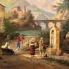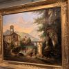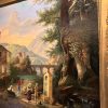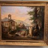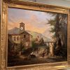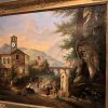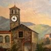 An early 19th century Italian musical clock painting indistinctly signed on the lower right corner. The painting is set in a period Empire gilt frame and depicts a bucolic mountain scene with a pair of musicians; one playing a mandolin or a lute and the another the tambourine. They are amid the company of a seated lady and a gentlemen resting on a cane in front of a niche of the Virgin Mary. The clock dial is housed in a church steeple. The twin barrel clock movement activates two separate gongs ringing the hours and quarters. The canvas has been relined.