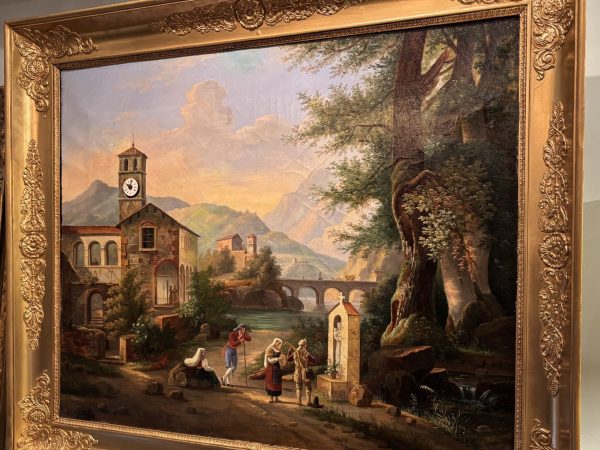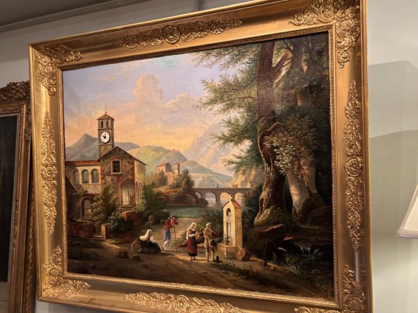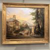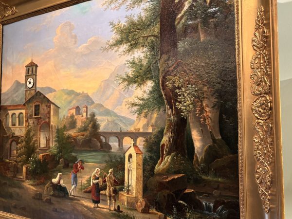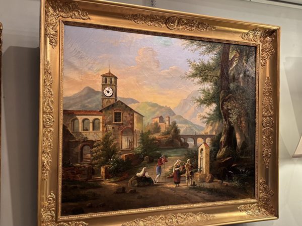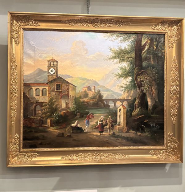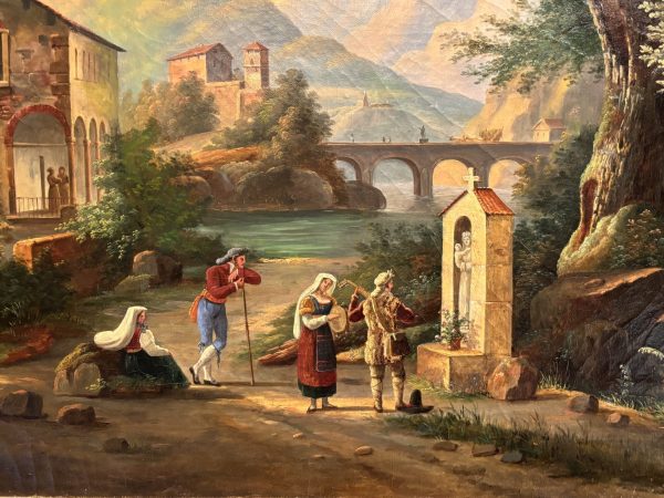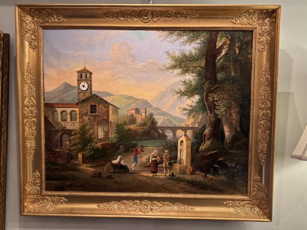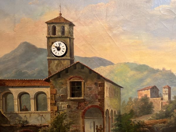 An early 19th century Italian musical clock painting indistinctly signed on the lower right corner. The painting is set in a period Empire gilt frame and depicts a bucolic mountain scene with a pair of musicians; one playing a mandolin or a lute and the another the tambourine. They are amid the company of a seated lady and a gentlemen resting on a cane in front of a niche of the Virgin Mary. The clock dial is housed in a church steeple. The twin barrel clock movement activates two separate gongs ringing the hours and quarters. The canvas has been relined.