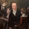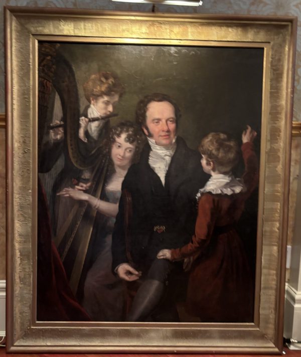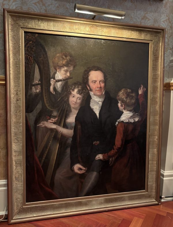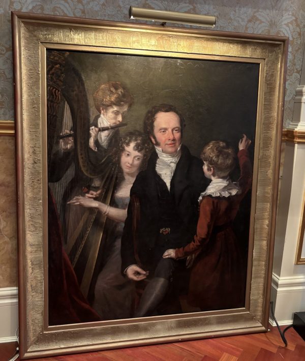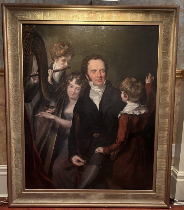 A large oil on canvas depicting a youthful father with his three children, two of which are behind him playing musical instruments, the daughter with her harp and son playing the flute. A third child with his back to the painter faces his father. The painting is presented in a carved and gilded wood frame. Like the great majority of Opie’s work, this painting is not signed or stamped.