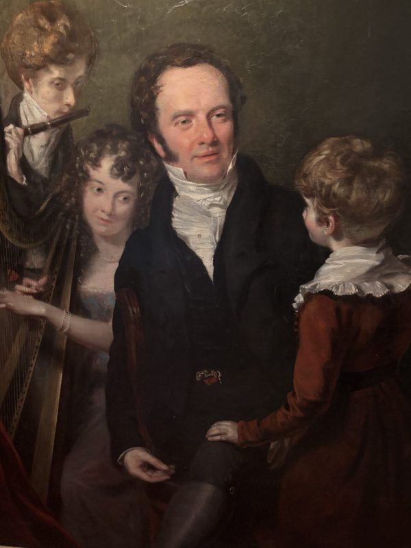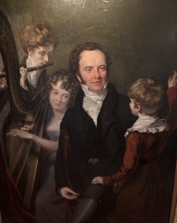 Opie lived at No 8 Berners Street where he moved in 1791, the street famous for artists, composers and instrument makers. Jacob Erat the famous harp maker lived in the neighbourhood and moved to 23 Berners Street before his death in 1821. This painting could be the painting referenced in John Jope Rogers, “Opie and his Work” Truro 1878, Page 220, entitled ‘Musical Party’.