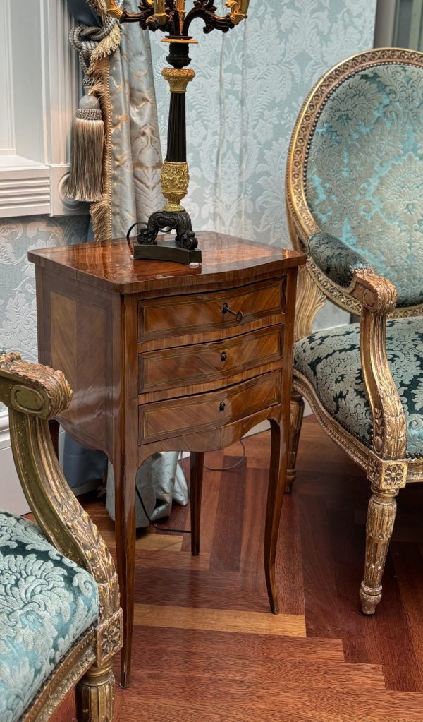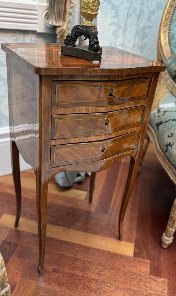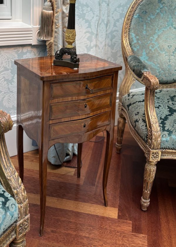 A late 18thC Louis XV three drawer chest veneered in kingwood, rosewood and pear wood; the top section sits on four scrolled legs; France circa 1780.