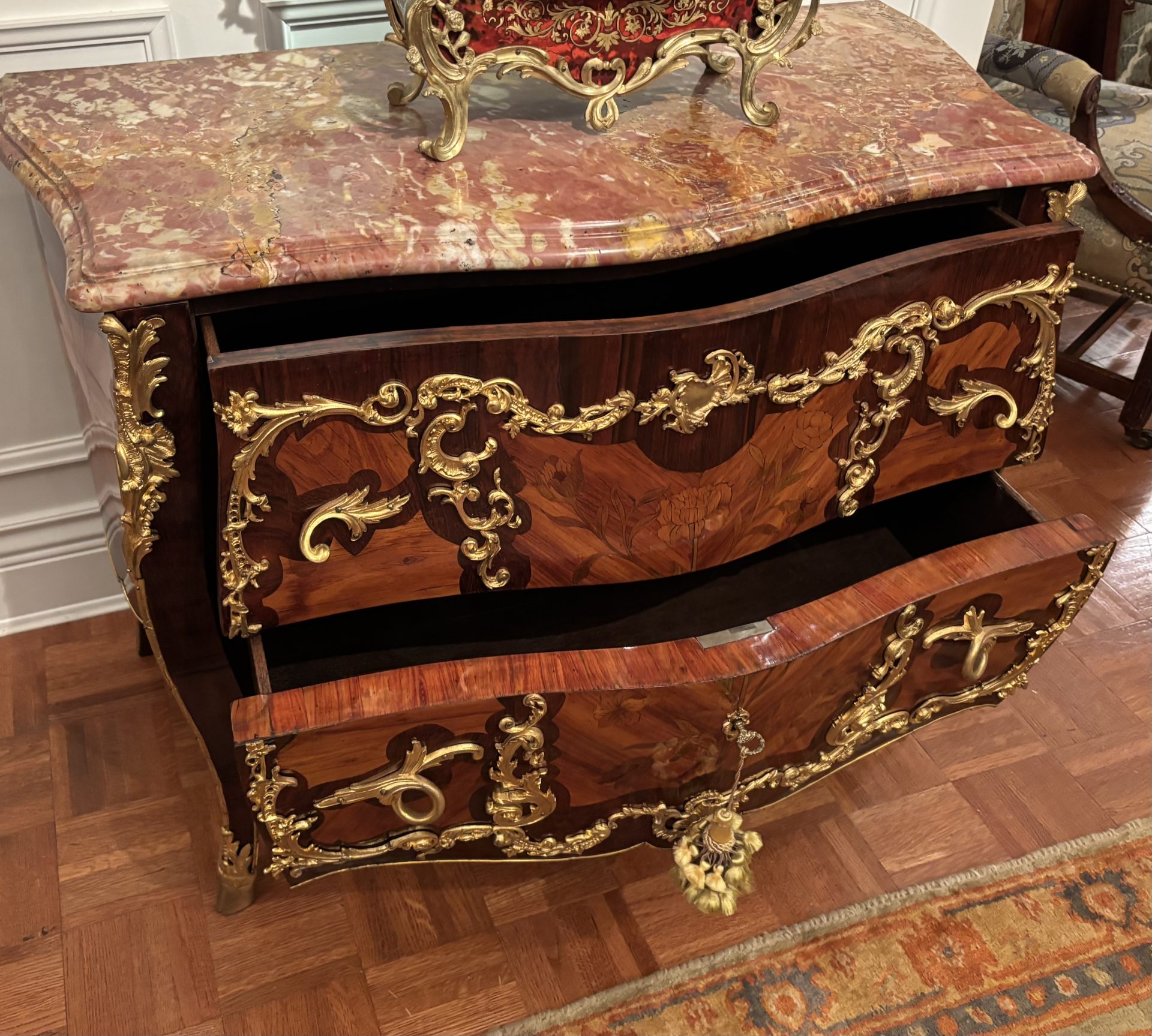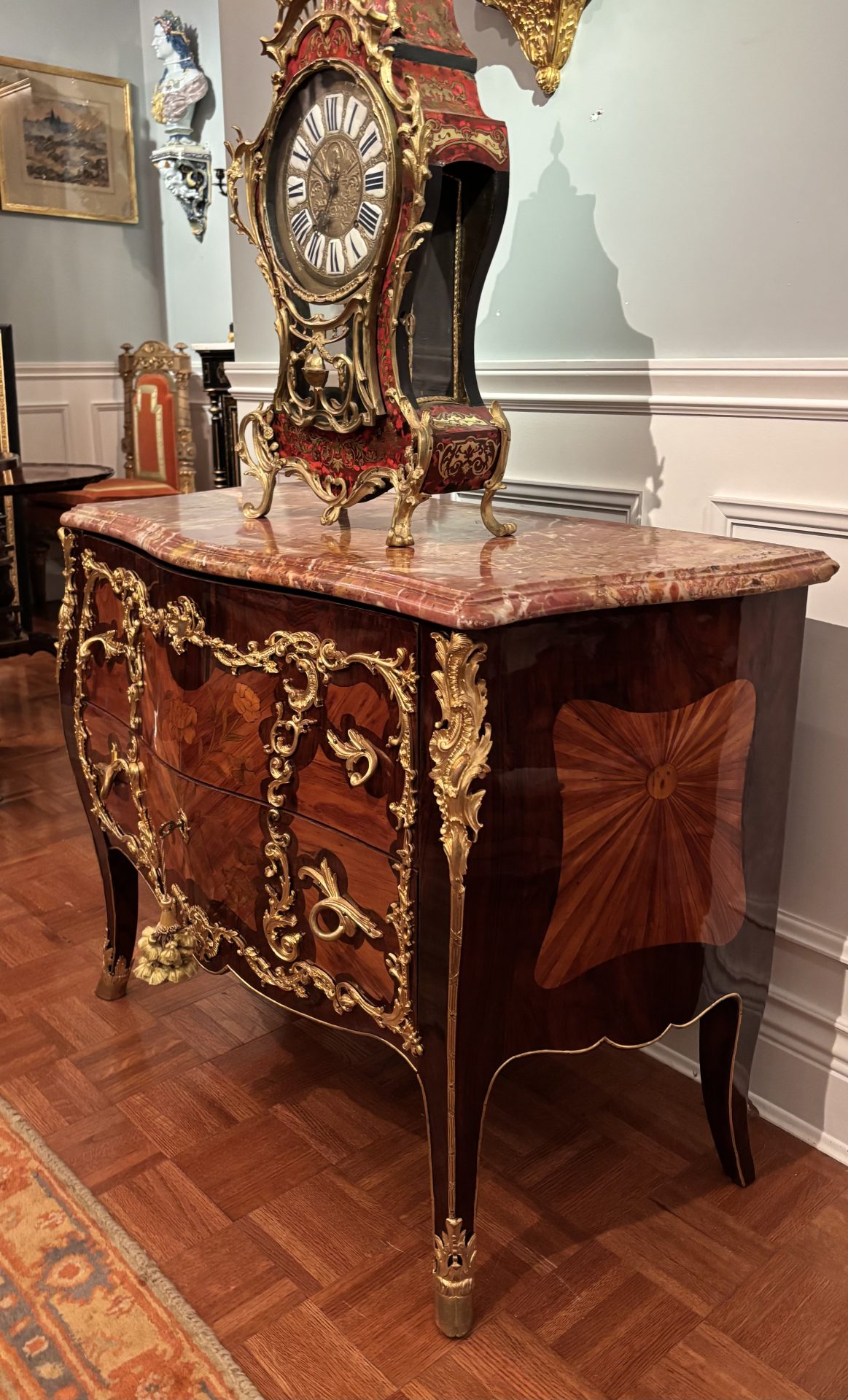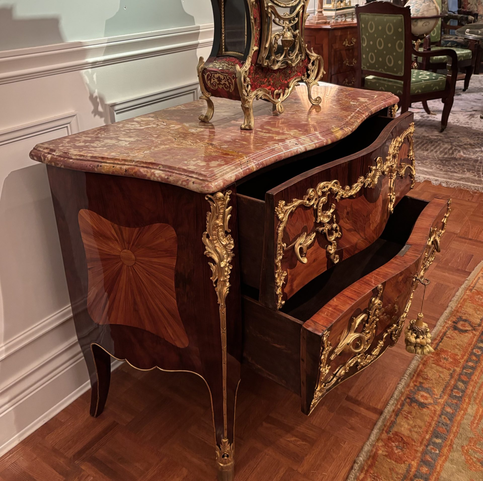 A very fine example of Louis XV style furniture made in the late 19thC in Paris. The oak carcass is veneered in kingwood and amaranth and inlaid with floral designs on the front. There is an inlaid radiating pattern of kingwood framed in amaranth on both sides of the chest. There are two long drawers below a shaped bresch d’alep marble top; the front of the chest is lavishly covered in fine ‘rococo’ style gilded bronze mounts including the drawer handles and the sabots on the curved front legs. Made in France circa 1880.