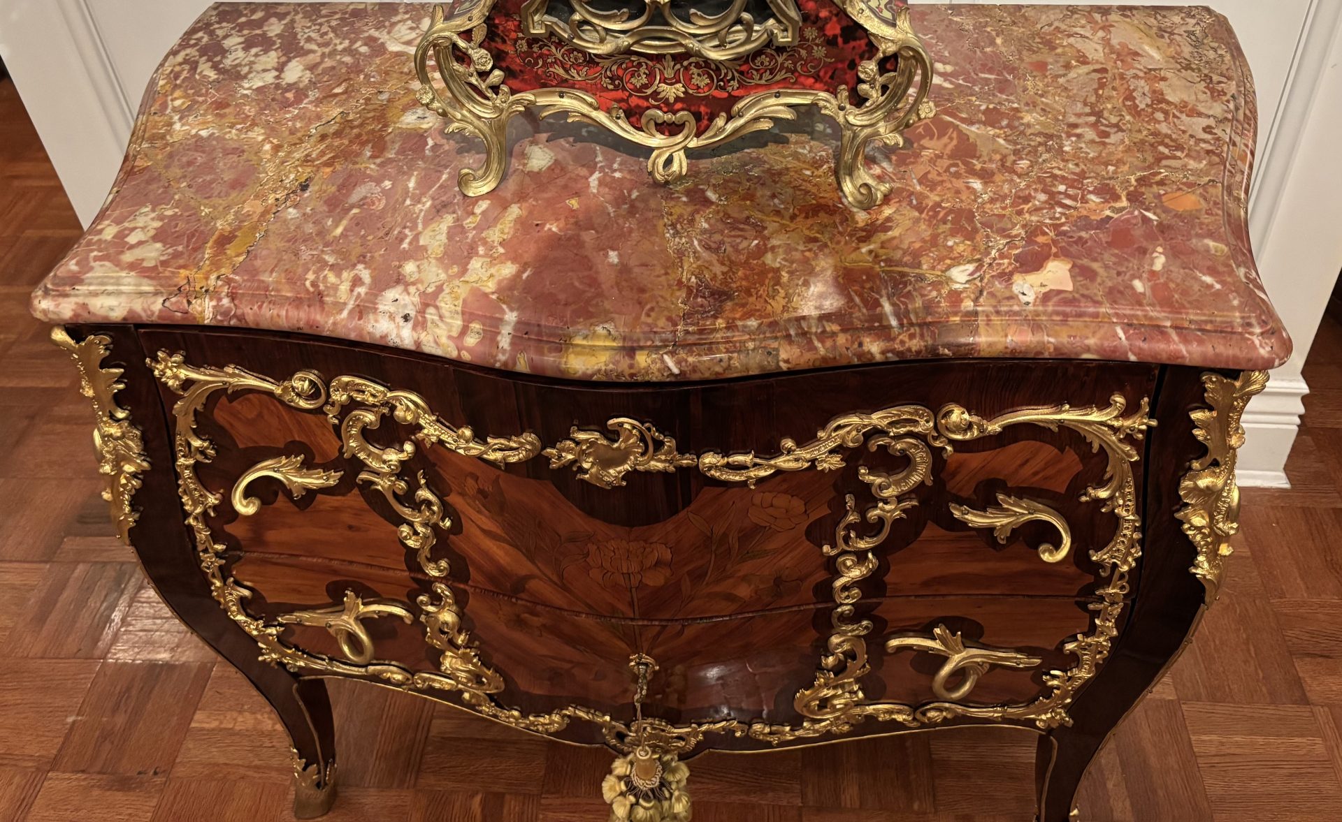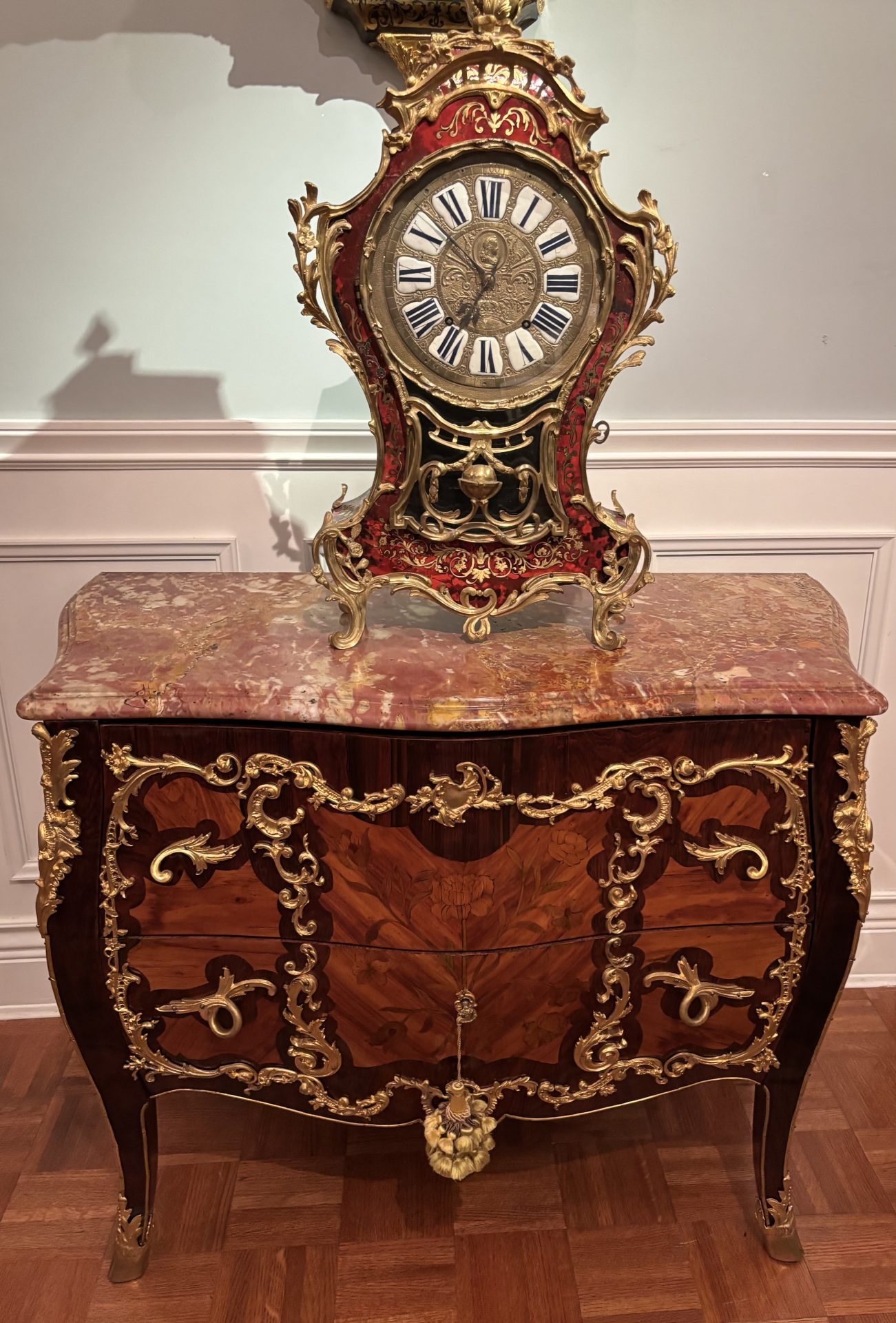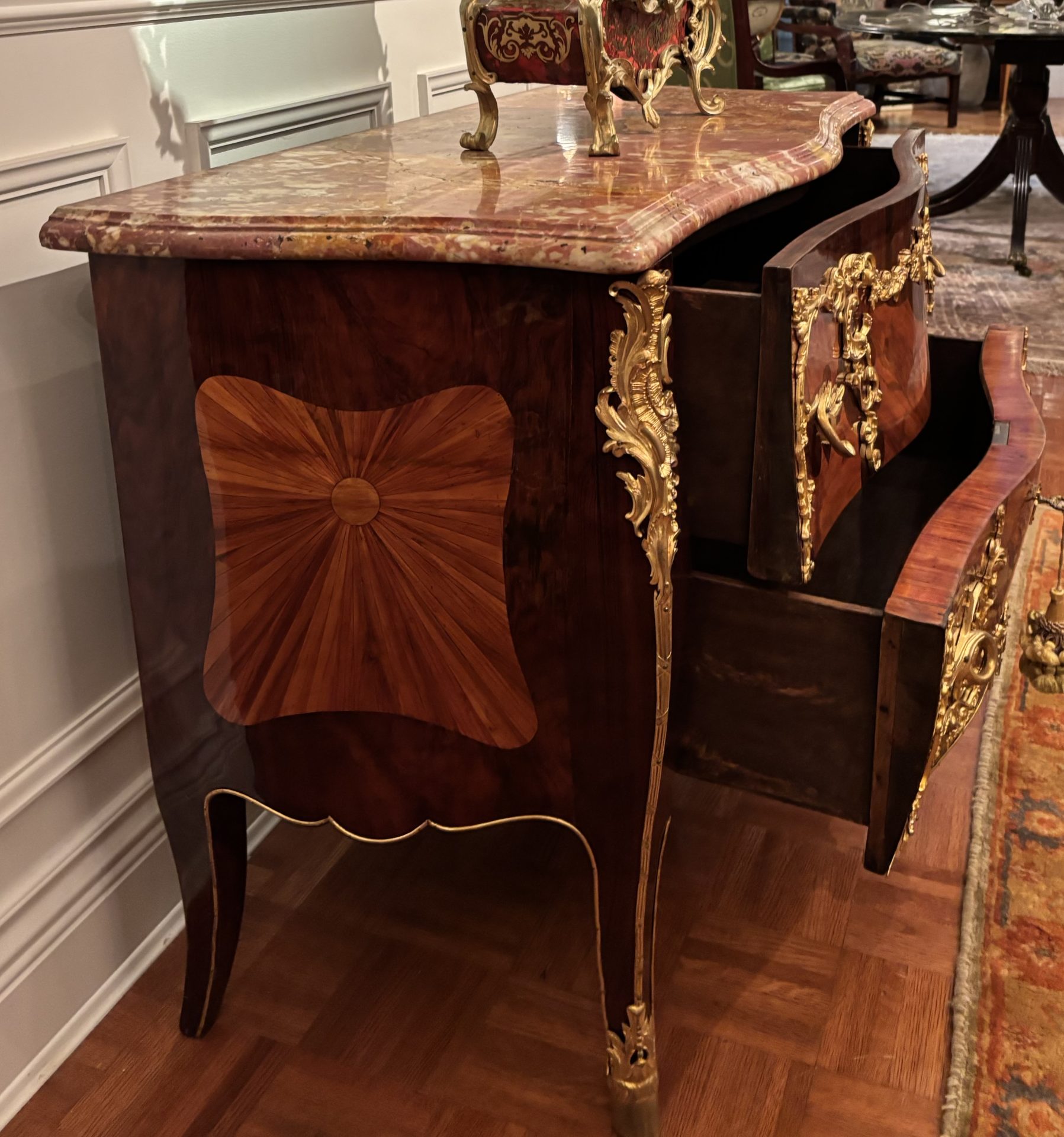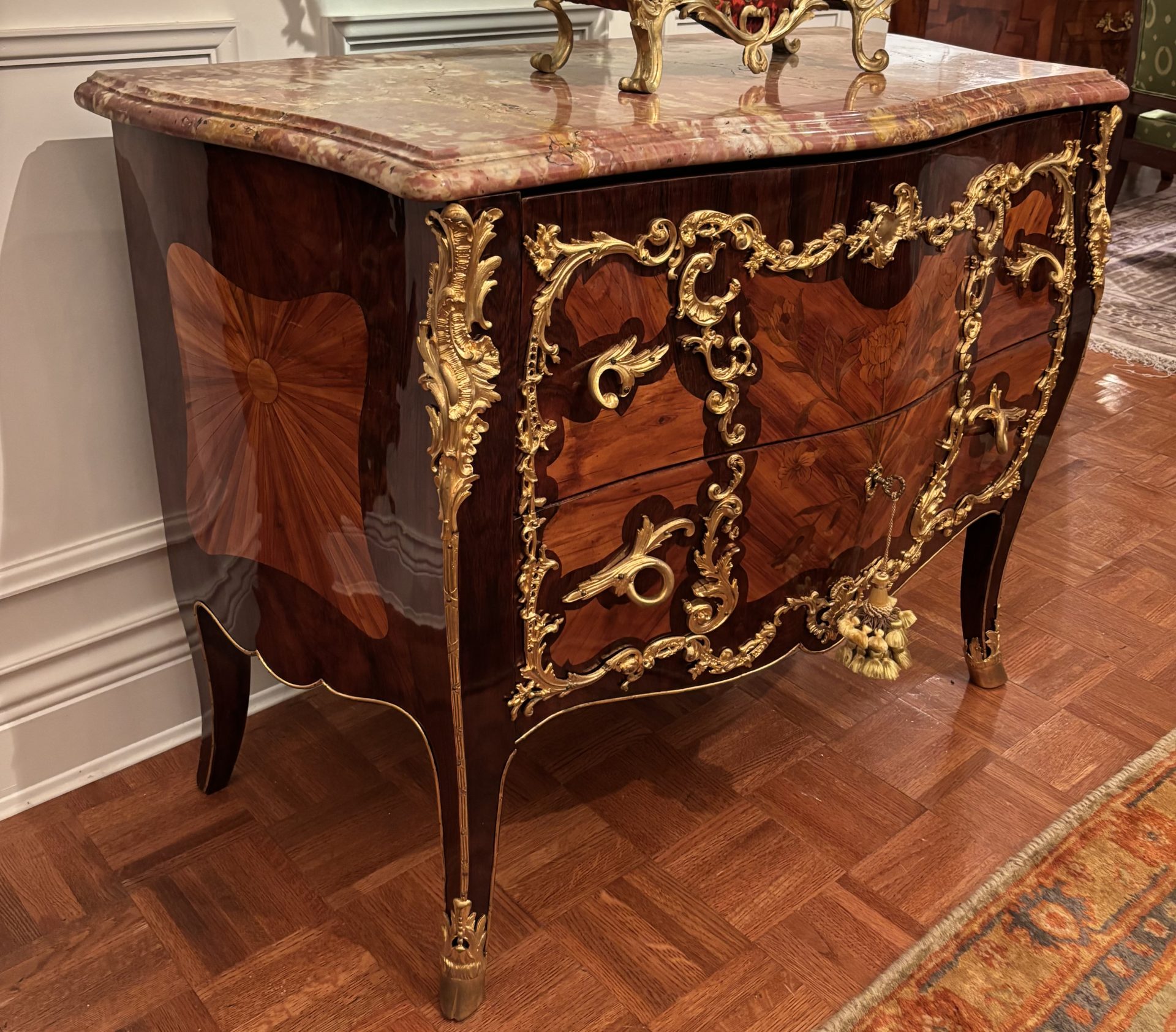 A very fine example of Louis XV style furniture made in the late 19thC in Paris. The oak carcass is veneered in kingwood and amaranth and inlaid with floral designs on the front. There is an inlaid radiating pattern of kingwood framed in amaranth on both sides of the chest. There are two long drawers below a shaped bresch d’alep marble top; the front of the chest is lavishly covered in fine ‘rococo’ style gilded bronze mounts including the drawer handles and the sabots on the curved front legs. Made in France circa 1880.