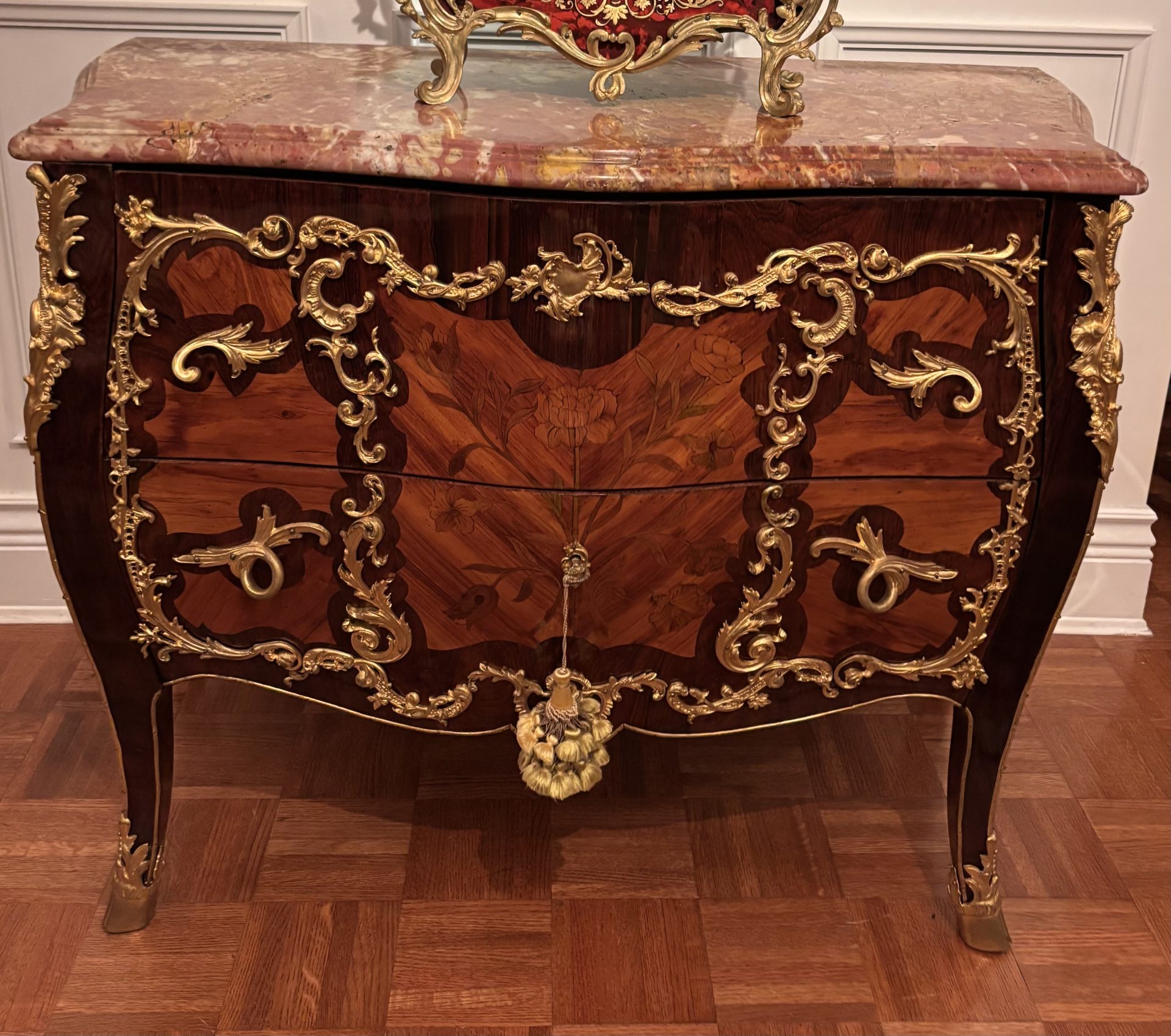 Louis XV Style Marquetry and Ormolu Mounted Bombe Chest Of Drawers