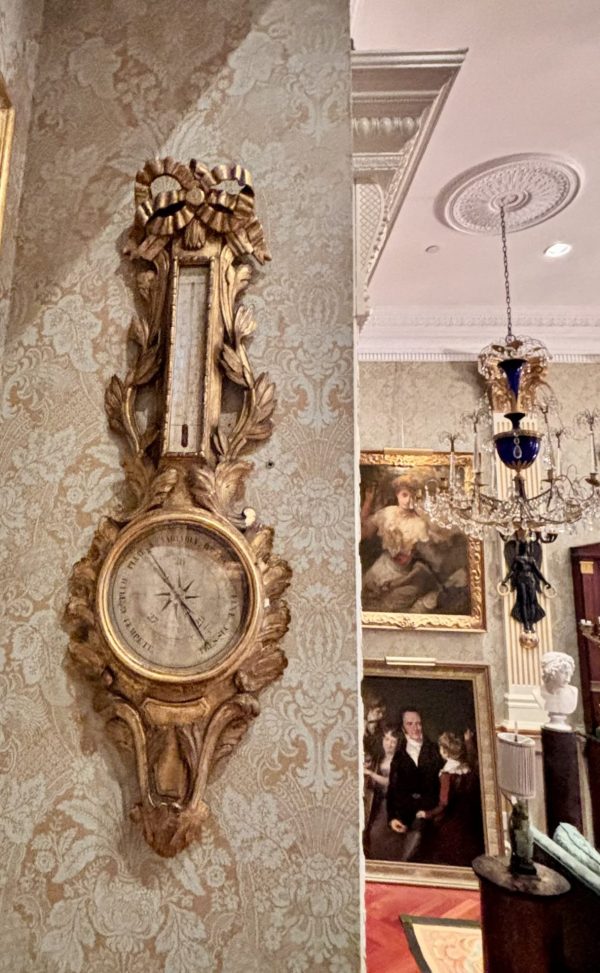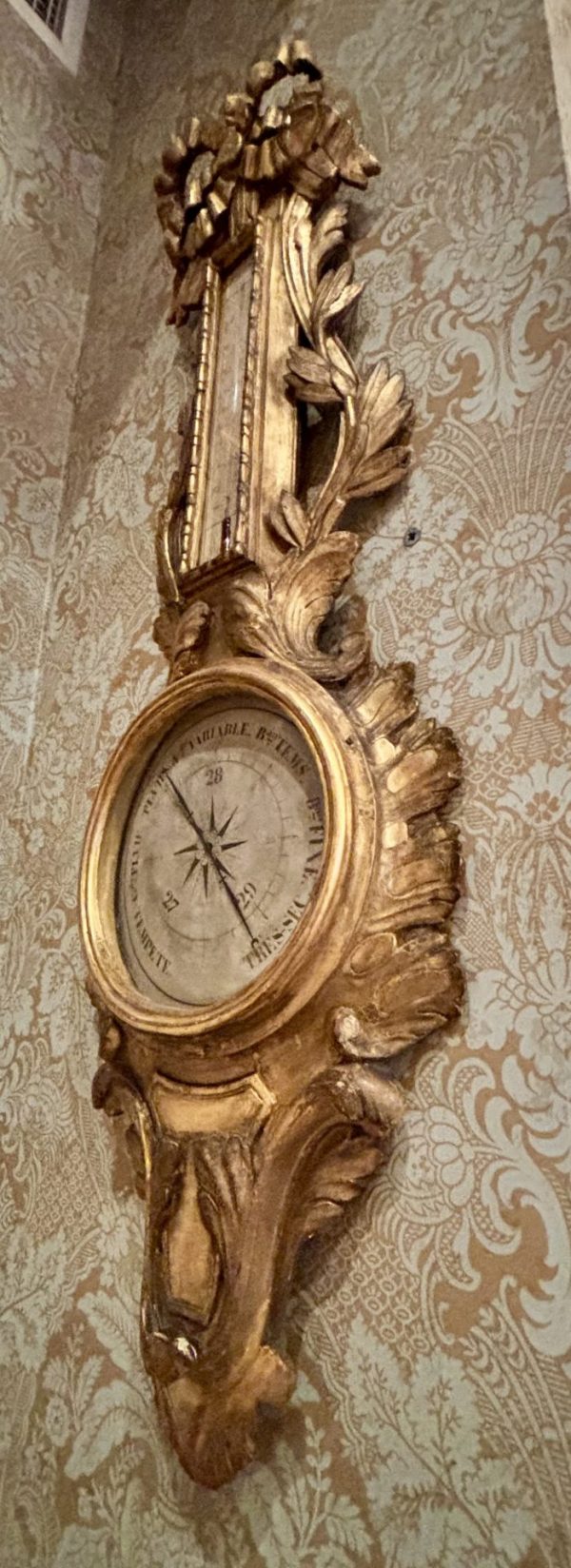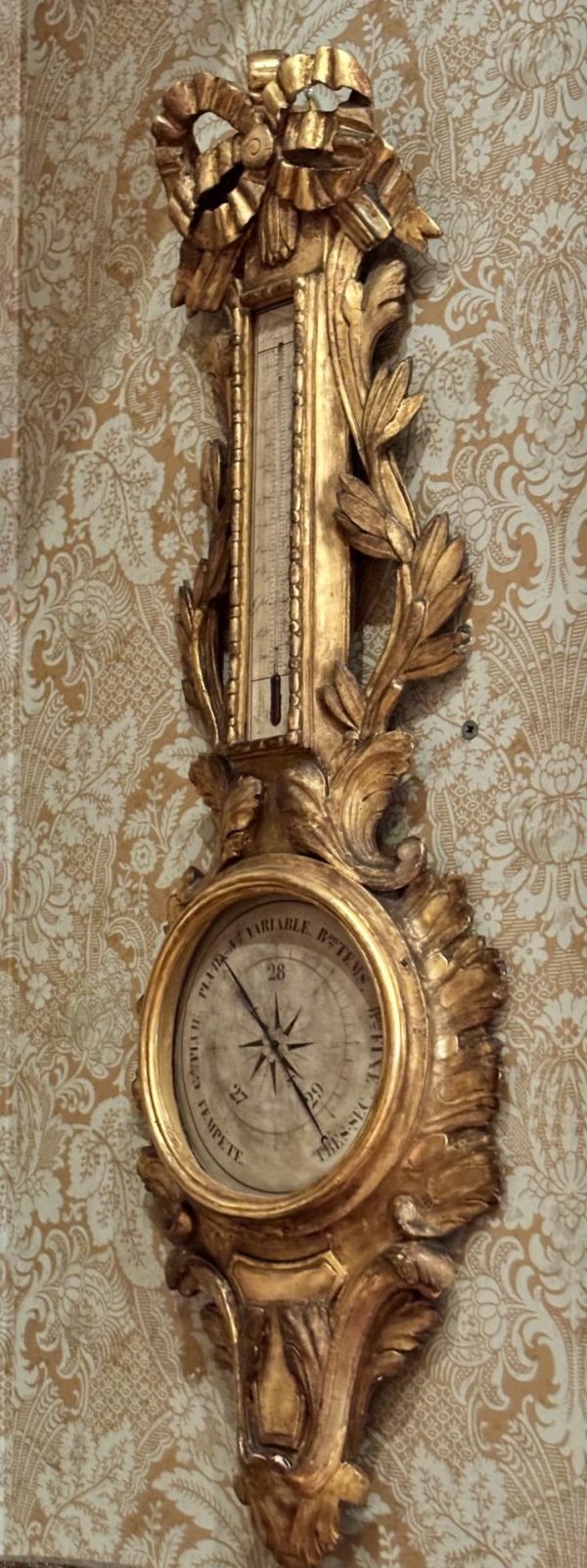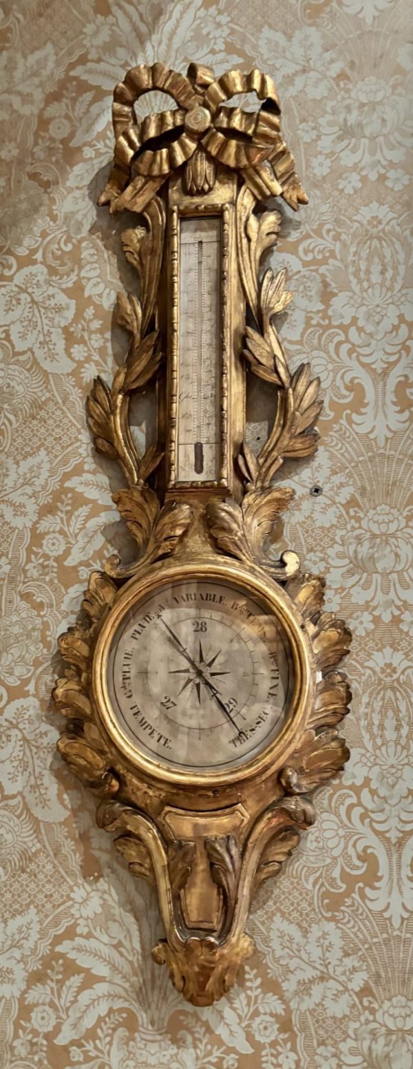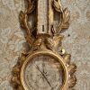 Carved and gilded wood Louis XVI barometer having its original mercury tube and mechanism but presently with glass missing