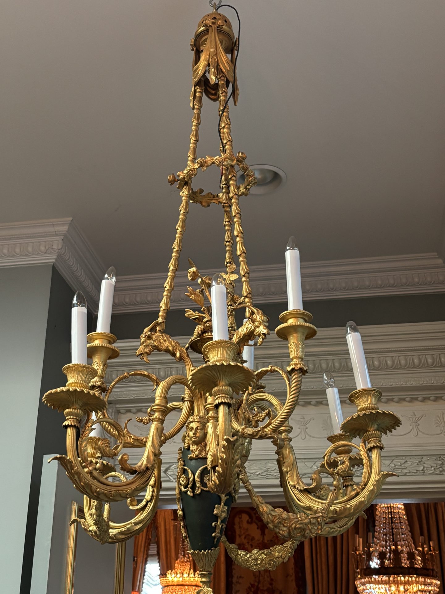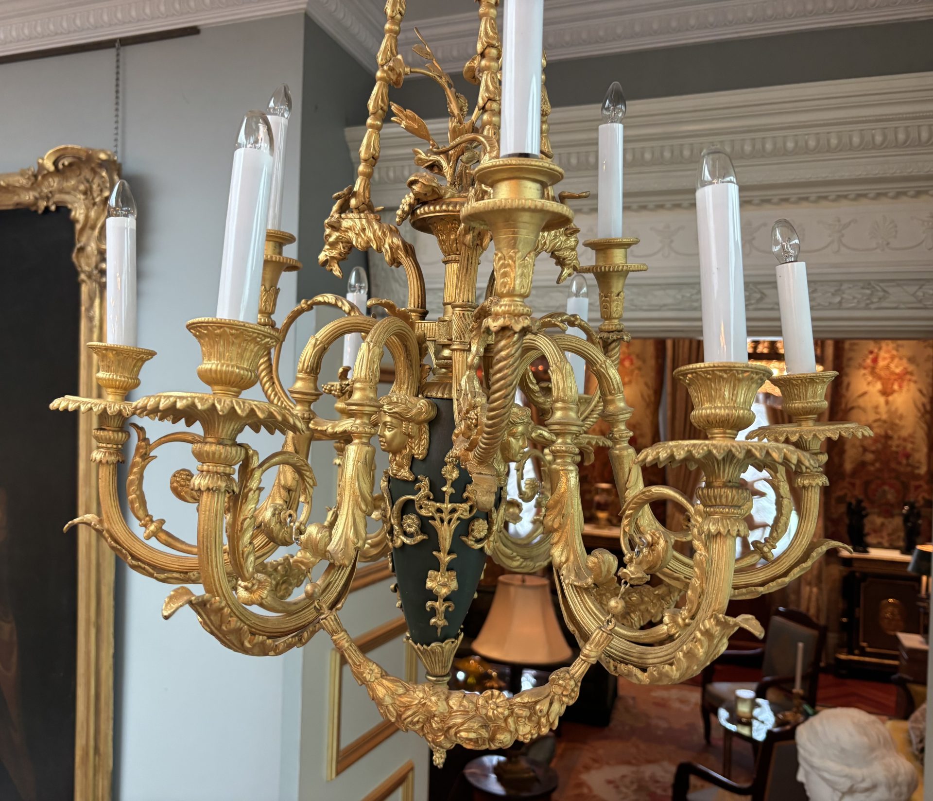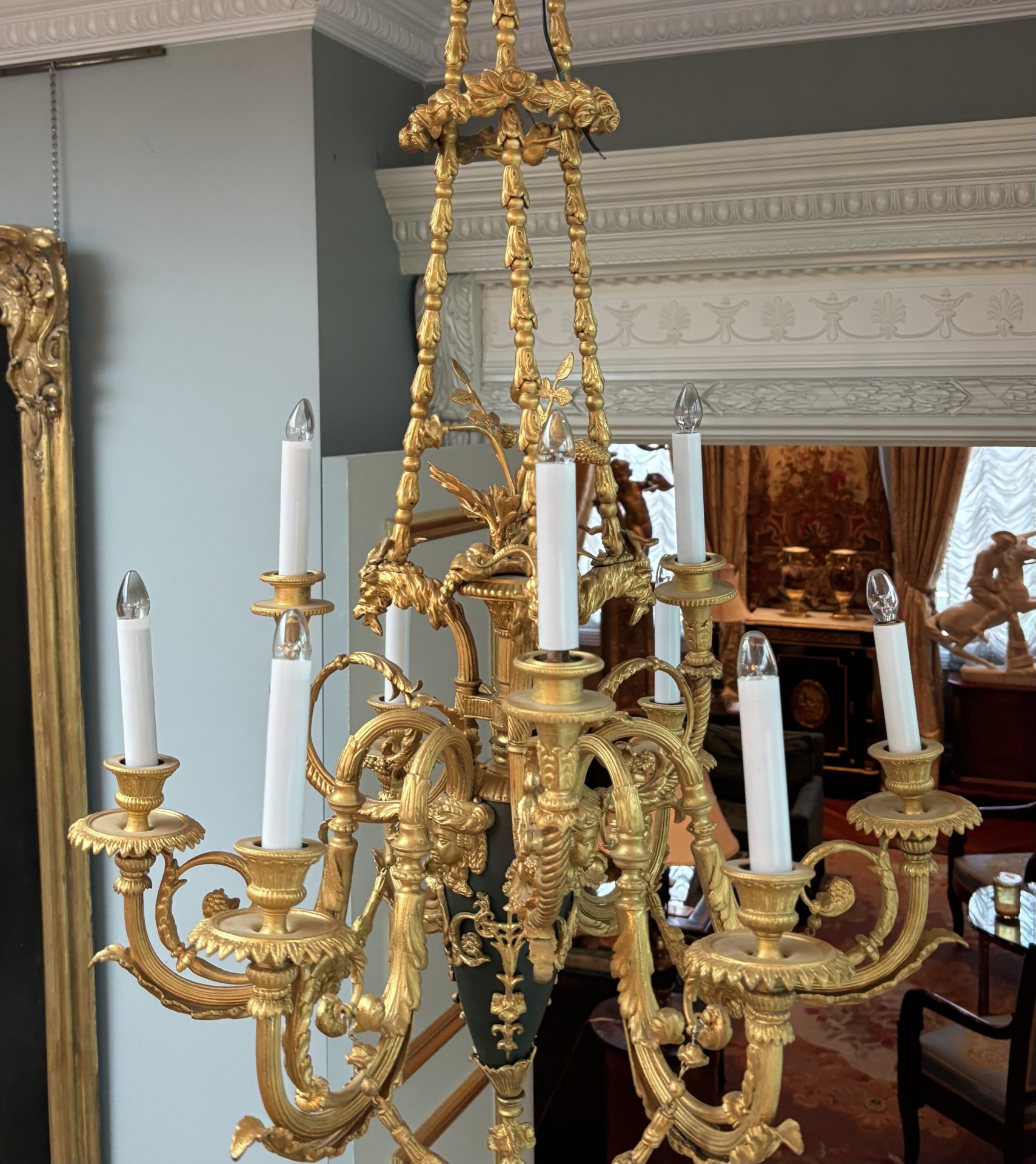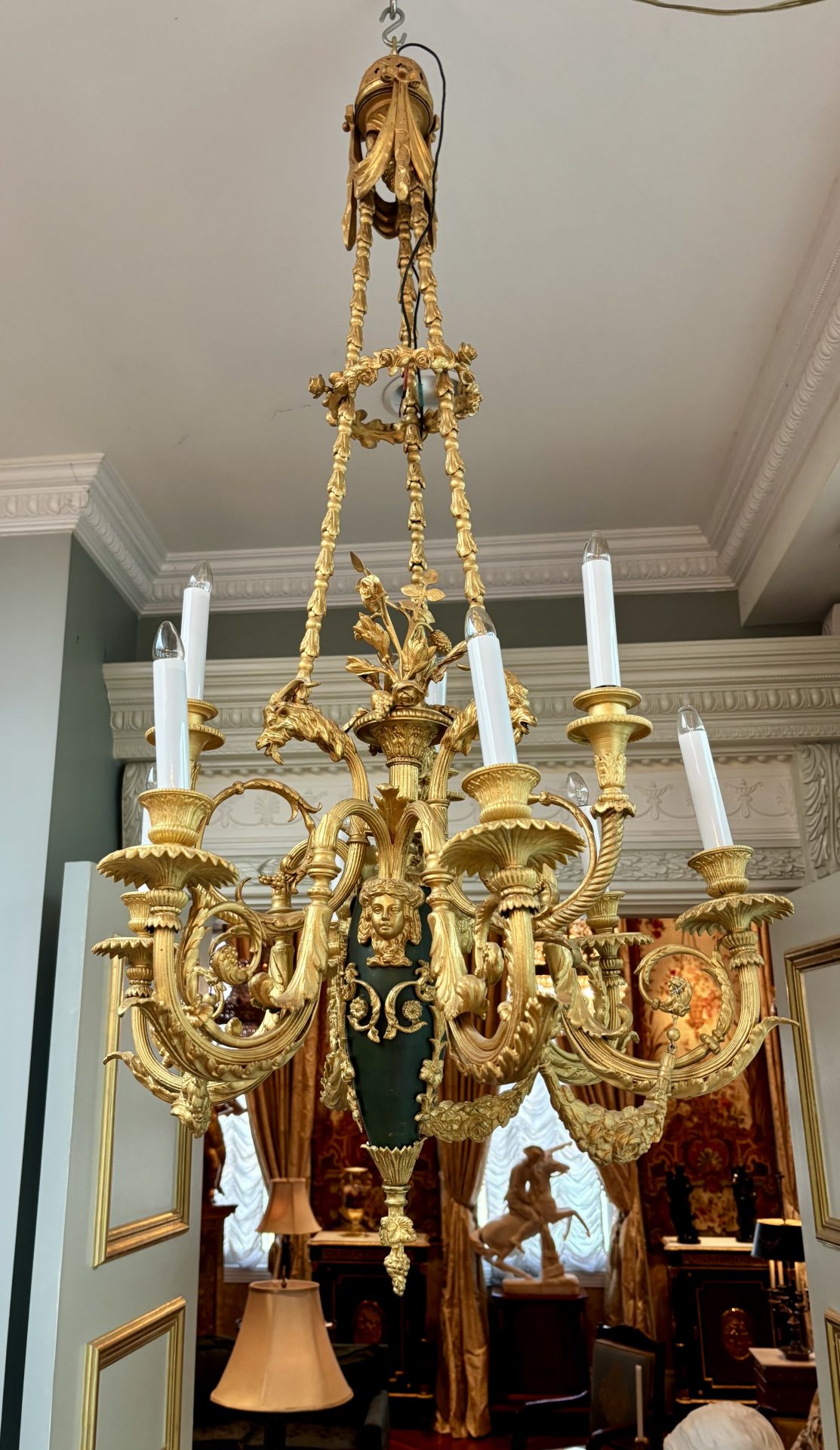 The chandelier hangs from three gilded bronze decorated chains connecting three ‘large’ gilded goat’s heads, a band of flowers near the top rings the three chains. The three goat’s heads support an ovoid shaped patinated and gilded bronze ‘urn’ from which a gilded basked and gilded flower sprays germinate from the top. The urn supports six lower scrolling candle arms, each pair joined with a gilded swag, and between each pair of arms are three higher scrolling arms. The top of the urn is also decorated with gilt bronze heads of maidens. The combination of the patinated bronze urn and the rest of the gilded bronze is very effective. French circa 1920.