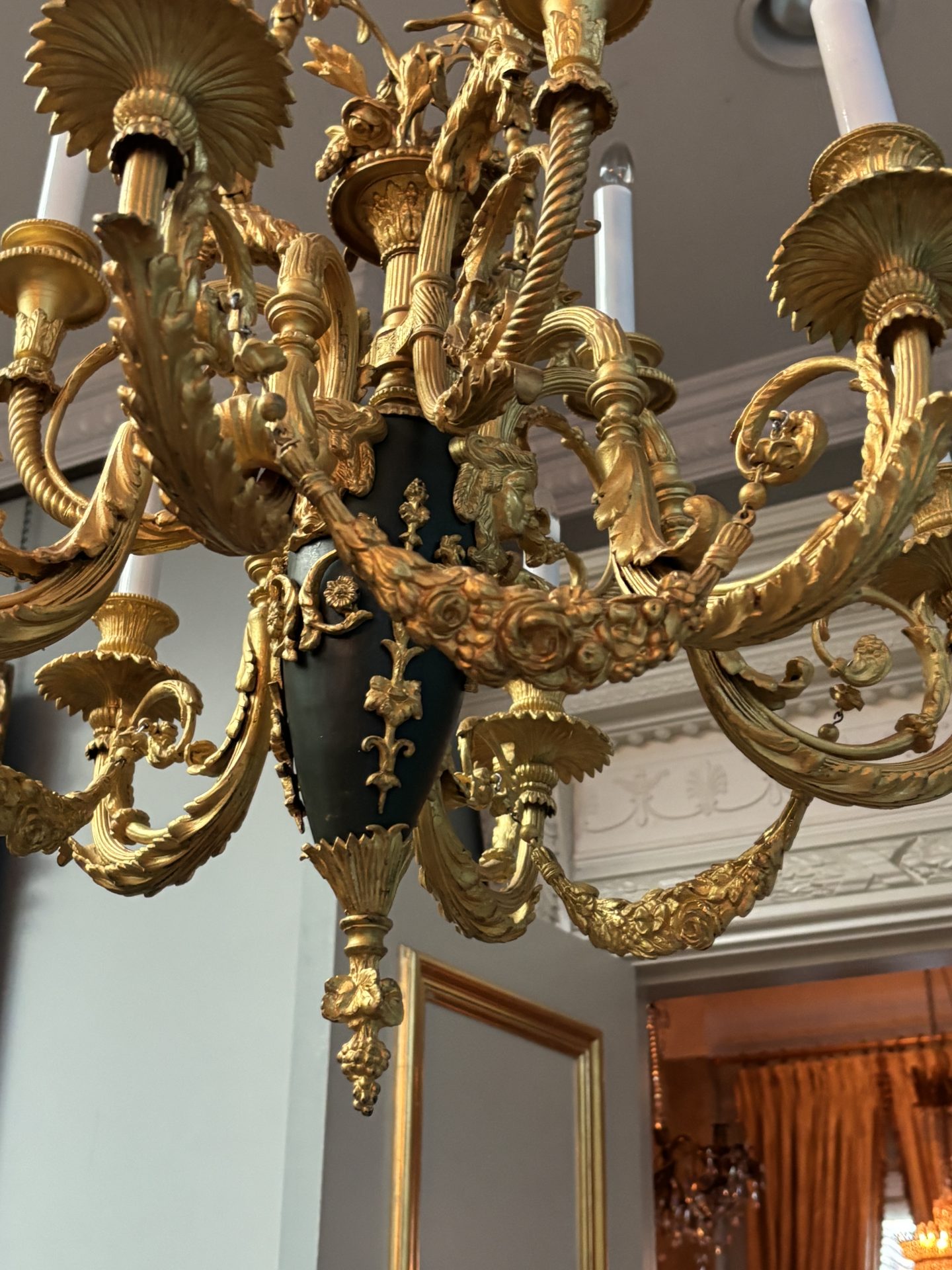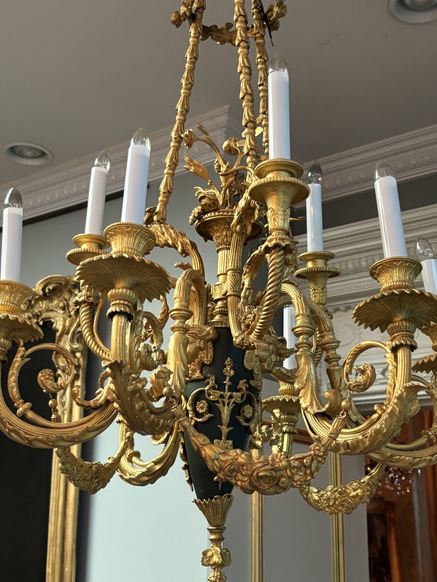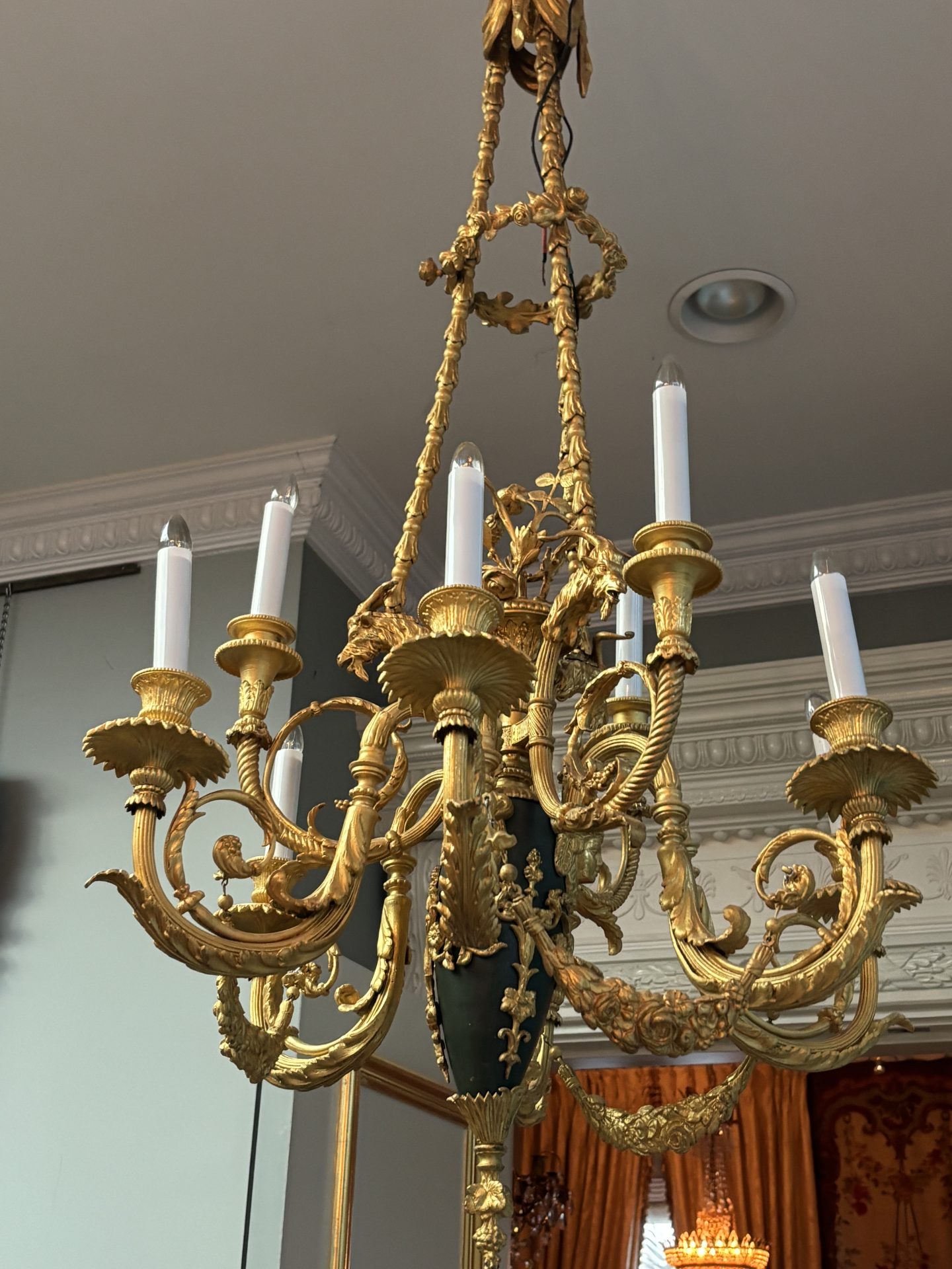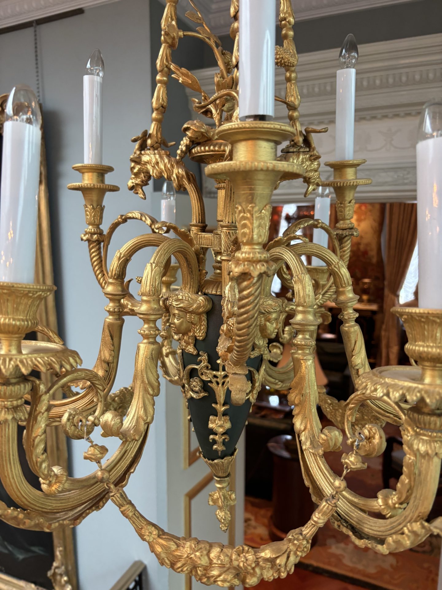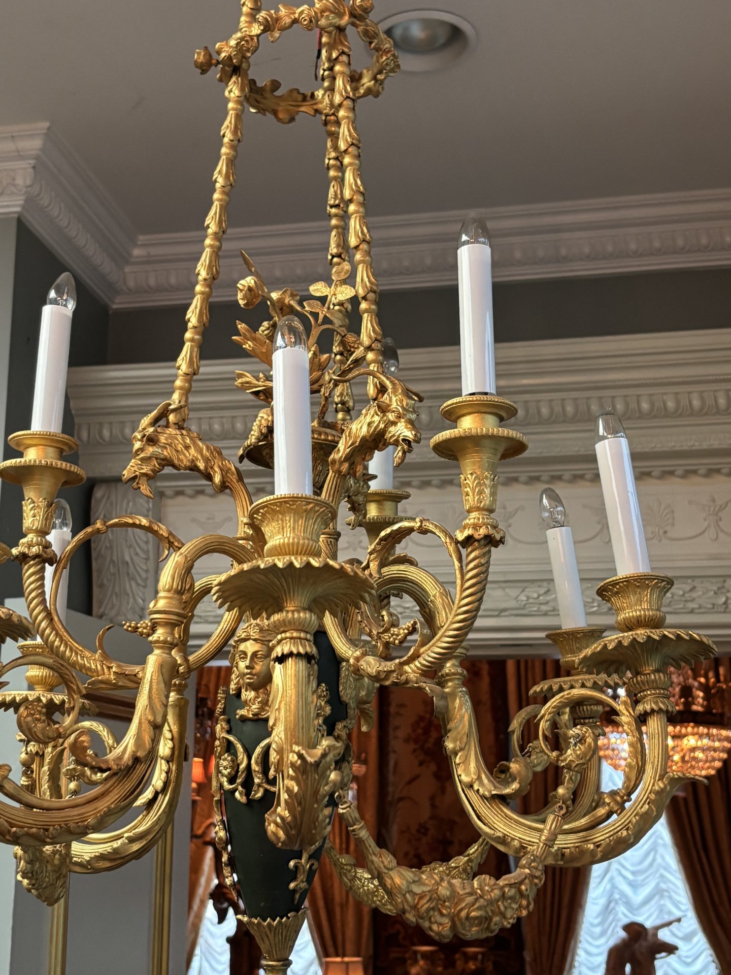 The chandelier hangs from three gilded bronze decorated chains connecting three ‘large’ gilded goat’s heads, a band of flowers near the top rings the three chains. The three goat’s heads support an ovoid shaped patinated and gilded bronze ‘urn’ from which a gilded basked and gilded flower sprays germinate from the top. The urn supports six lower scrolling candle arms, each pair joined with a gilded swag, and between each pair of arms are three higher scrolling arms. The top of the urn is also decorated with gilt bronze heads of maidens. The combination of the patinated bronze urn and the rest of the gilded bronze is very effective. French circa 1920.