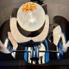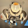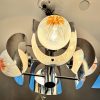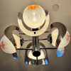 An Italian mid century Murano art glass four light chandelier designed by Mazzega, chromed metal rod base radiating chrome arms holding mottled frosted amber and clear glass orbs and curved chrome shades .