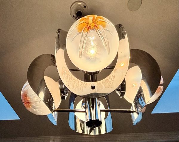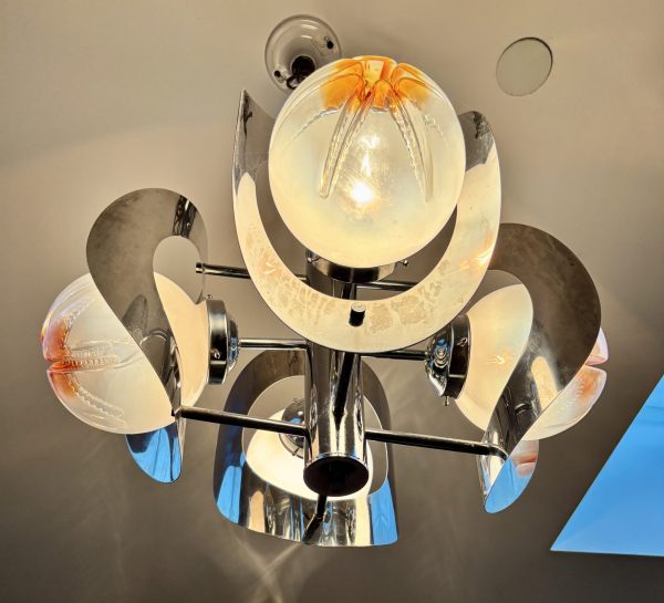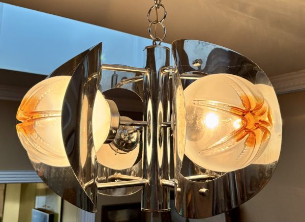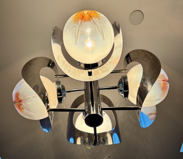 An Italian mid century Murano art glass four light chandelier designed by Mazzega, chromed metal rod base radiating chrome arms holding mottled frosted amber and clear glass orbs and curved chrome shades .