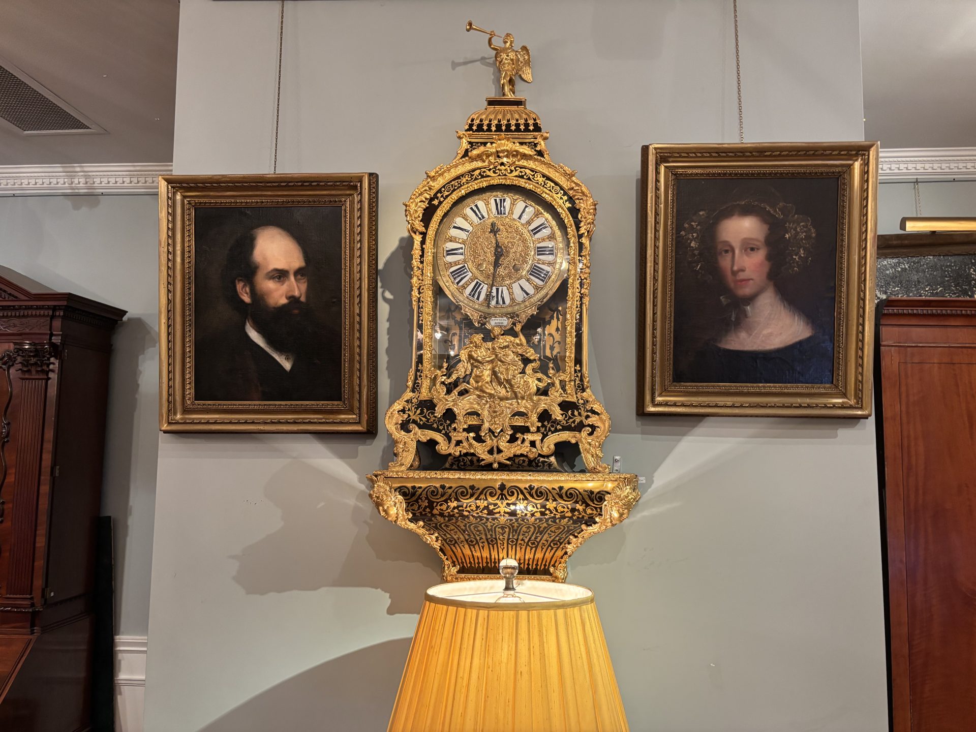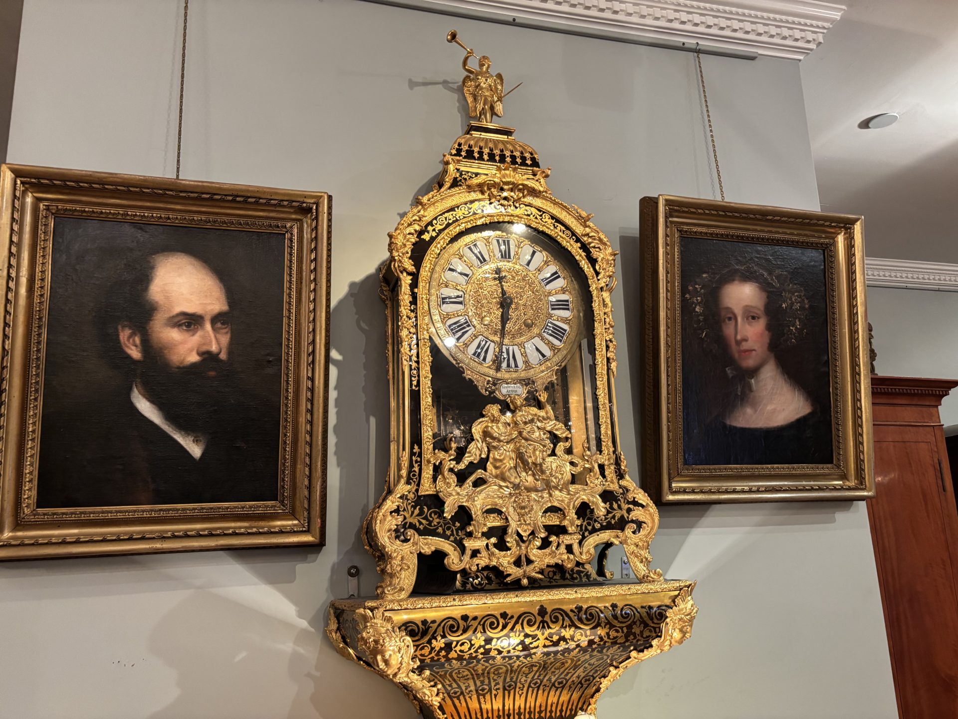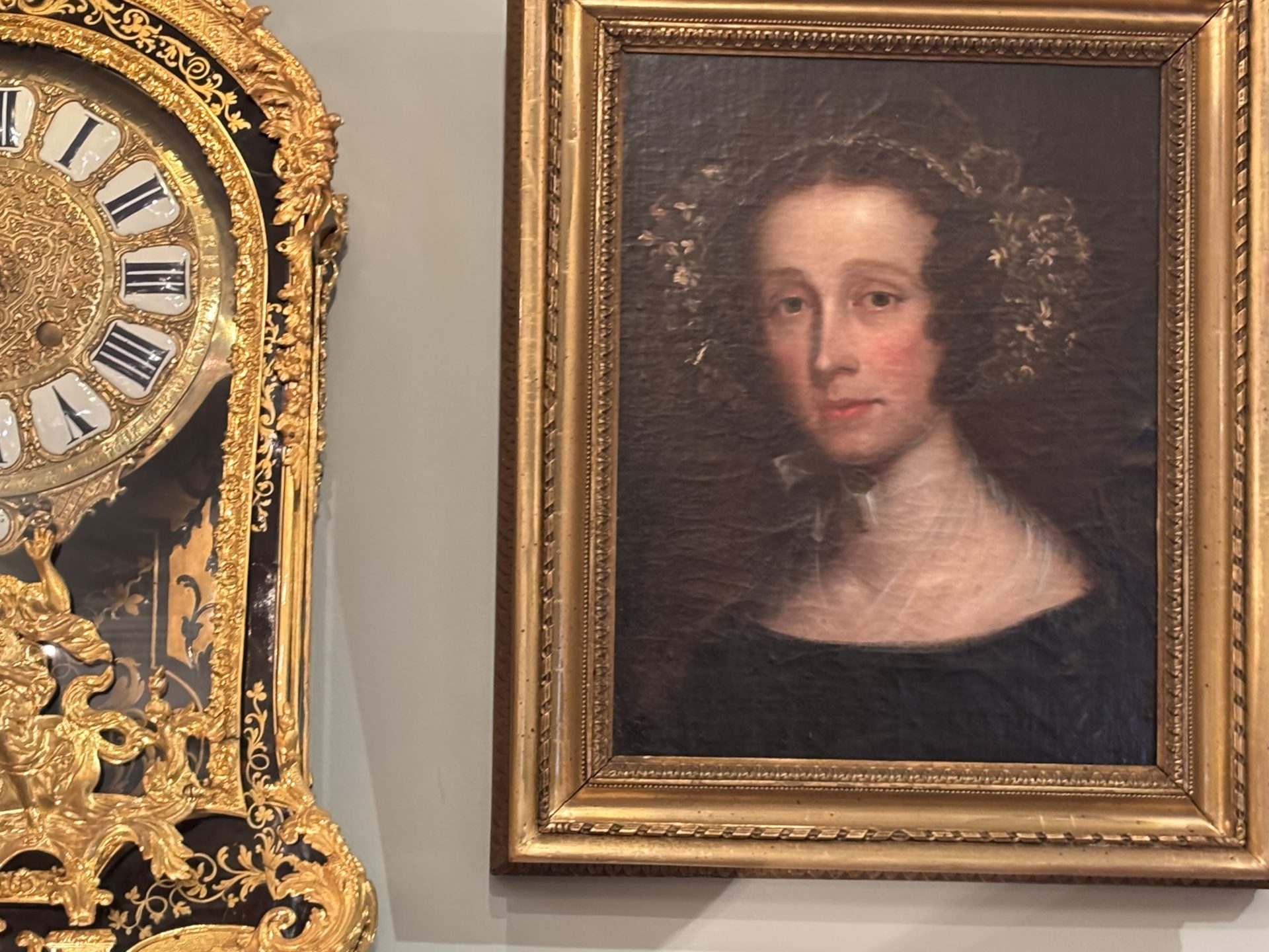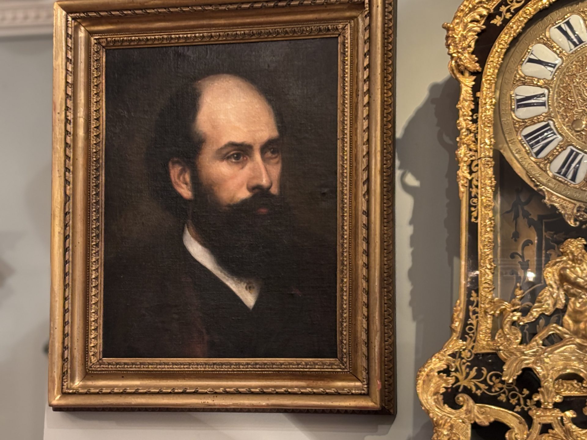 Pair of beautifully painted oil portraits of a mid-Victorian English couple. Portrayed from the chest up, the lady looks directly at the painter, showing an elaborate hair style woven with bunches of flowers on each side and held in place with silk ribbons around her neck. The rather stern looking husband is formally dressed, facing to his left and is shown with his dark groomed mustache and beard below a receding hairline. Both portraits are displayed in gold carved wood frames. They are unsigned. English circa 1875.