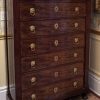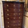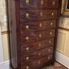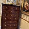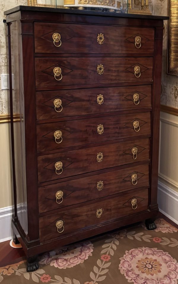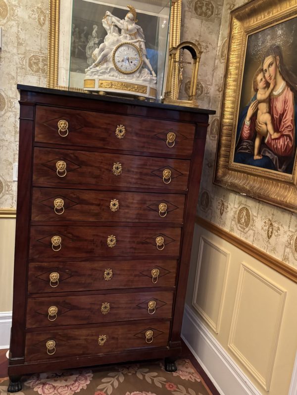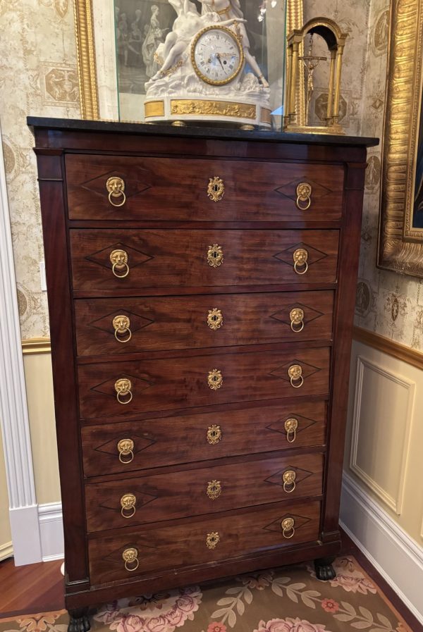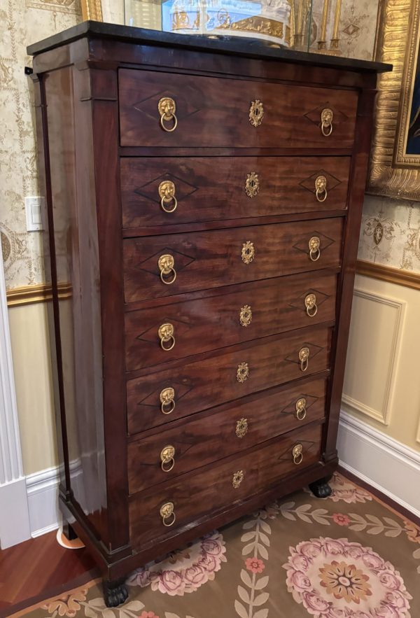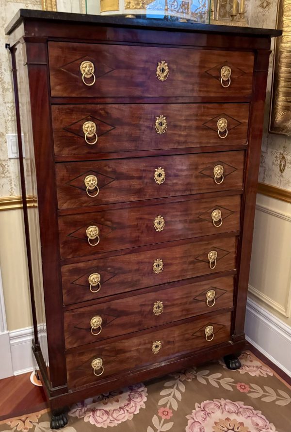 A classic early French Empire semainier in mahogany; each of the seven drawers ( intended to be used one for each day of the week), has ebony inlay around each of the gilded lion’s mask door pulls, and a fine gilded escutcheon around the key hole; the chest has it’s original ‘clover’ key, as well as it’s grey fossil marble top; the whole resting on front faux painted bronze lion’s paw feet.