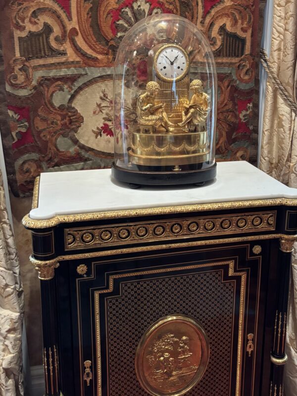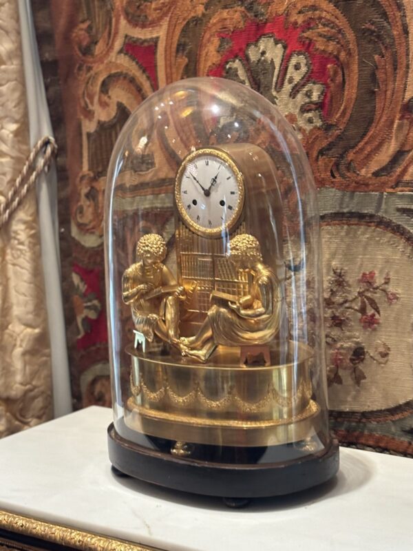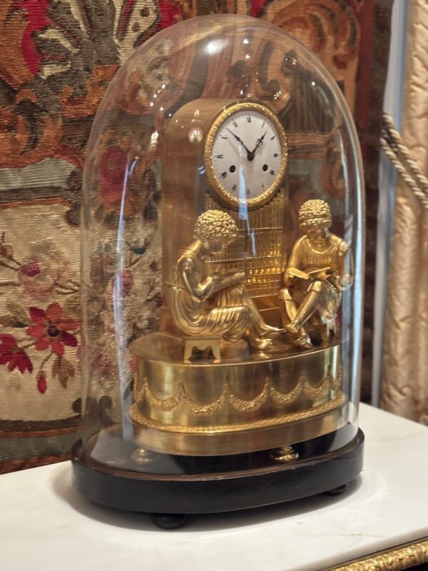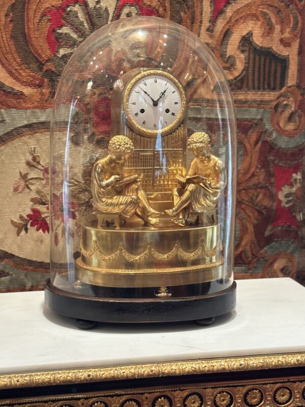 A fine and rare French Empire clock in gilded bronze called The Library, featuring a boy and a girl dressed in classical attire diligently studying in a library, both are sitting on a stool in front of a clock which is integrated into a column which also serves as a bookshelf. The oval clock base is decorated with garlands. The white enamel dial has Roman numerals; the silk string movement rings the hours and halves on a bell. A similar example is in the Palazzo Reale De el Pardo in Madrid, (Ref. French Bronze Clocks by Elke Niehuser, page 184).