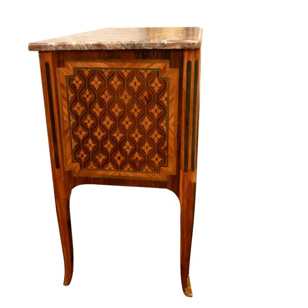 French 18 Century Louis XVI Transitional Marble Topped Marquetry Commode
