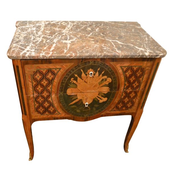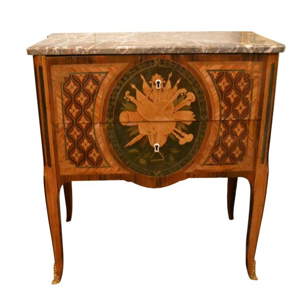 A period 18thC French two drawer chest circa 1780. The oak carcass veneered in various exotic woods in an overall geometric design. The large inlaid oval panel to the front shows various musical instruments in a heraldic fashion. Both drawers have ivory escutcheons. The cabinet is stamped JME for (jurande des menuisiers-ébénistes). To date no stamped makers name has been found on the piece.